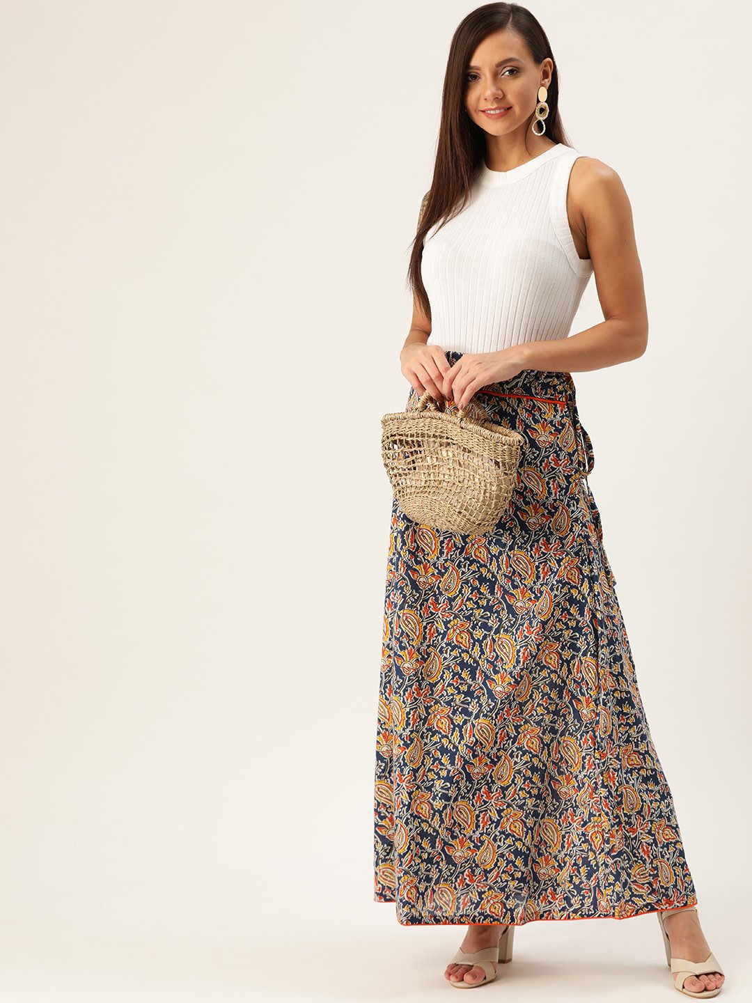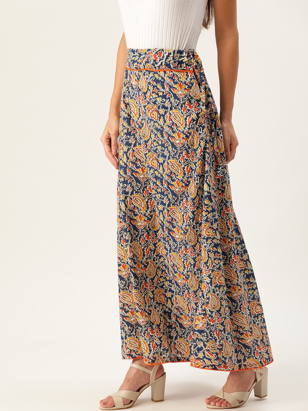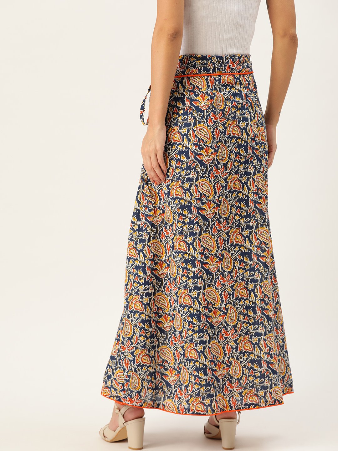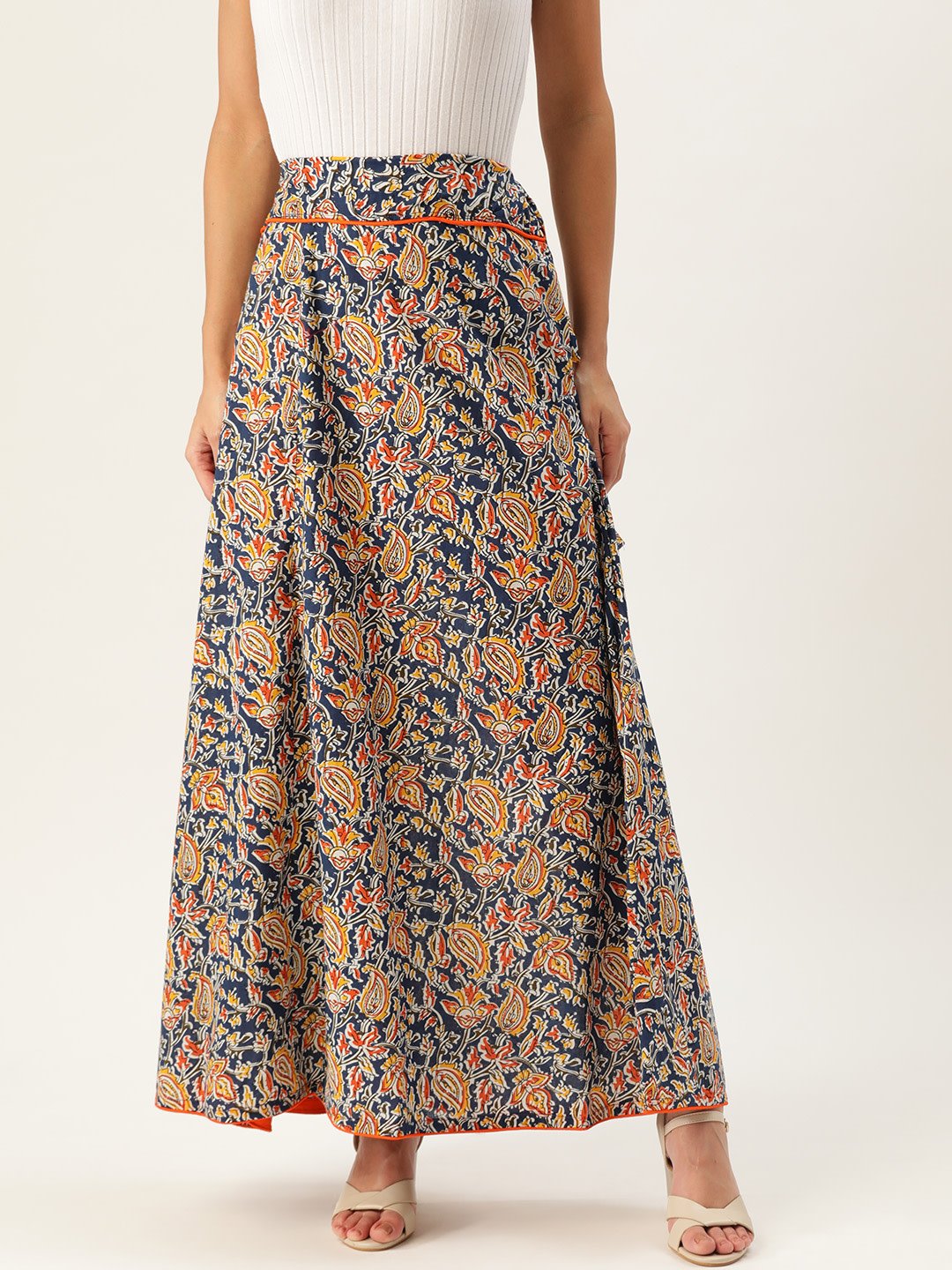 Display your heavy inclination towards Indian artistry by buying this blue Kalamkari skirt. Wear it white Chikankari top and ballerina sandals.
