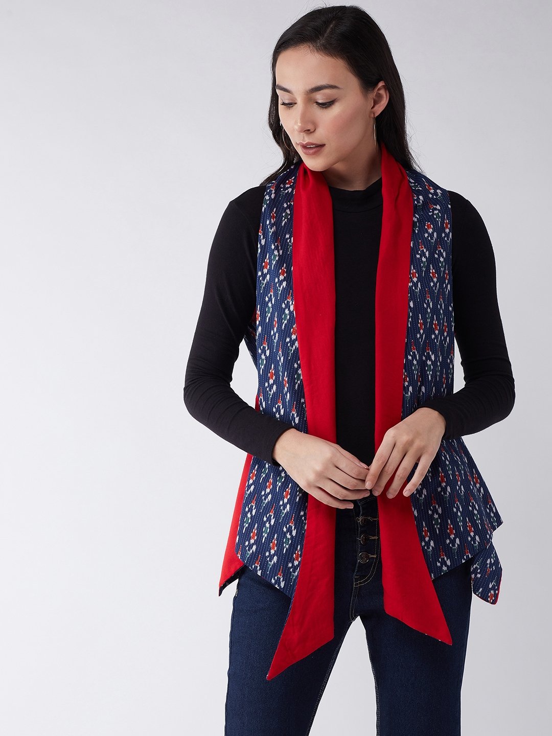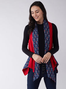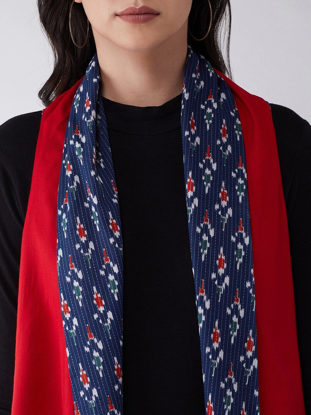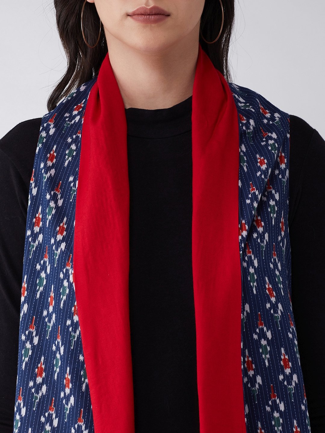 Add a contemporary flair to your shrug collection with this blue kantha Ikkat reversible shrug. You can layer it over a casual tee and skinny jeans.