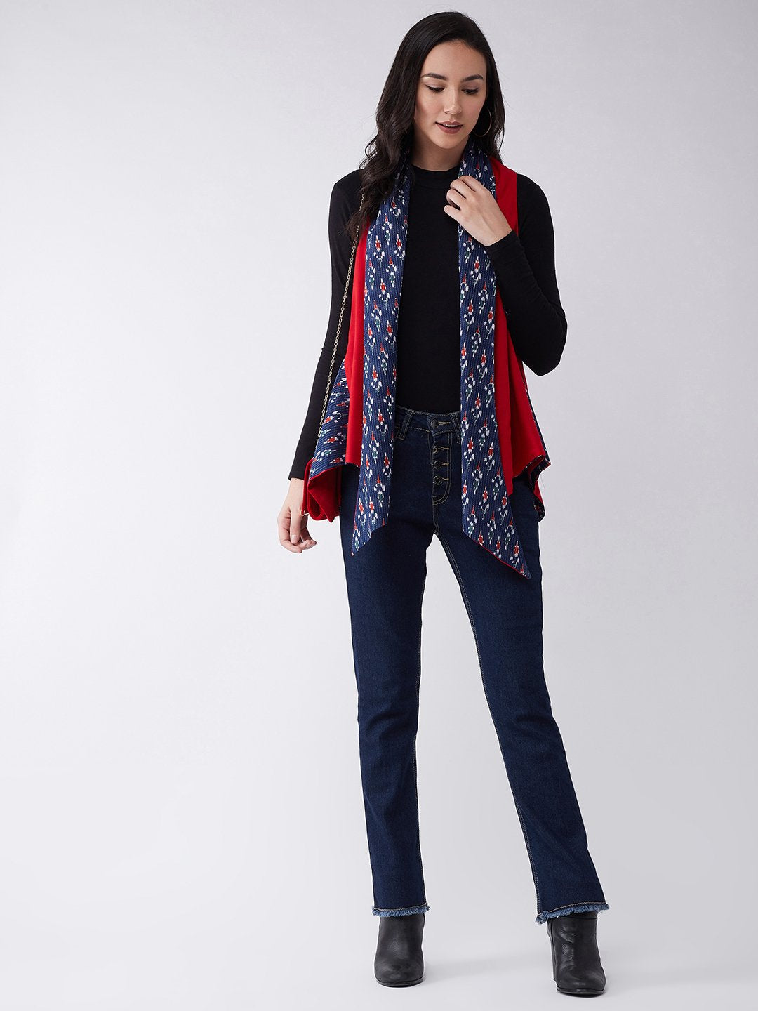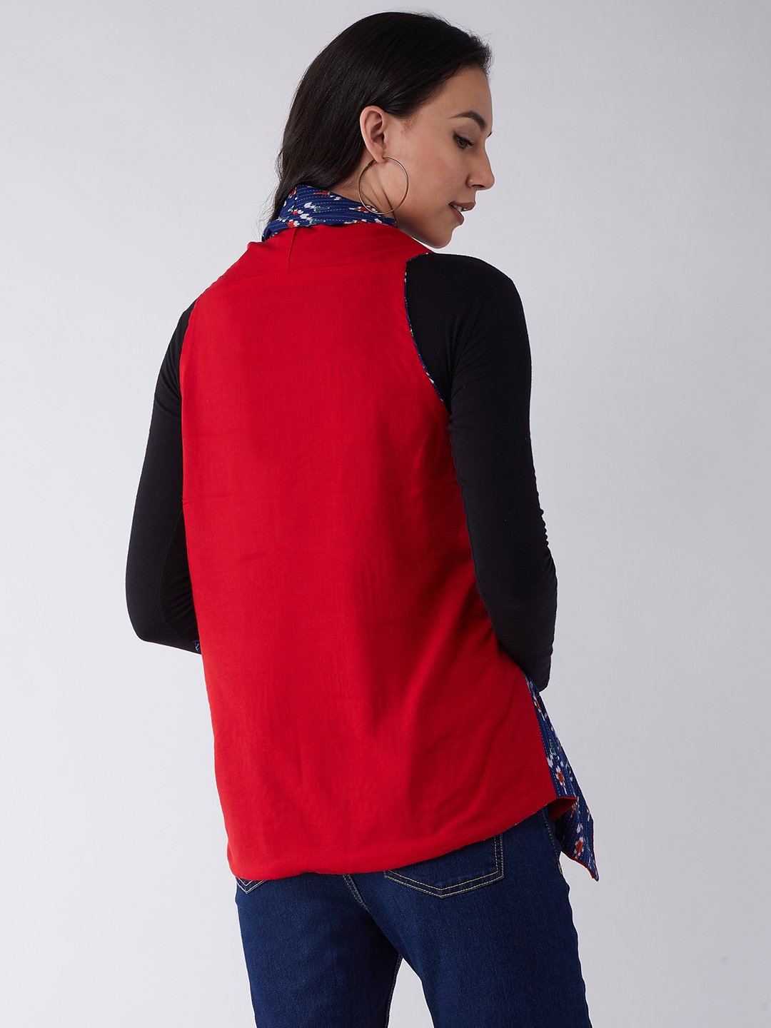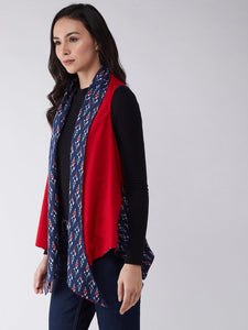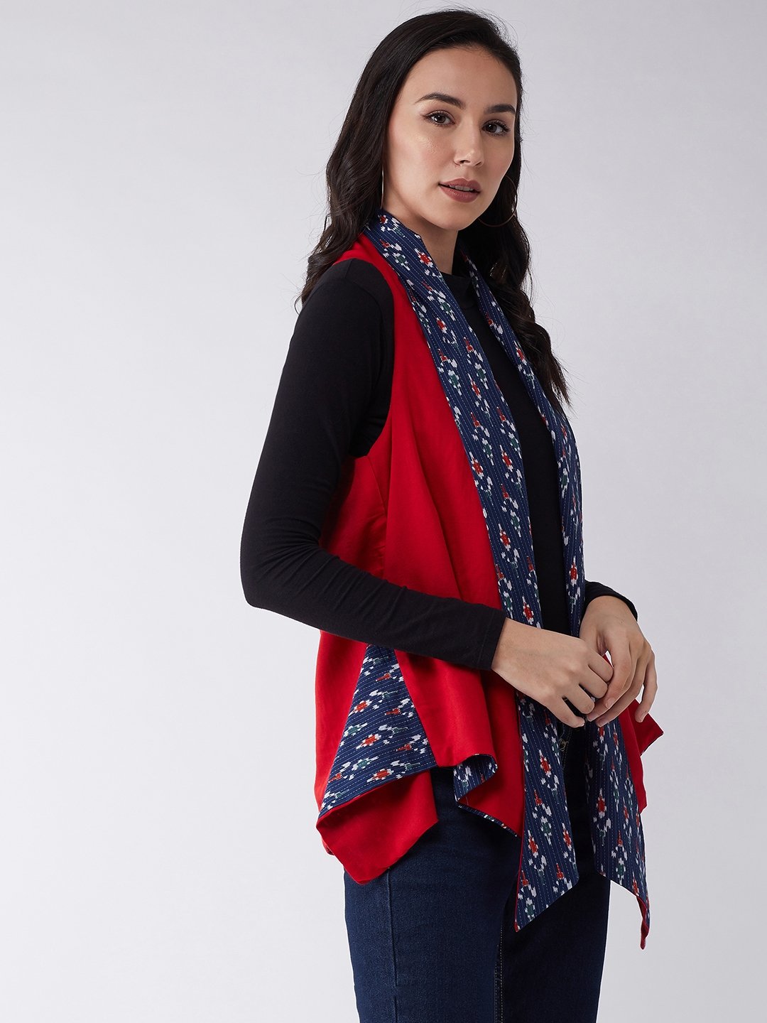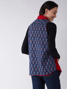 Add a contemporary flair to your shrug collection with this blue kantha Ikkat reversible shrug. You can layer it over a casual tee and skinny jeans.