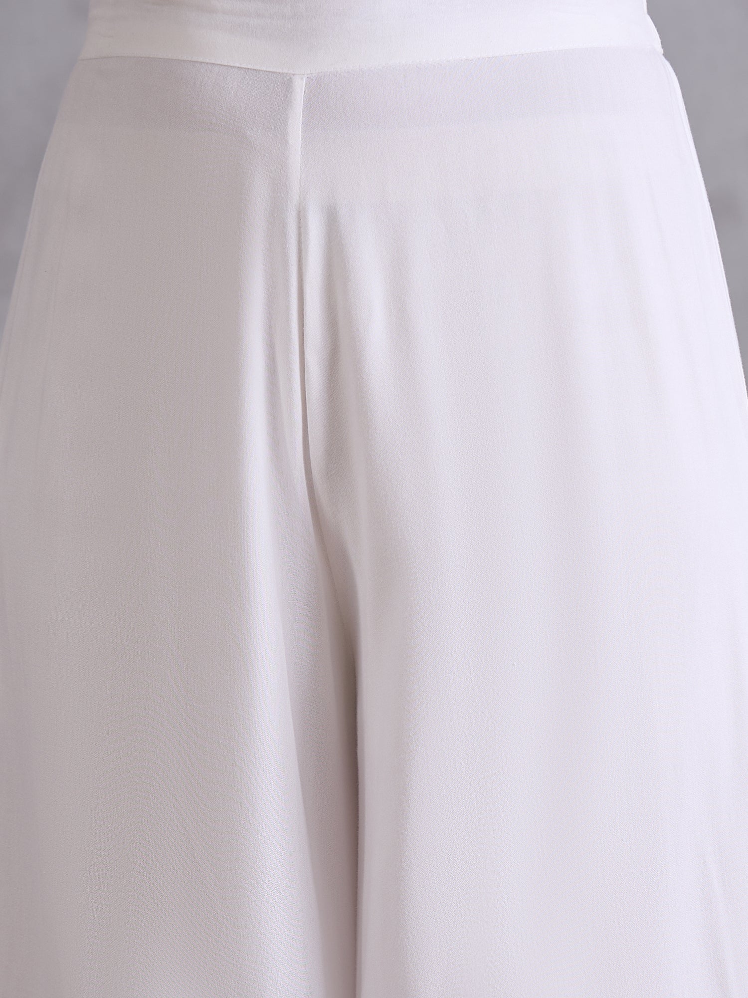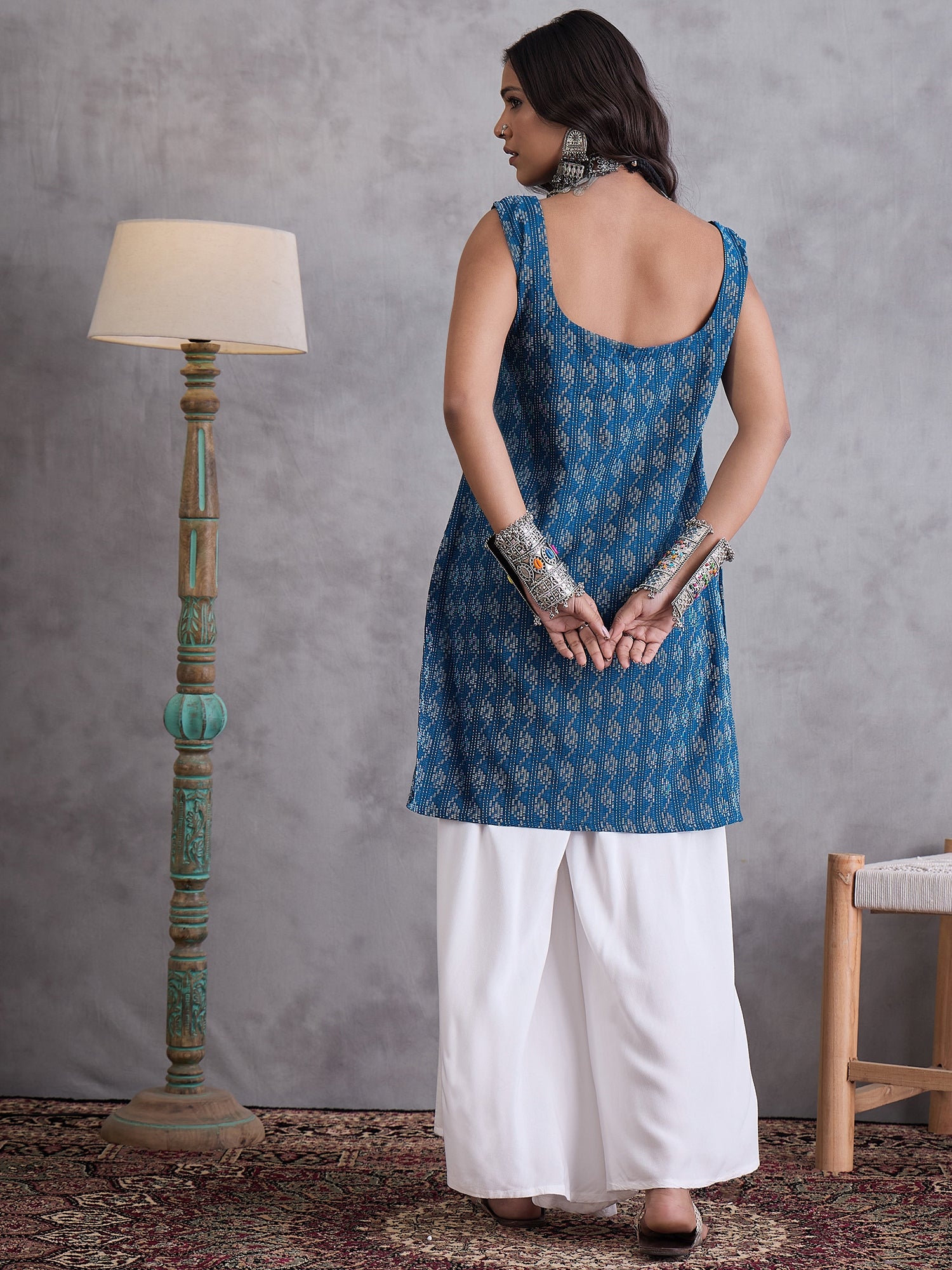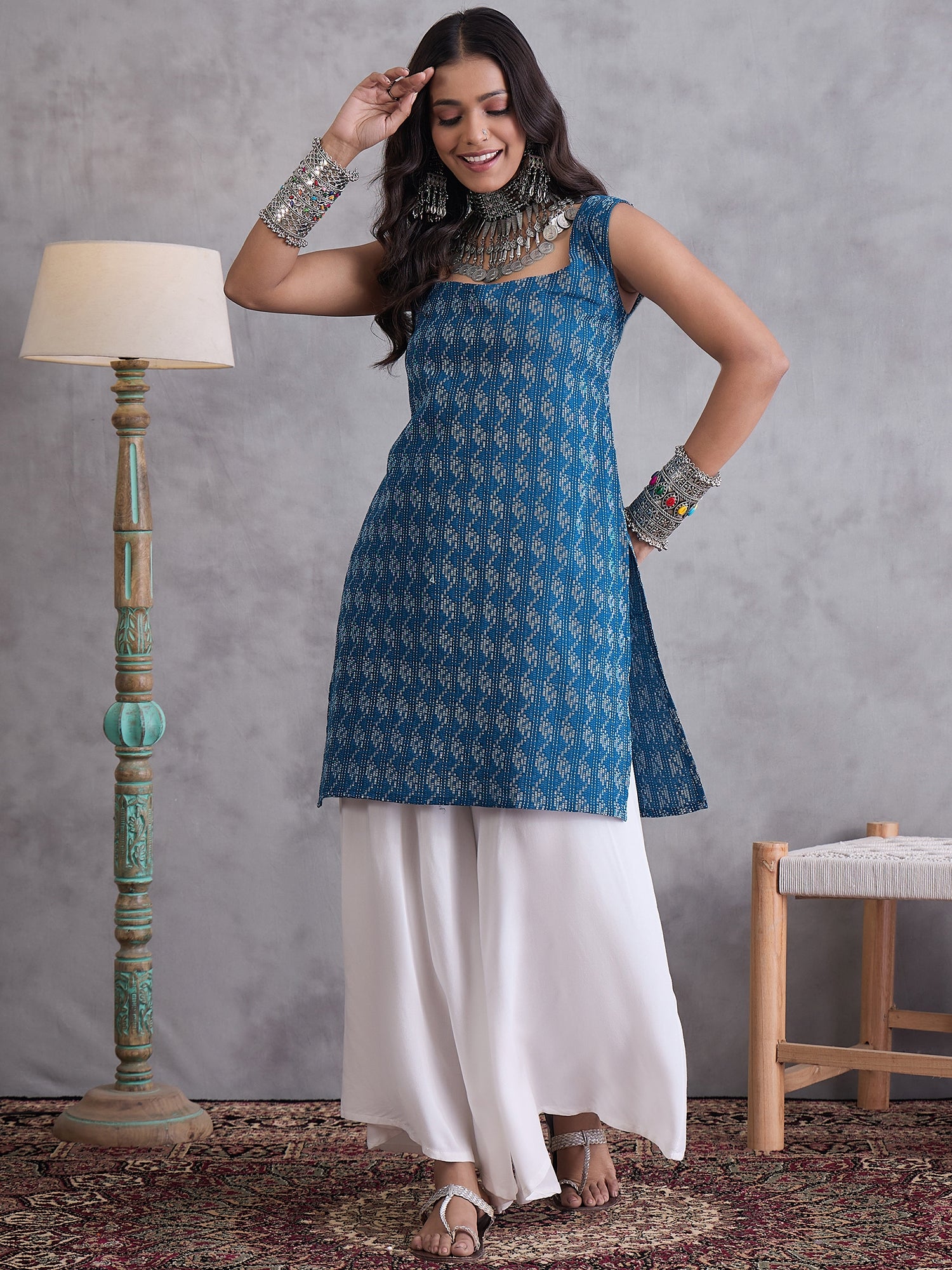 A refreshing blue kurta featuring intricate Kantha embroidery and a flattering sweetheart neckline, paired with soft cream palazzo pants. This elegant set blends traditional craftsmanship with a modern touch, making it perfect for festive or semi-formal occasions.