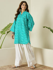 Blue kurta with white dot print paired with white salwar offers a clean and timeless ethnic look. Comfortable fabric ensures ease for everyday wear and casual outings.