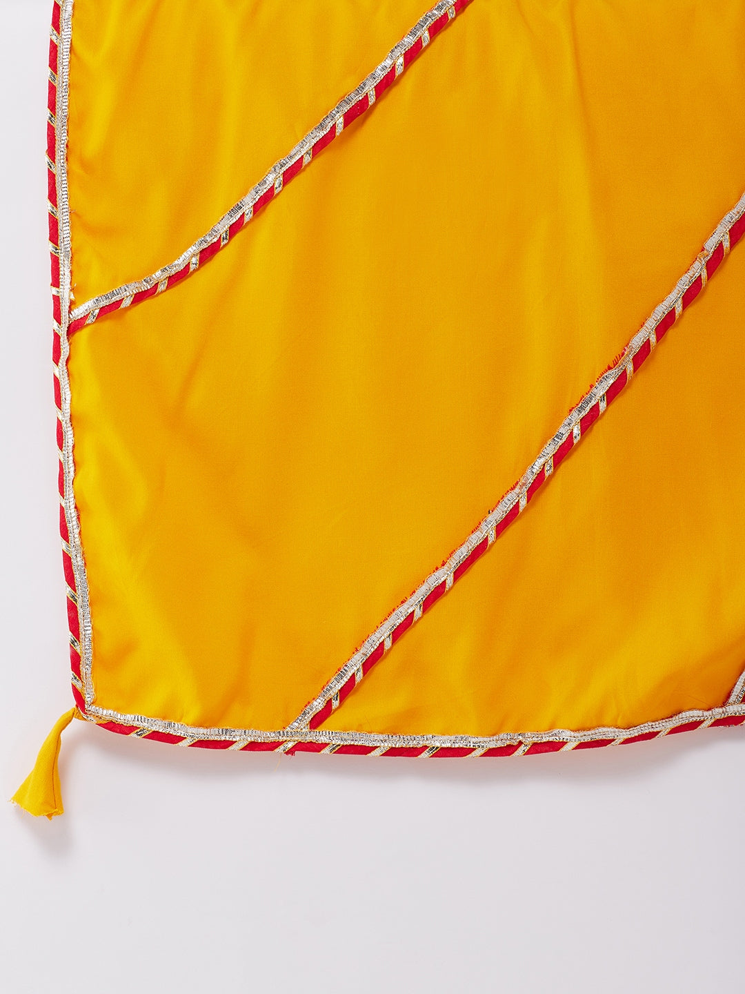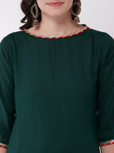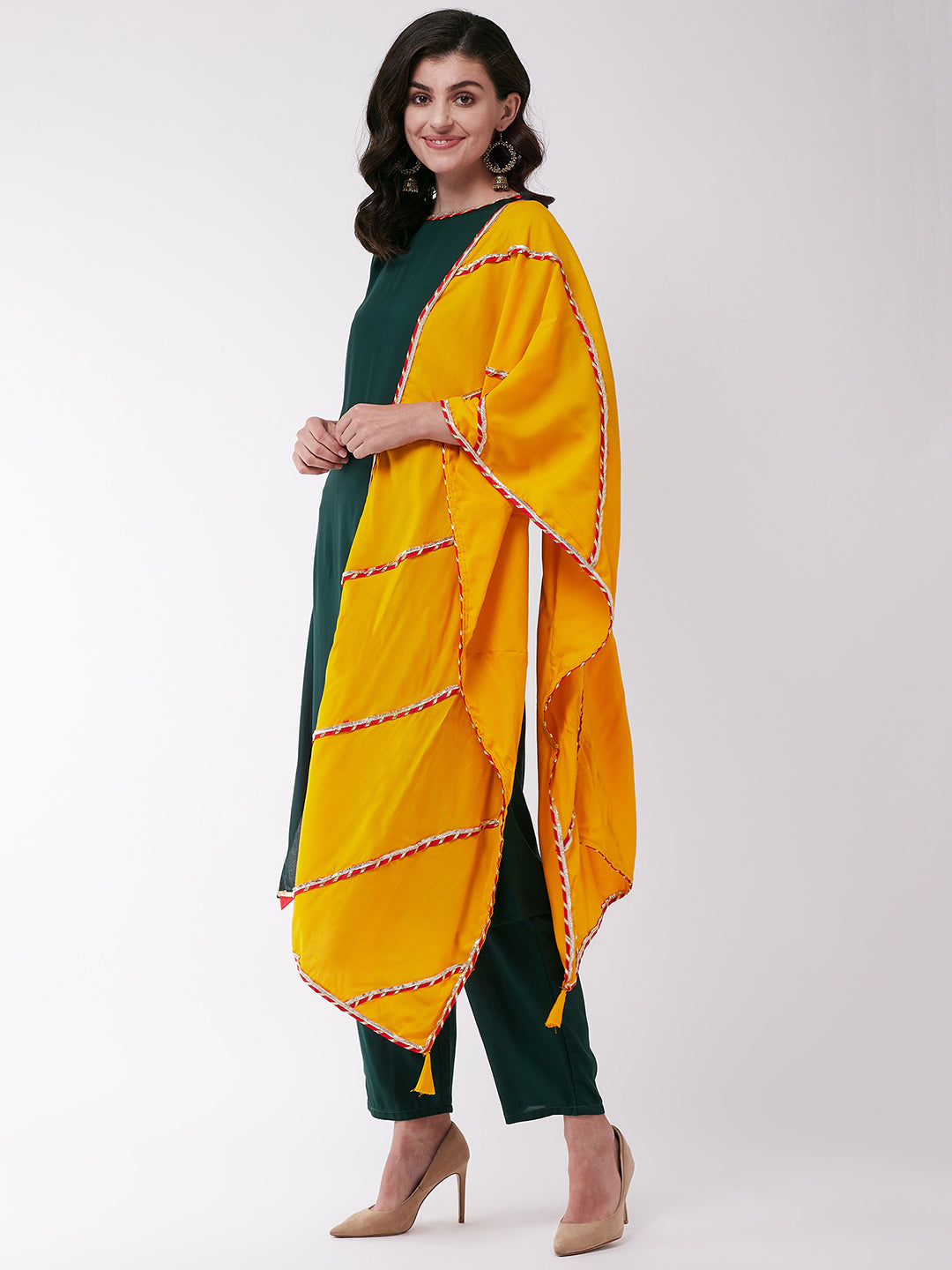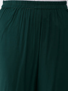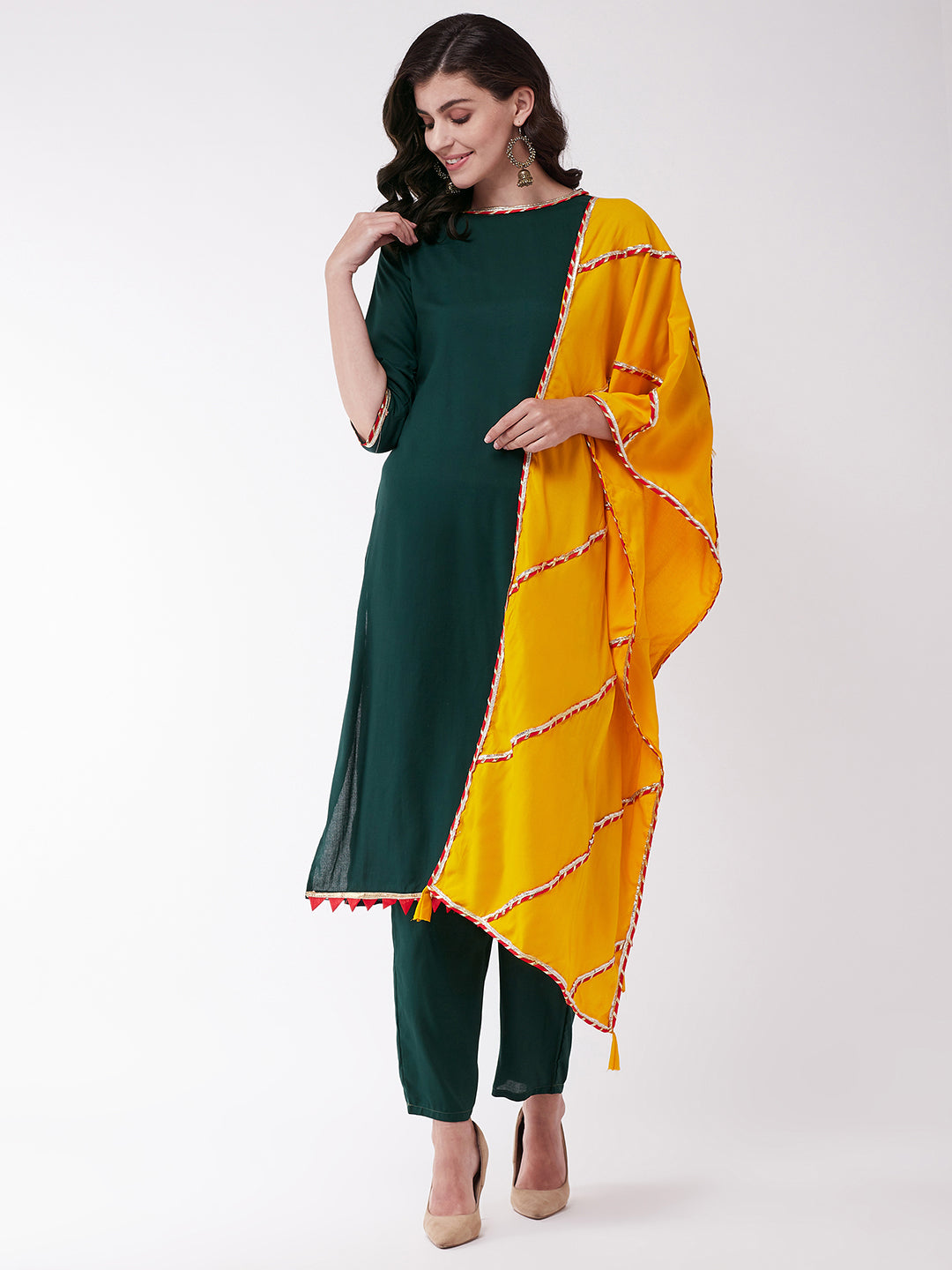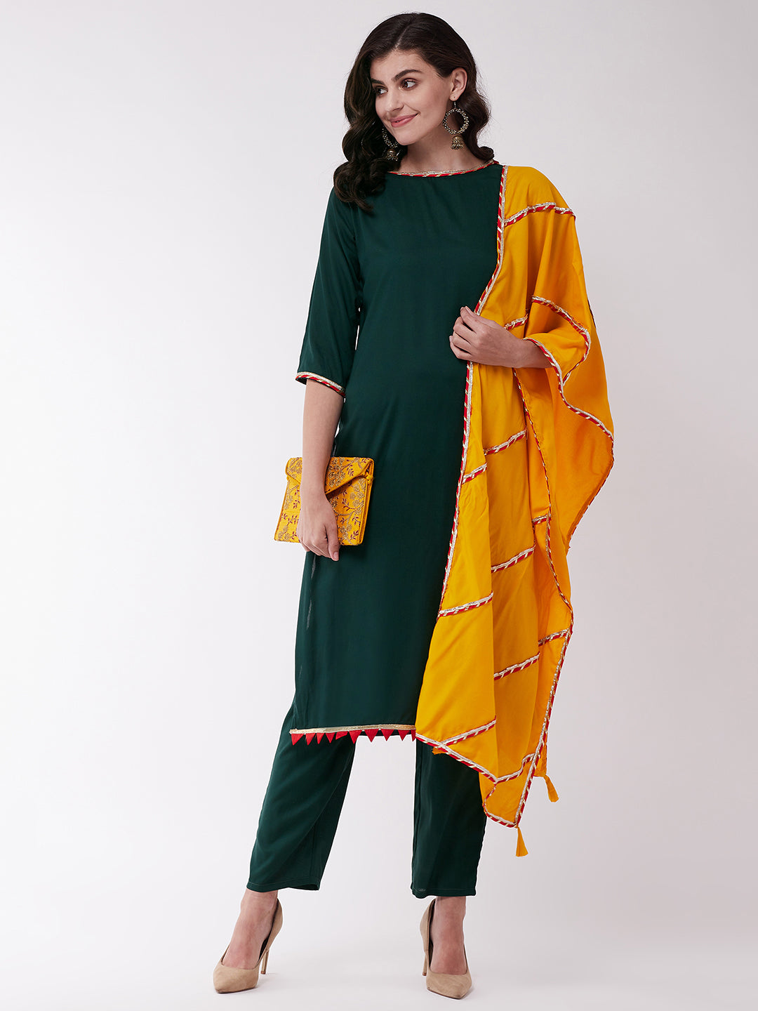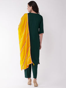 Enhance your entire look in a snap by wearing this pretty bottle green coloured kurta pant set. This kurta pant and dupatta set is made of viscose rayon and has red Gota work.