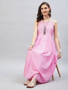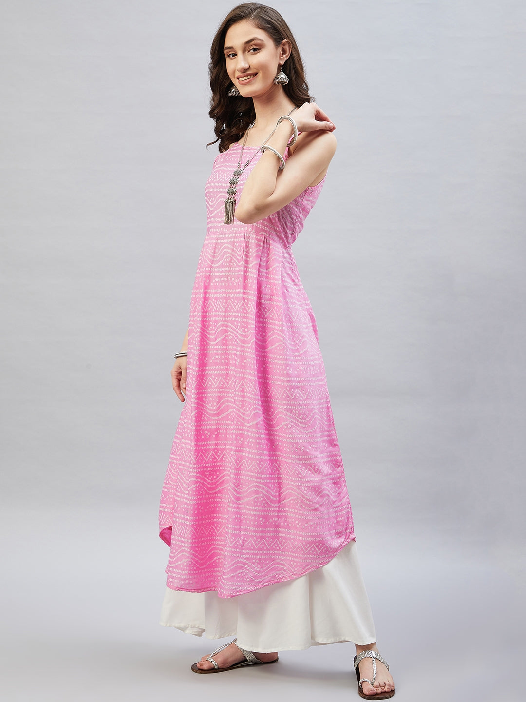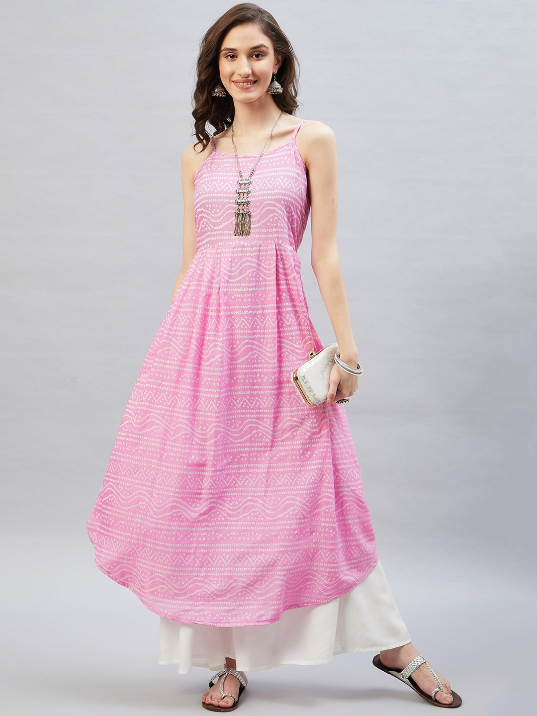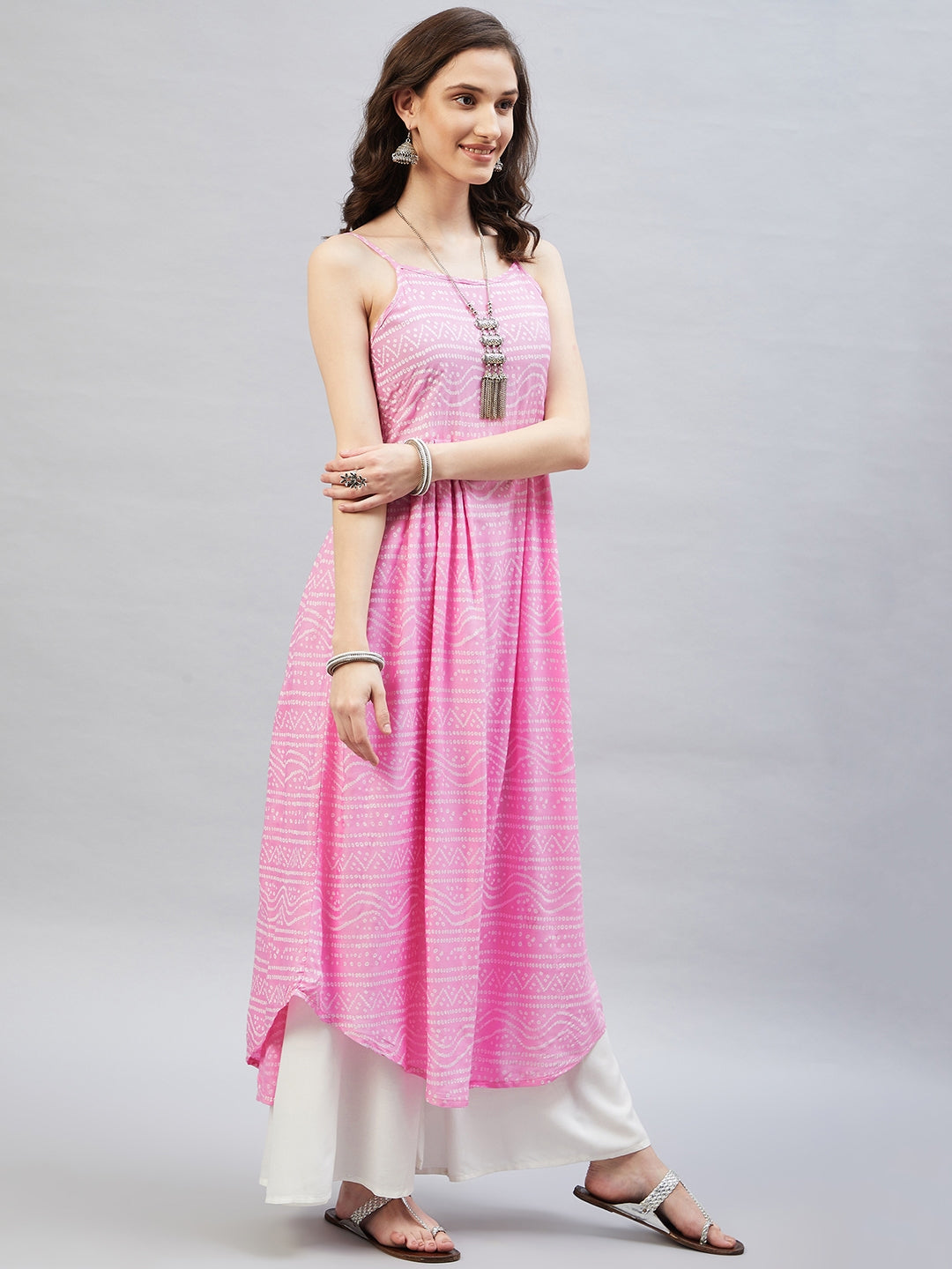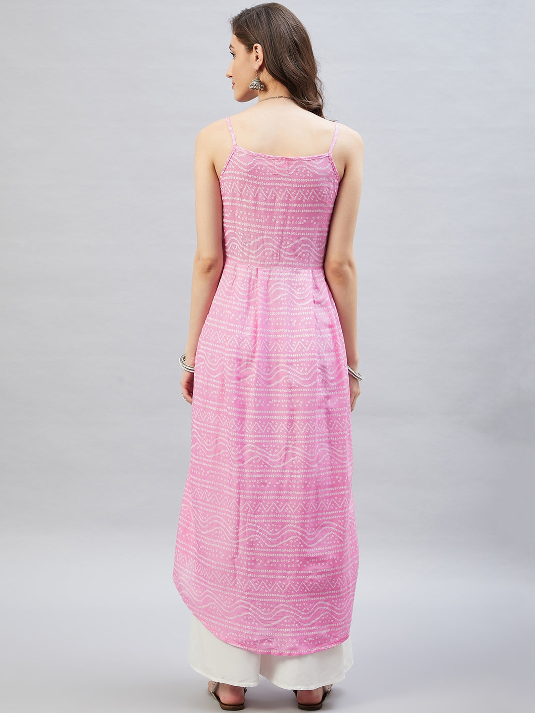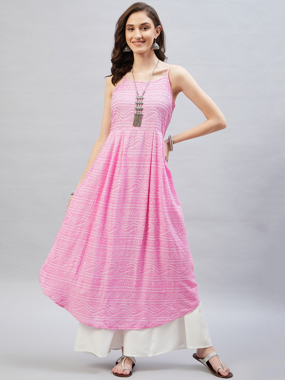 Heighten your overall look with this strappy kurta. Featuring traditional Bandhani design, this kurta can be styled with white palazzos.
