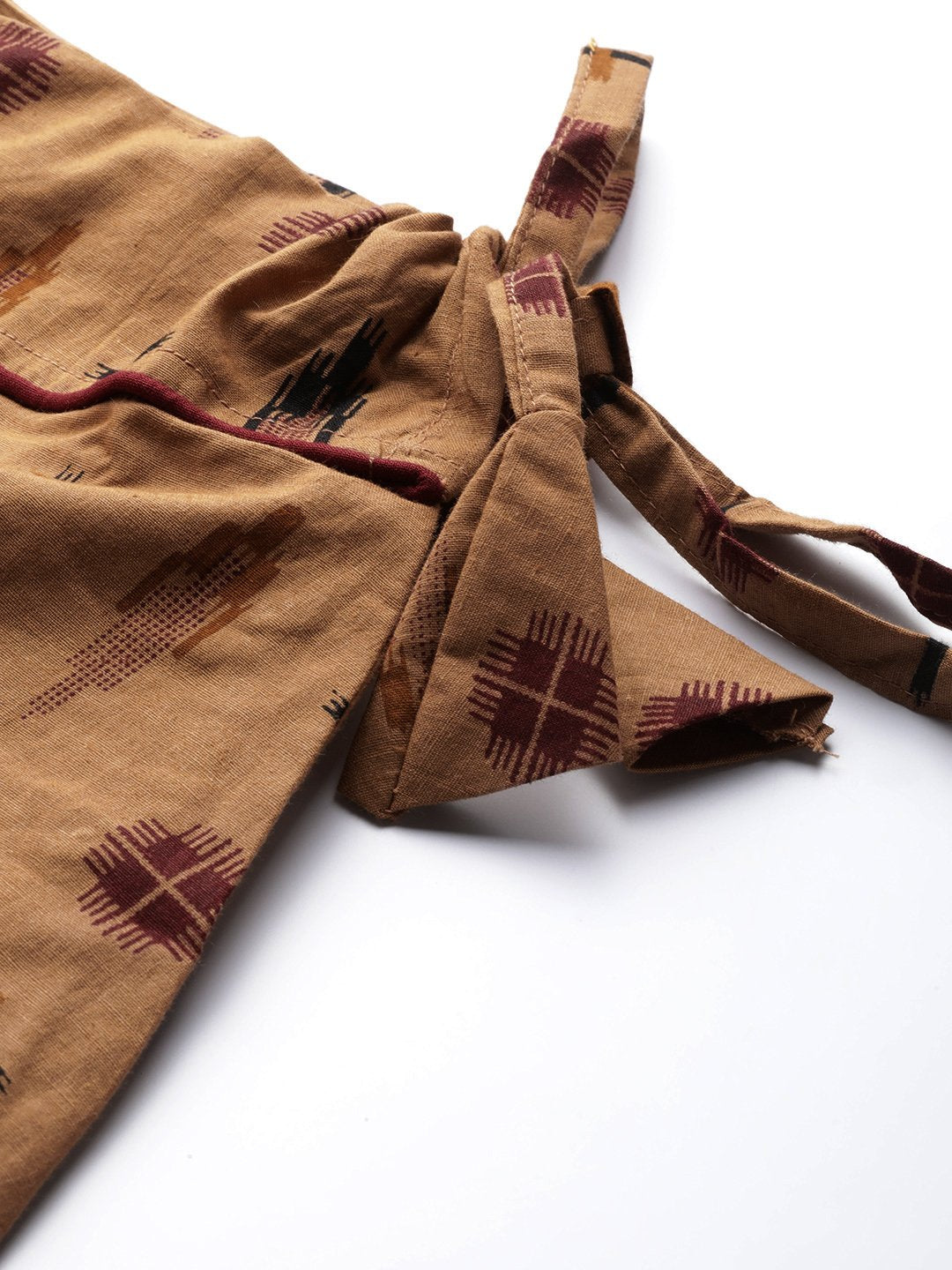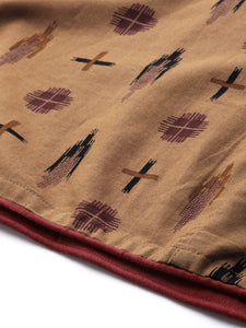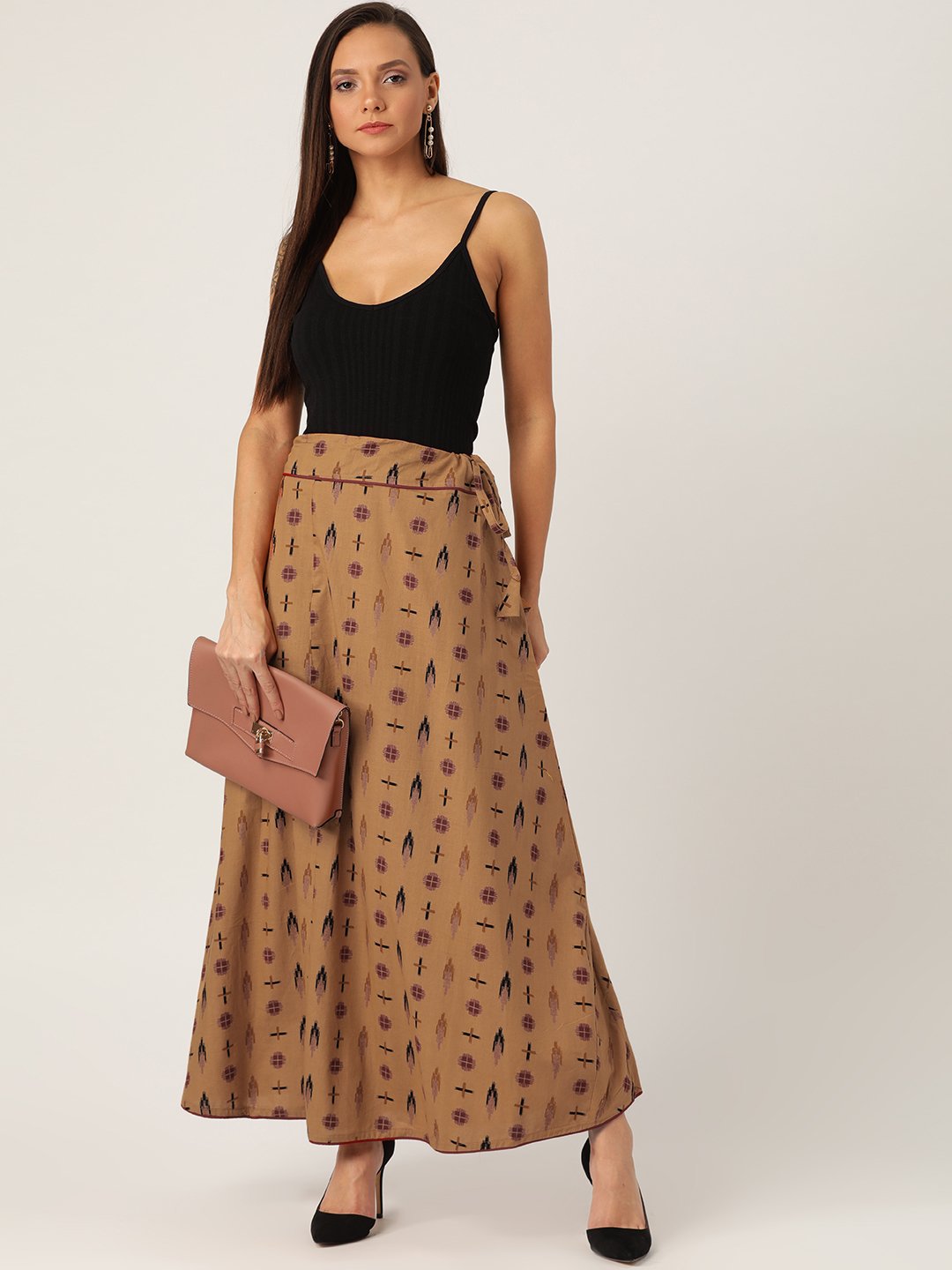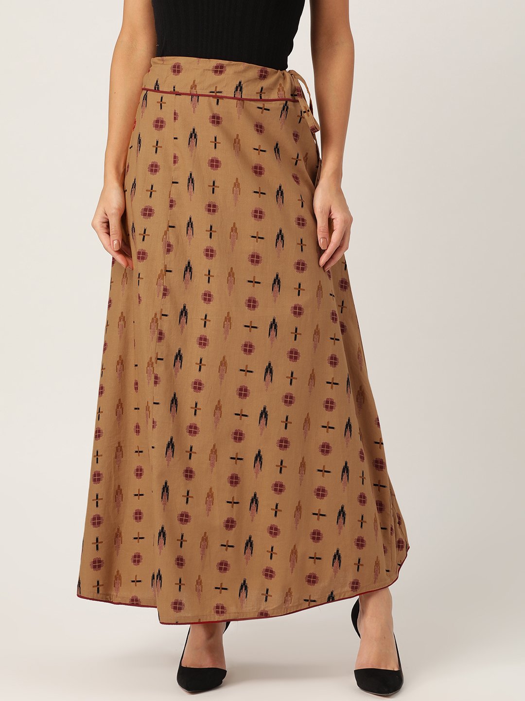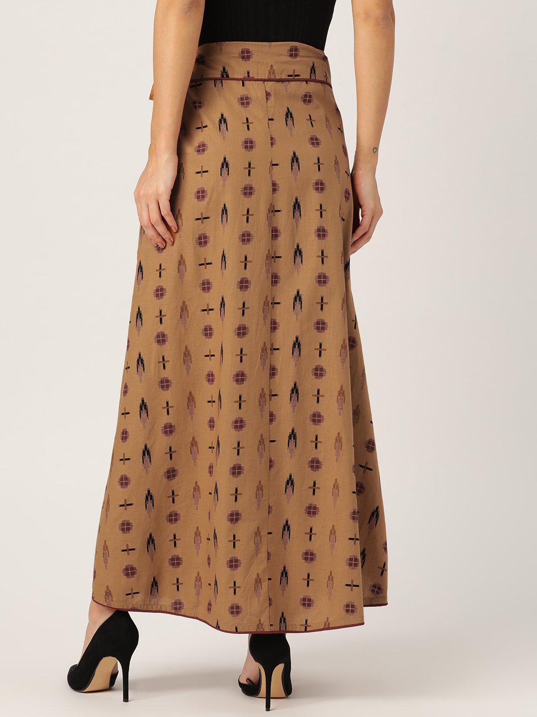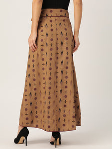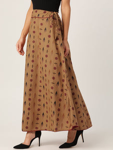 Brown and burgundy printed maxi flared skirt, has a drawstring closure and flared hem
