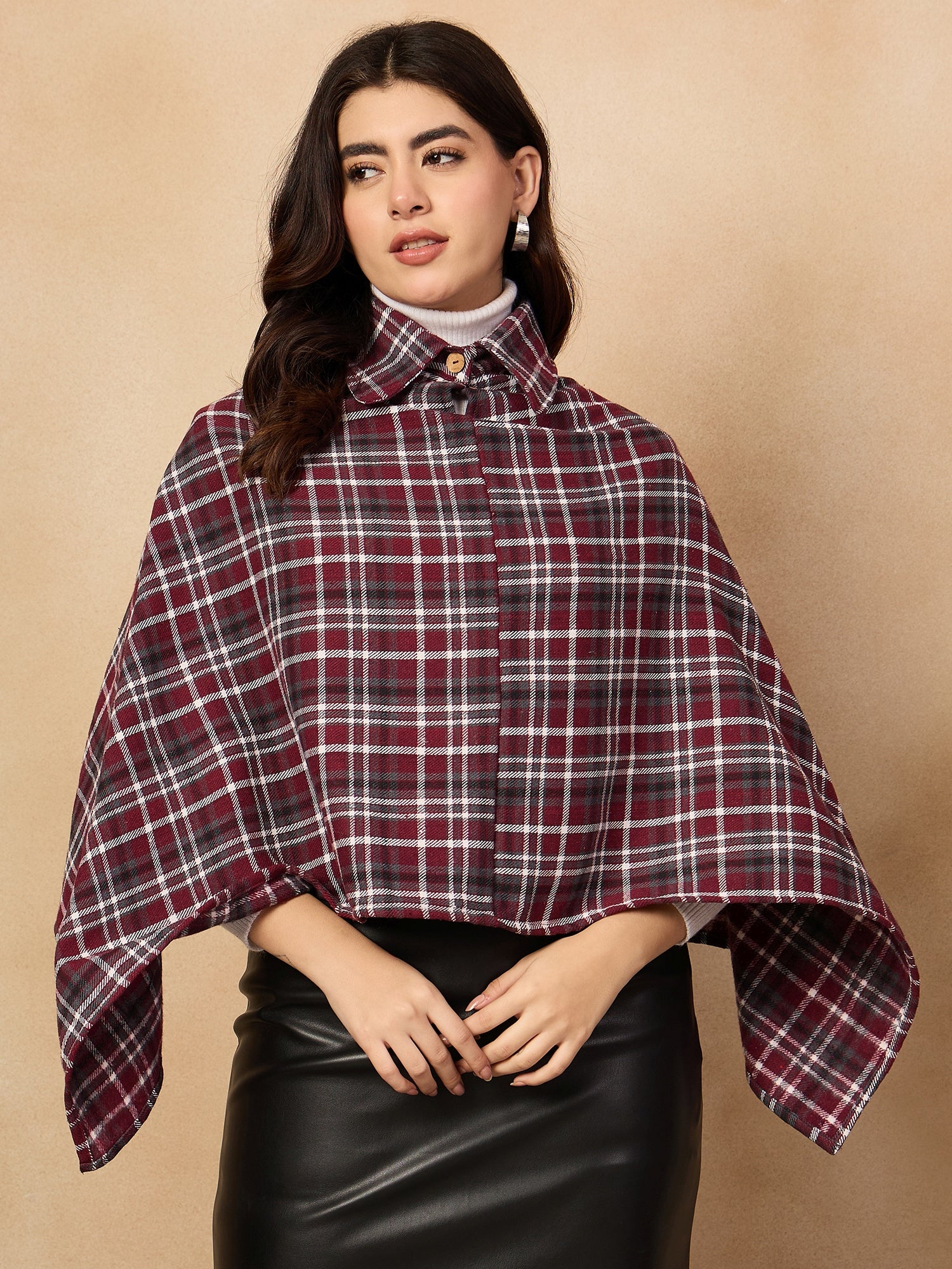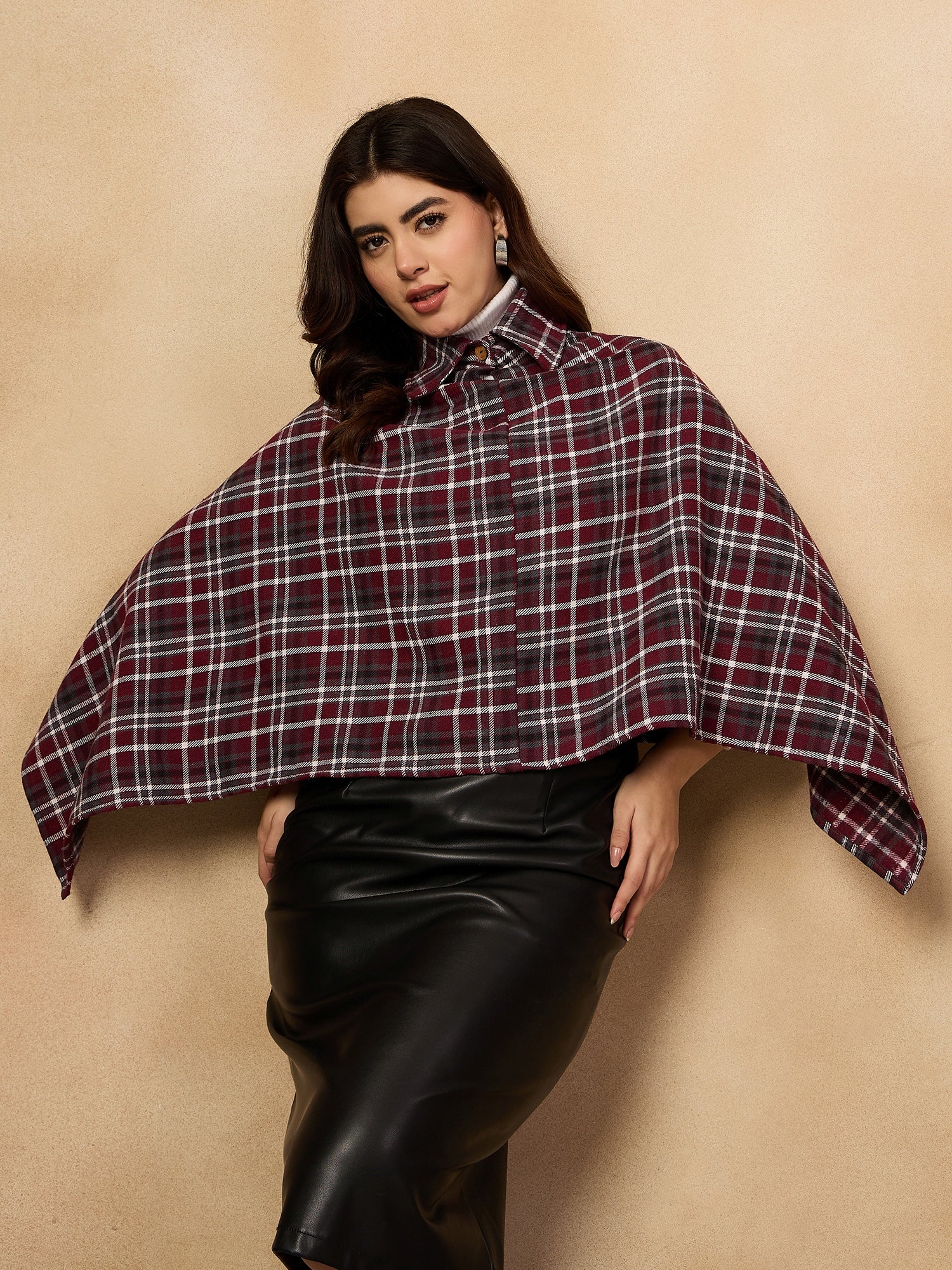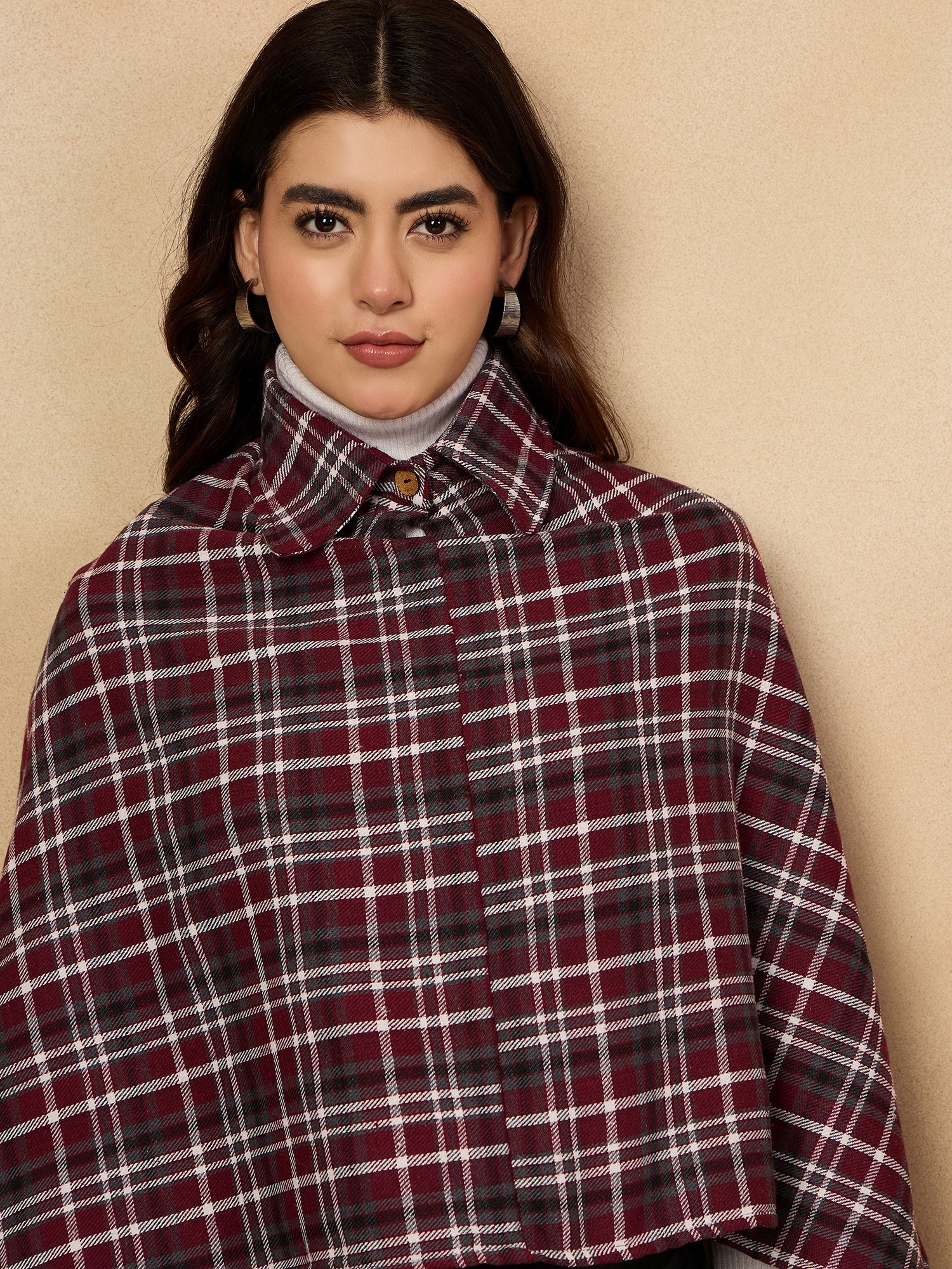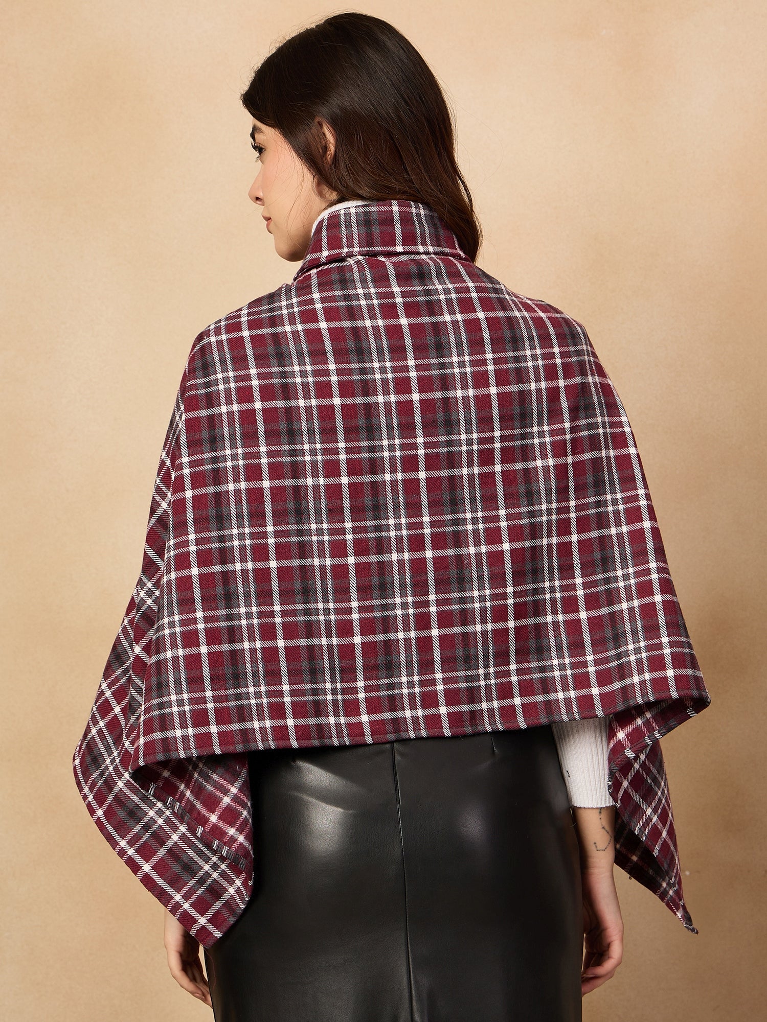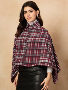 With its elegant burgundy and grey checkered design, the Burgundy Grey Check Collar Poncho is a stylish choice for chilly days. This poncho features a high collar for warmth and a comfortable, flowing silhouette. Crafted from a soft fabric, it offers both comfort and fashion. A perfect piece for layering over casual or semi-casual outfits, making it an essential for your wardrobe.