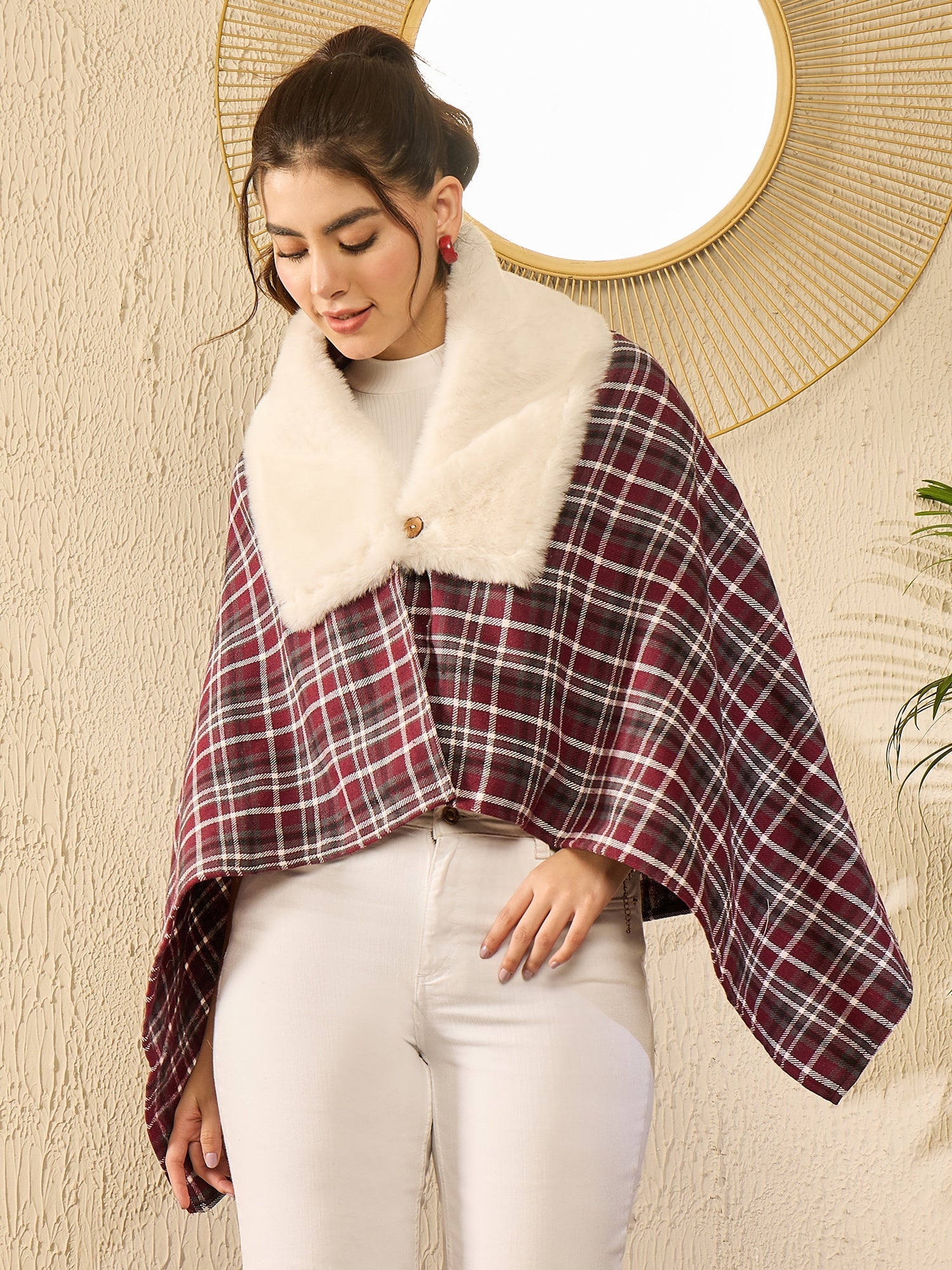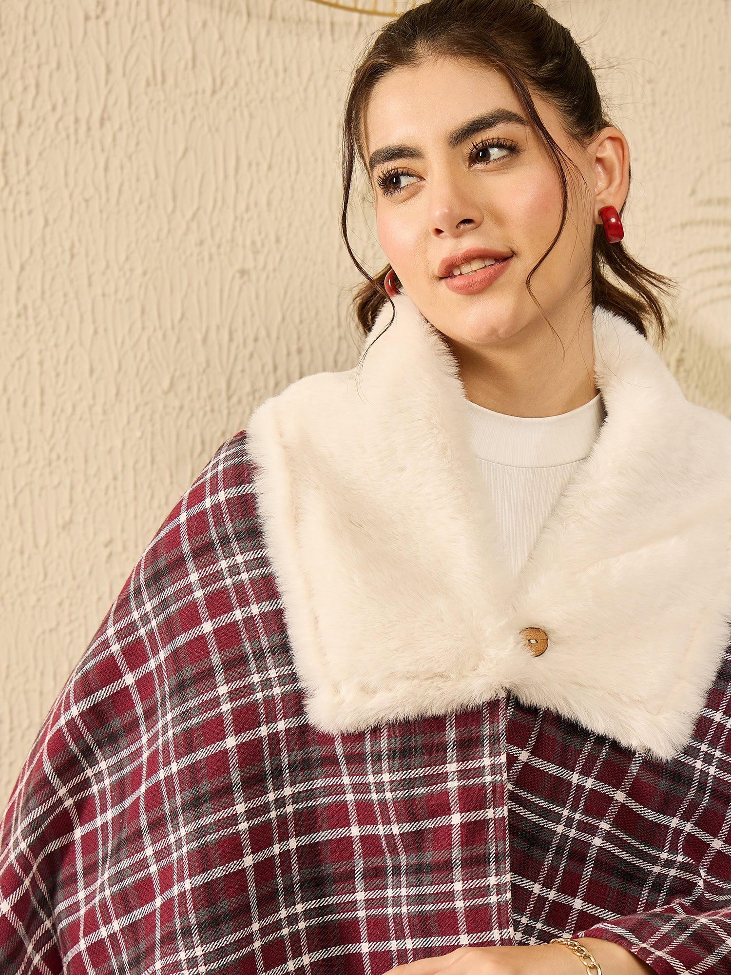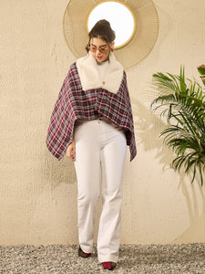 With a striking combination of rich burgundy and muted grey, this poncho exudes elegance. The checkered pattern is complemented by a creamy fur trim along the edges, adding a cozy, refined element to the piece. The loose, flowing design offers effortless styling, ideal for layering during colder weather while maintaining a fashionable flair.