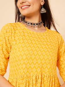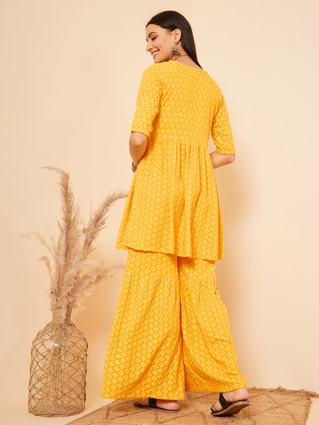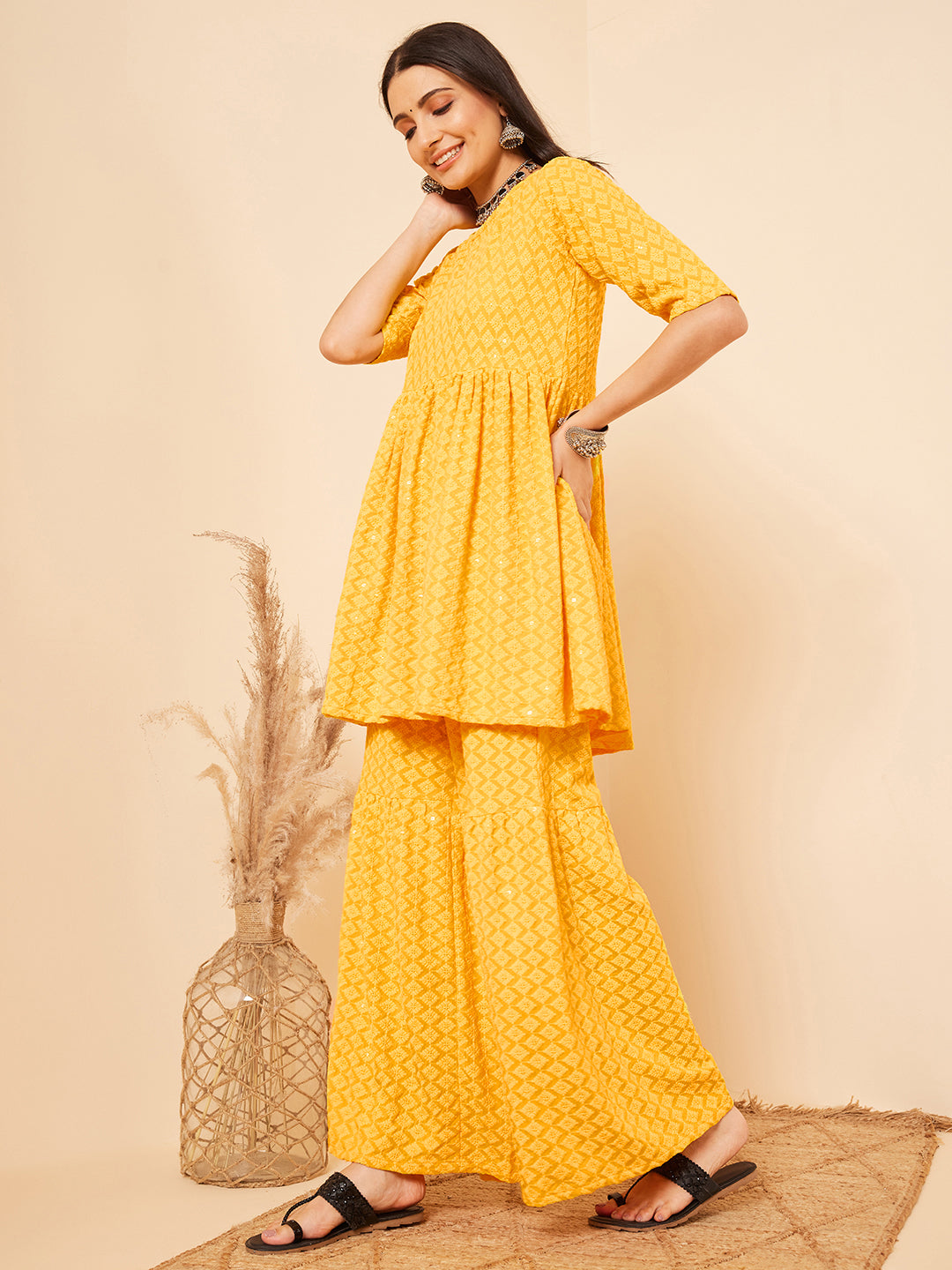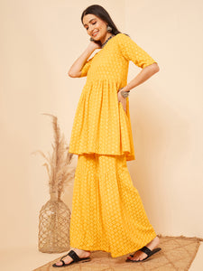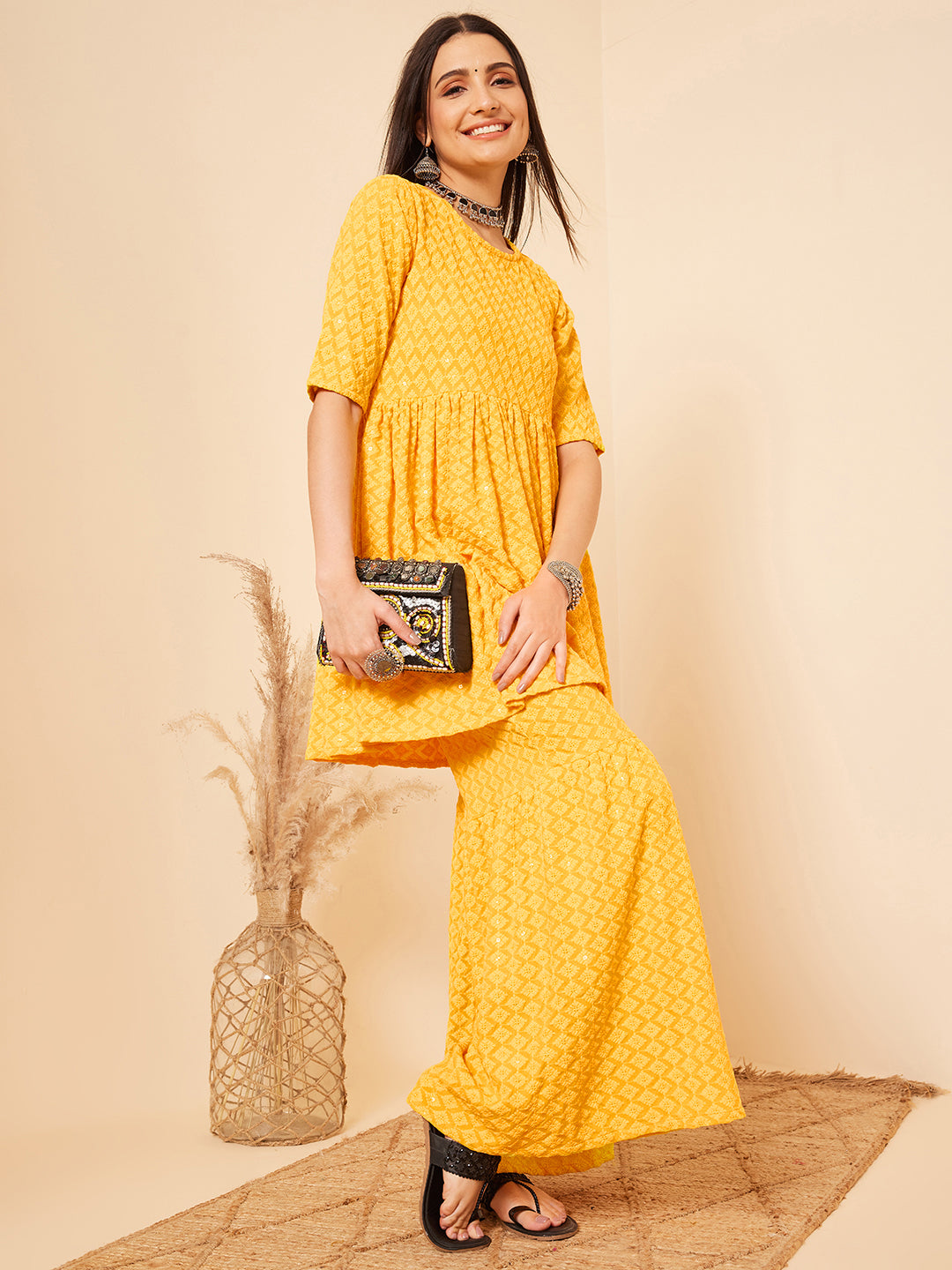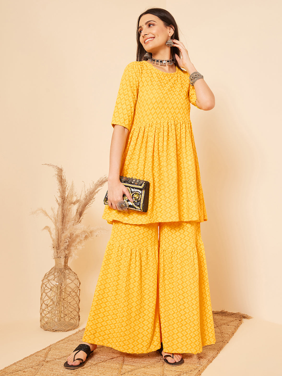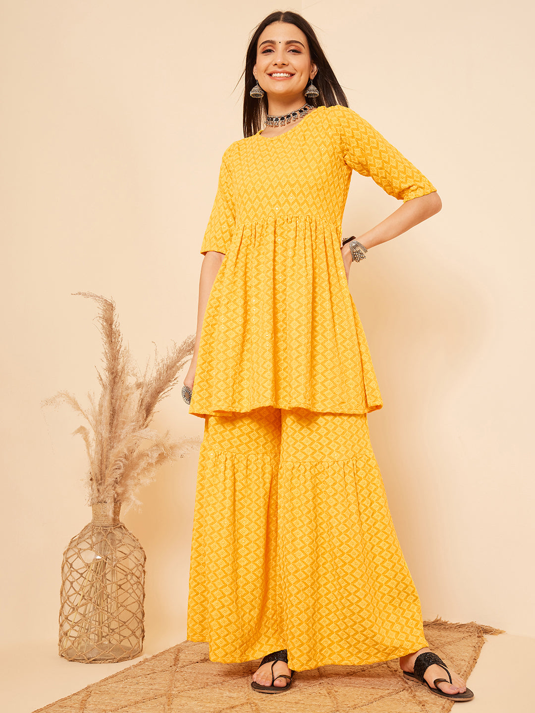 The Set is crafted from best of Indian fabrics. Style it with Oxidised jewelery and juttis and you are good to go for any outing Hand Wash Only Seperately.