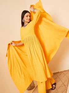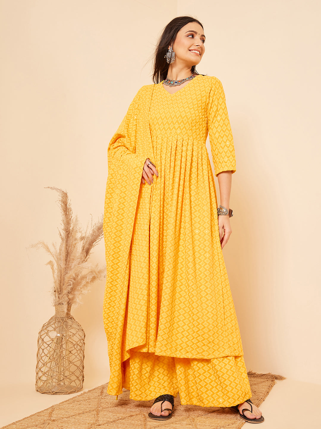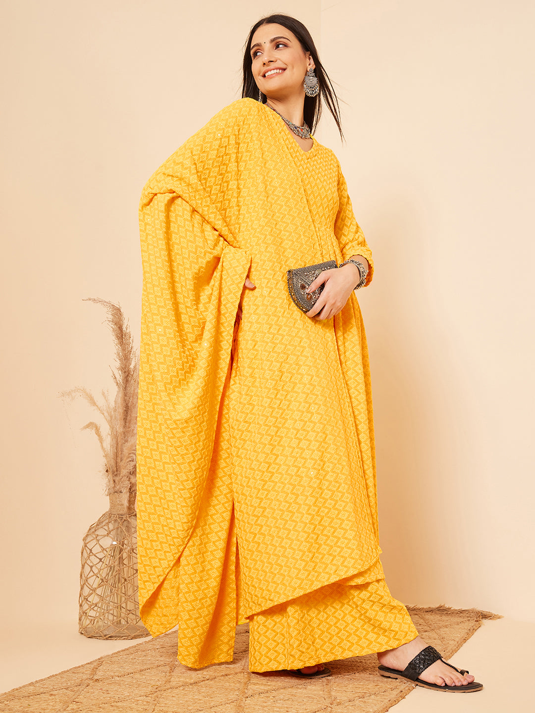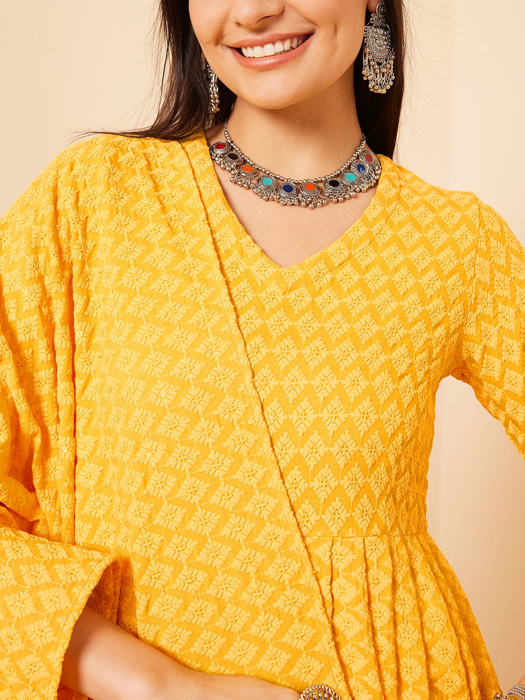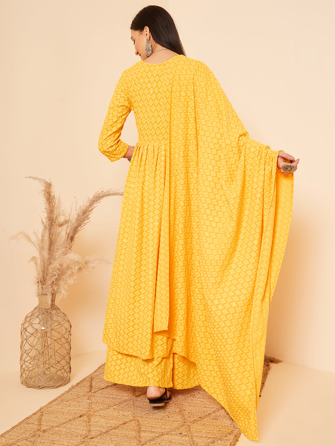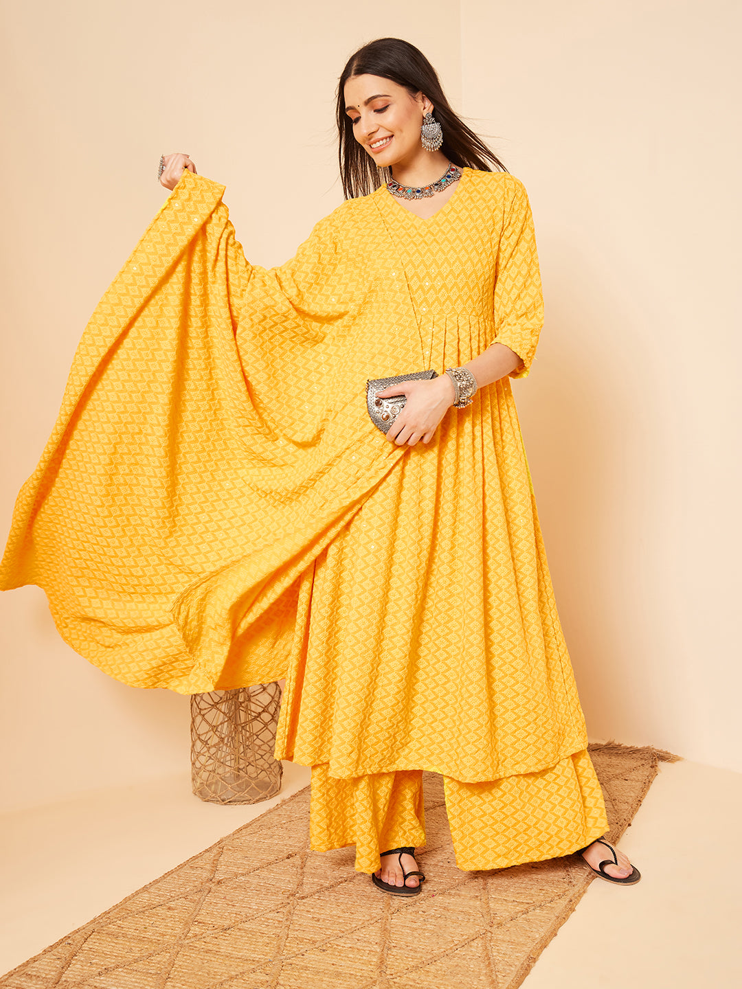 The Set is crafted from best of Indian fabrics. Style it with Oxidised jewelery and juttis and you are good to go for any outing Hand Wash Only Seperately.