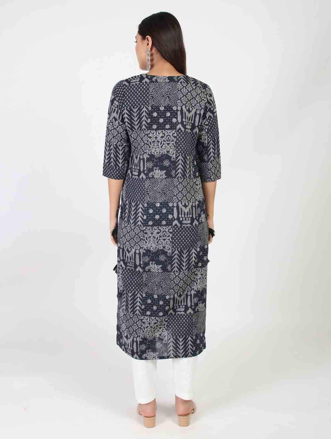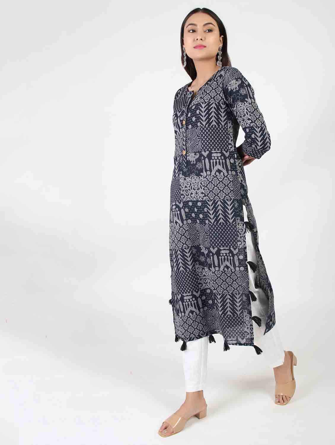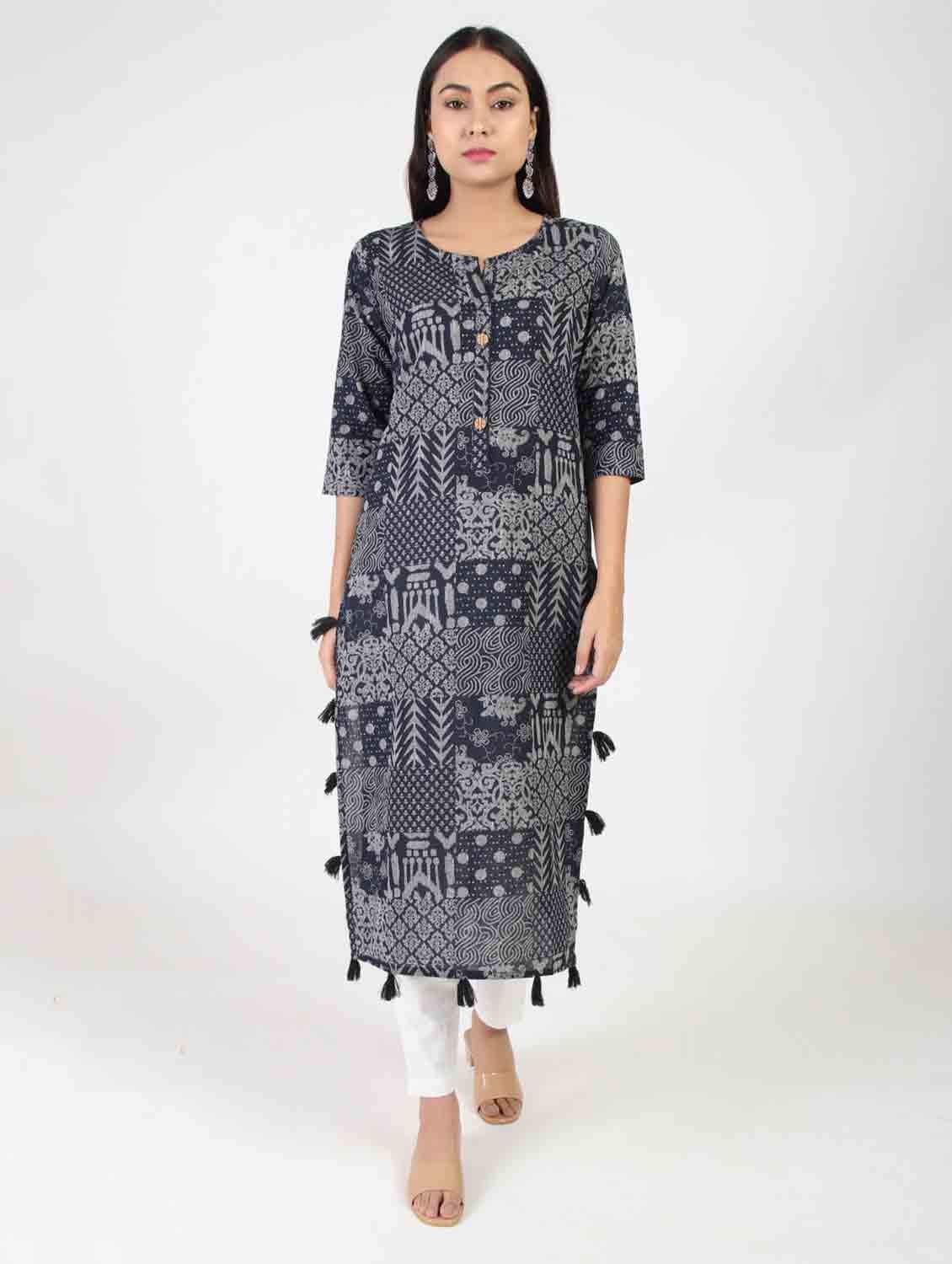 Accentuate the beauty with this greyish color kurti. The tassels all around the border appears chic and elegant at the same time.