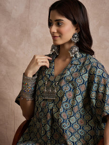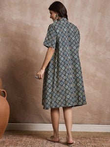 Add a refined ethnic touch to your everyday wardrobe with the Classy Blue Ajrakh Print Collar Dress. Crafted with handblock-style Ajrakh motifs, this collared dress blends heritage with a contemporary cut.