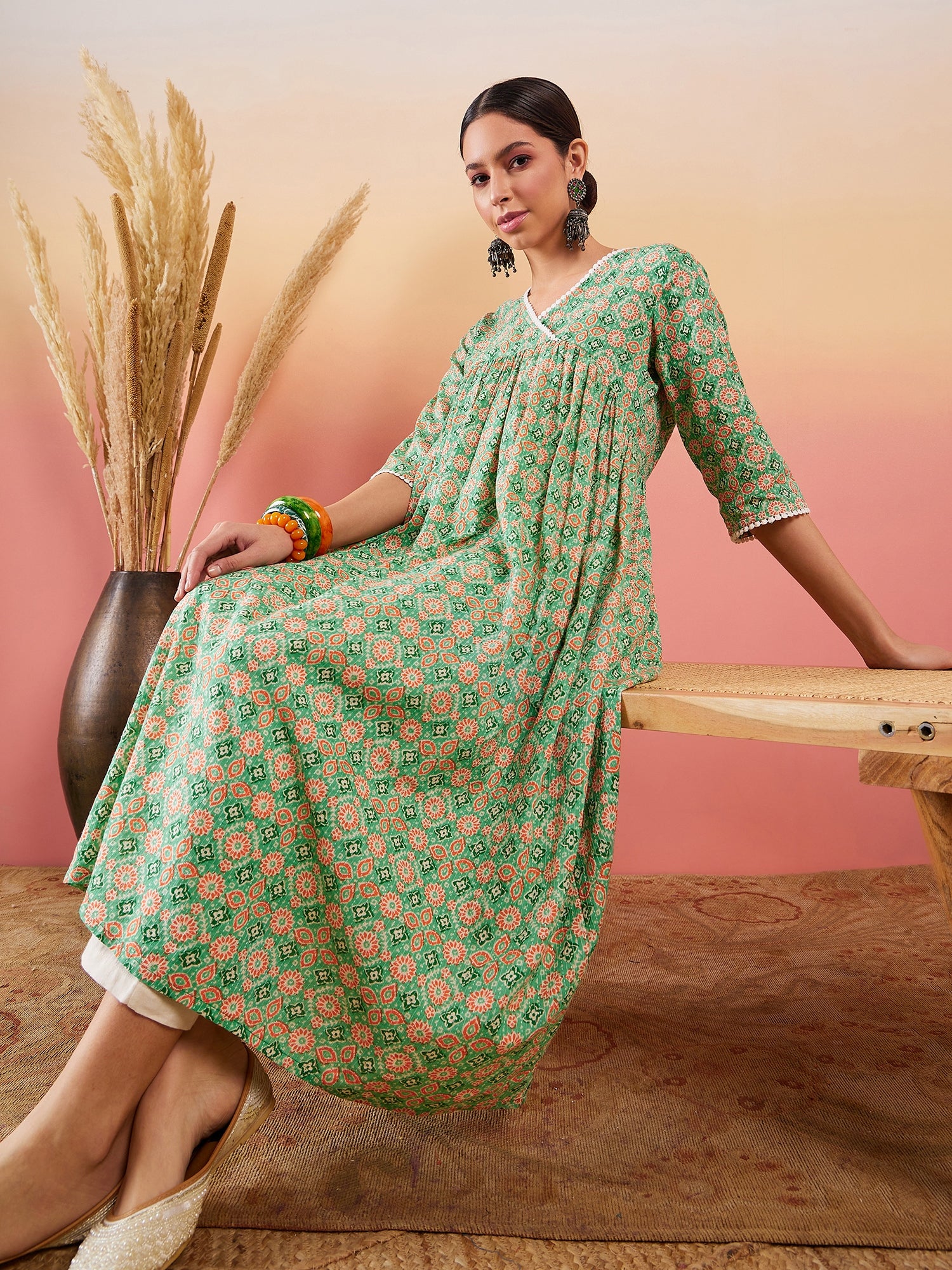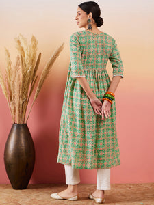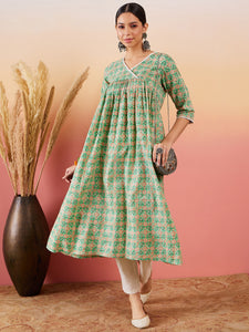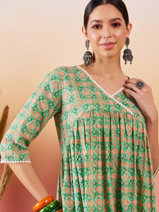 Cool Green Kantha Print Angrakhaa V Neck Lace Dress
