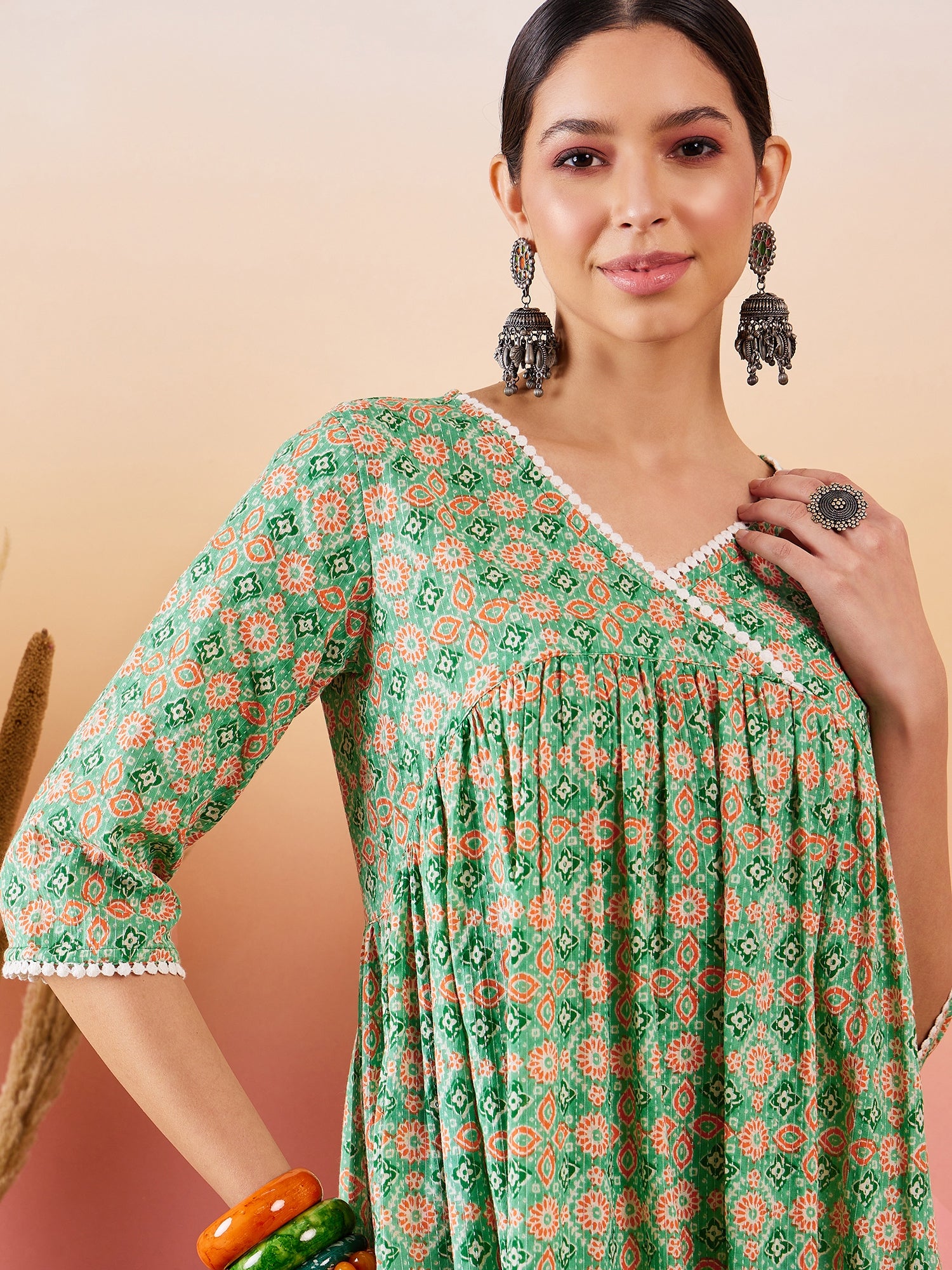 Placeholder Cool Green Kantha Print Angrakhaa V Neck Lace Dress - InWeave