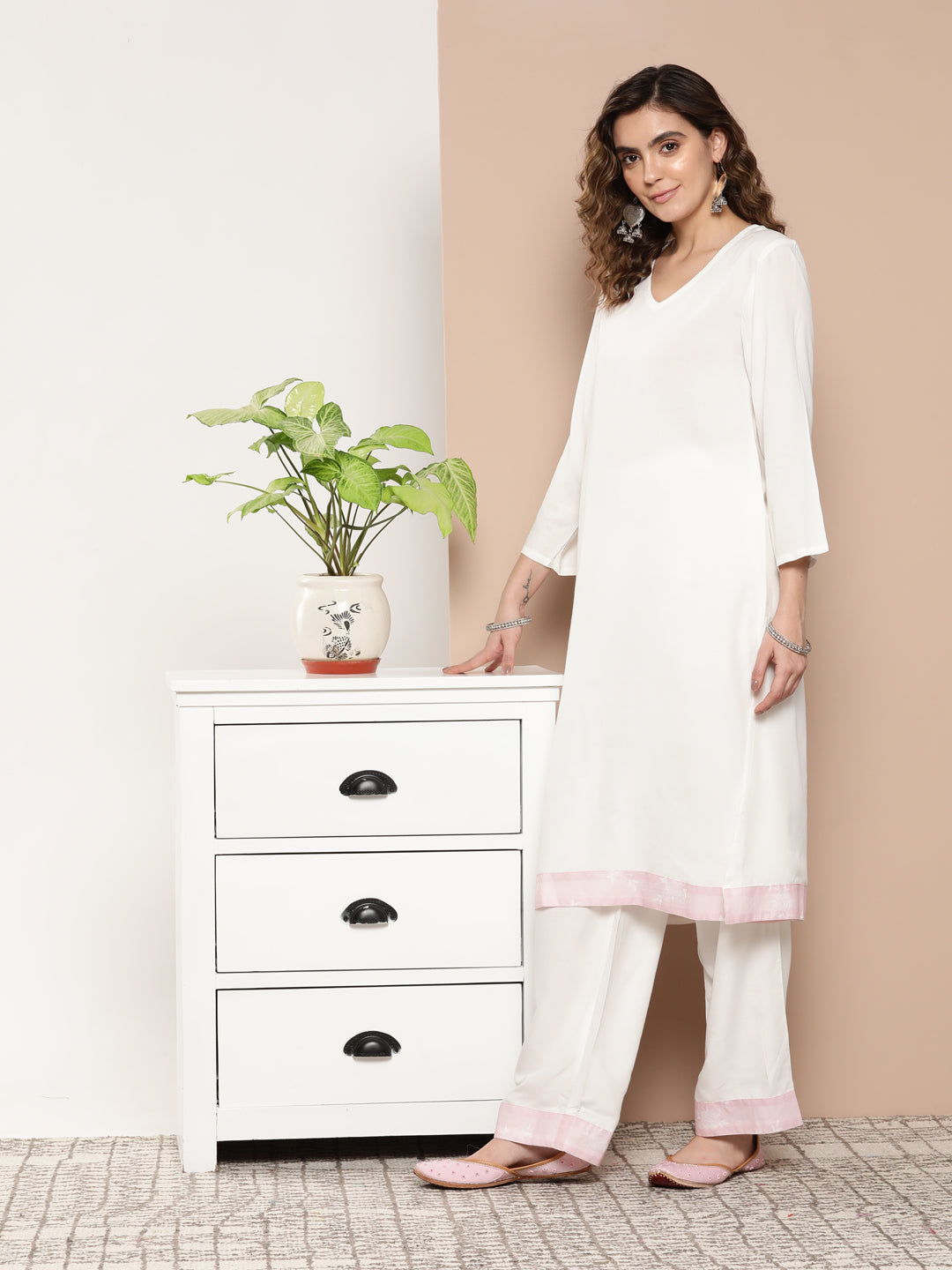Cream Straight Kurta Set W Pink White Print Organza Dupatta