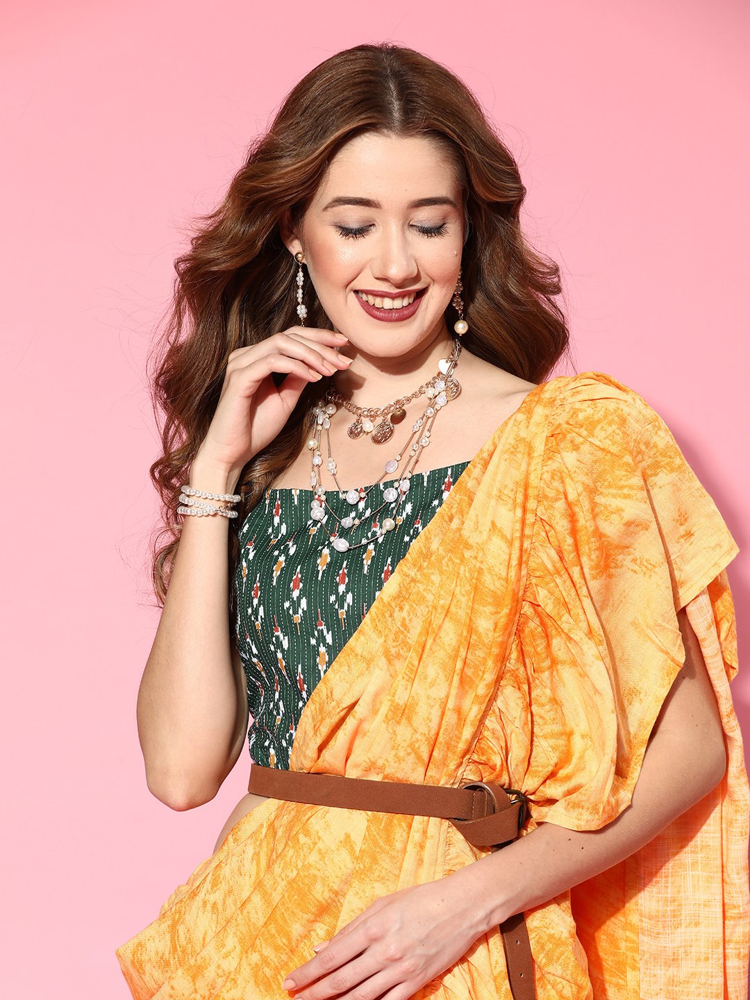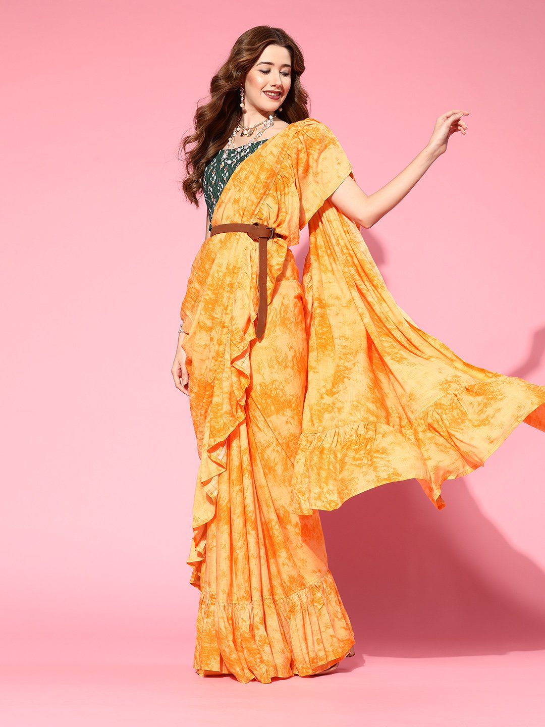 Bedazzle at the next special occasion by donning this uber-stylish Saree. This Tie and Dye saree will surely make heads turn. Be ready to get compliments. Fabric used : Viscose Rayon. Fabric used for Blouse : Pure cotton. Dry Clean Only. This Saree comes with an un-stitched blouse