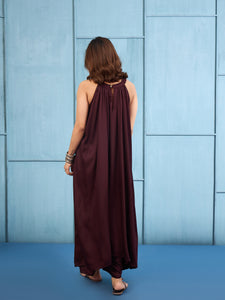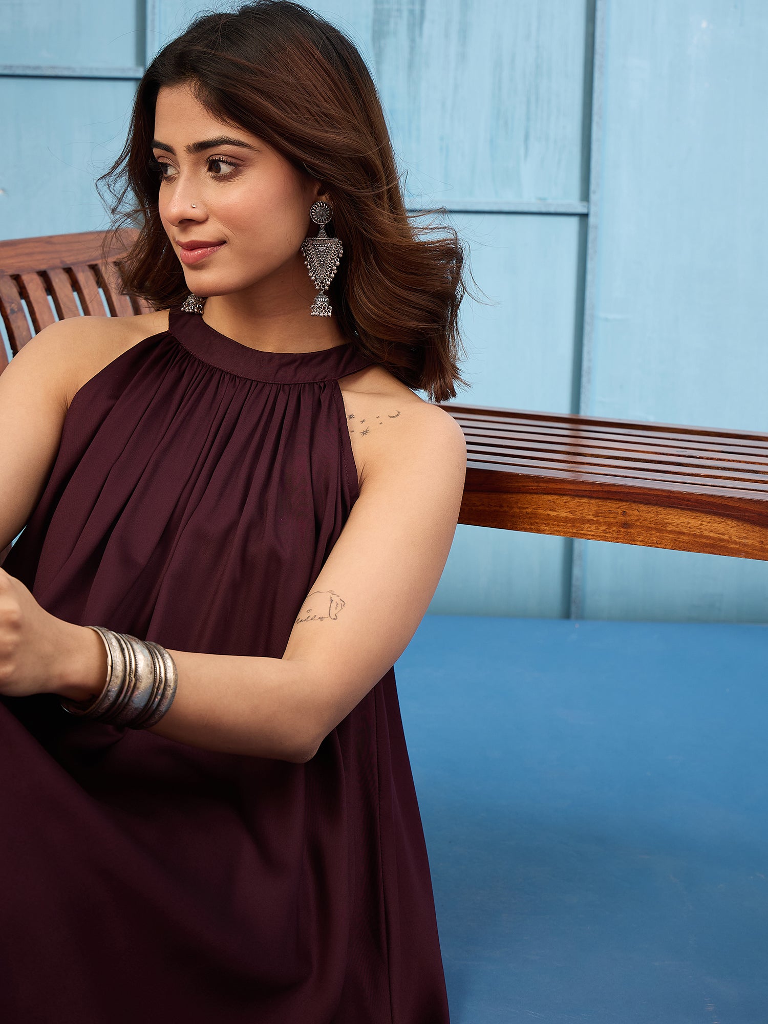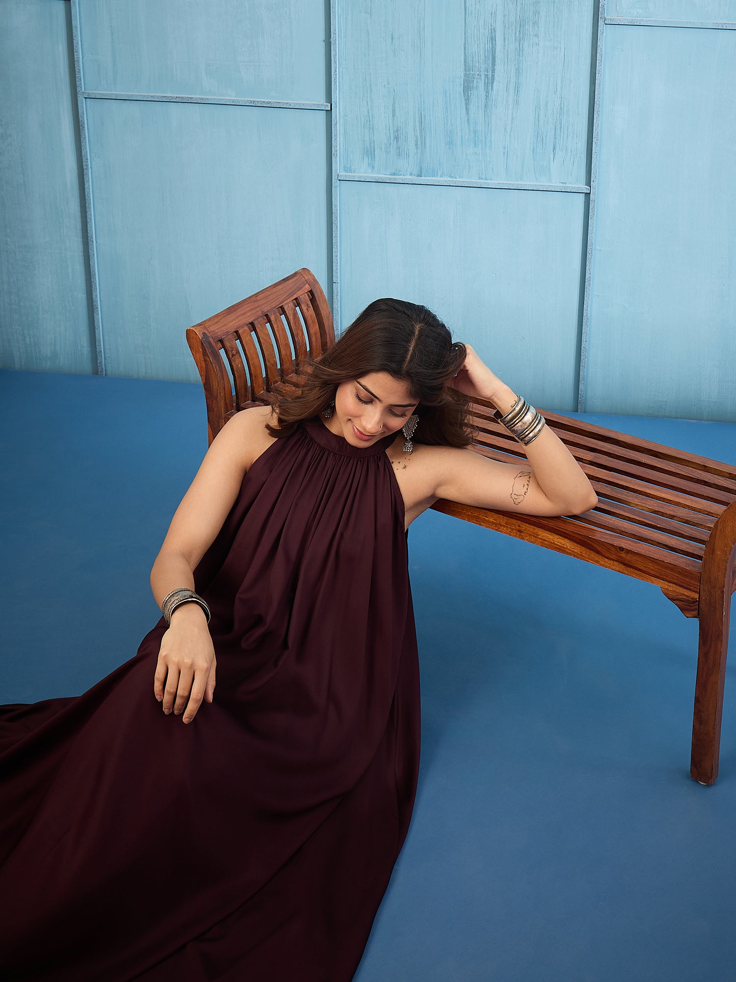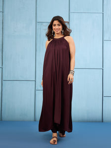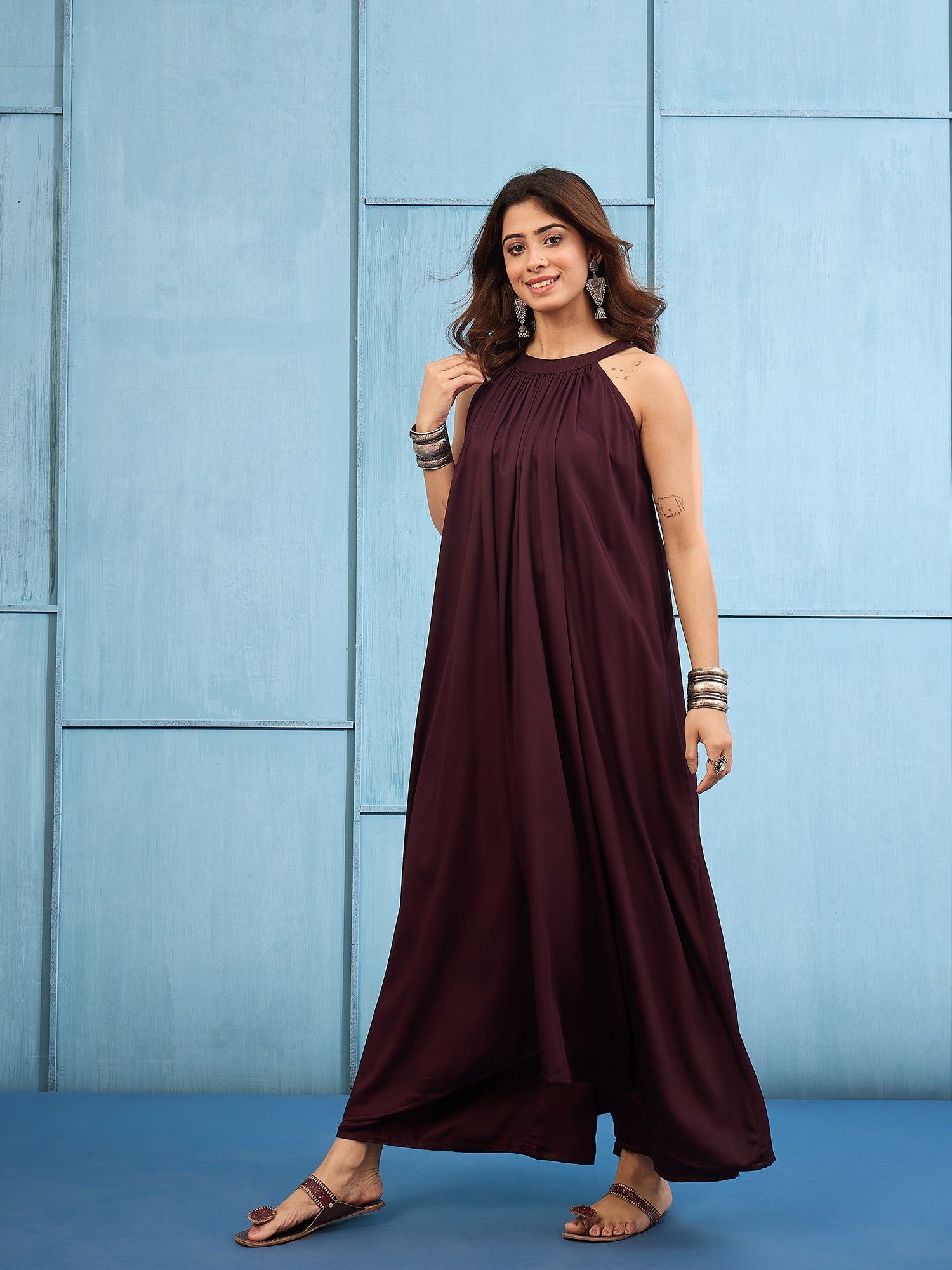 Elegant dark brown halter-neck top with matching palazzo pants. Made from soft fabric, it provides comfort and a sophisticated look, ideal for festive occasions or stylish evening wear.