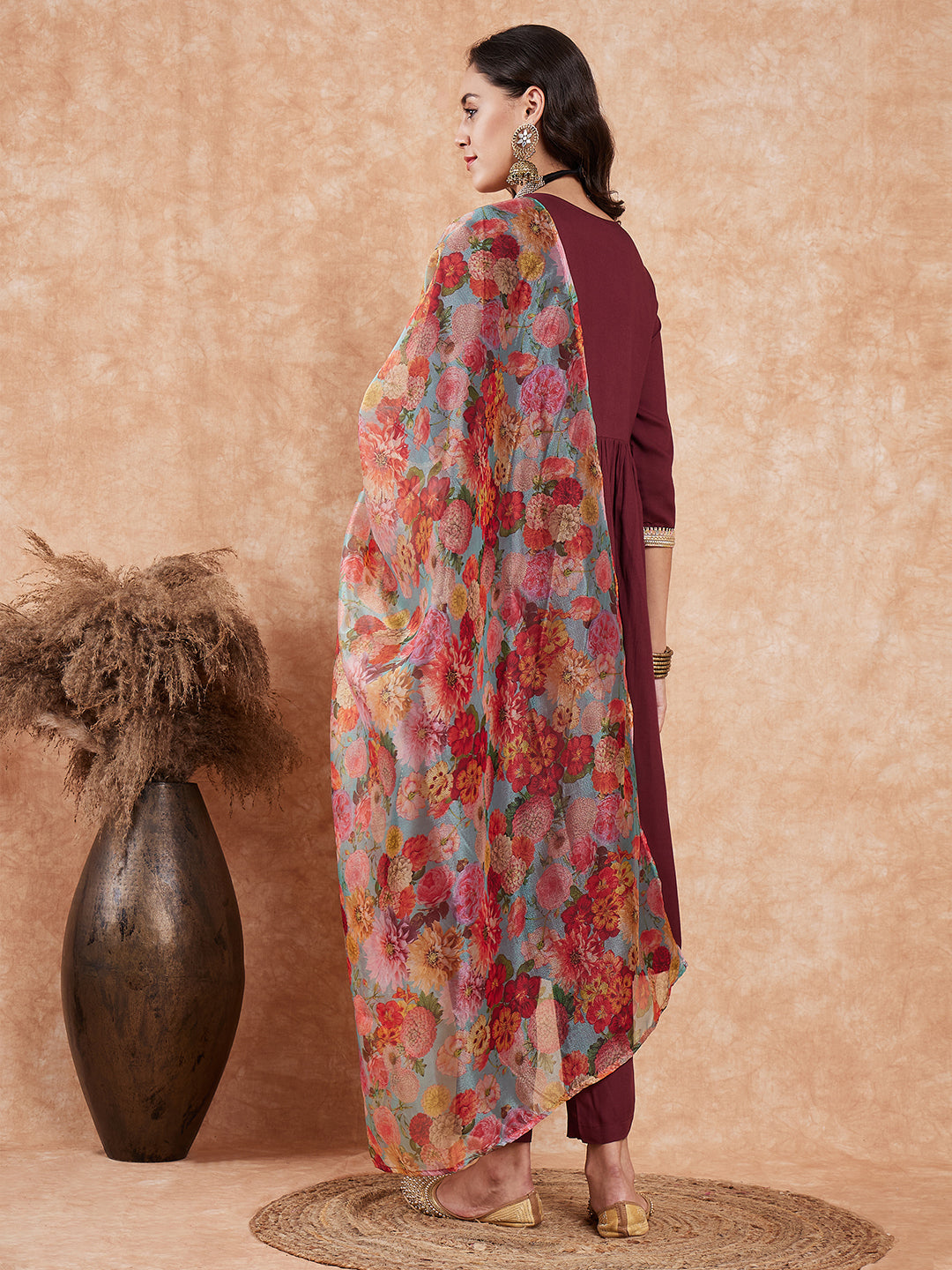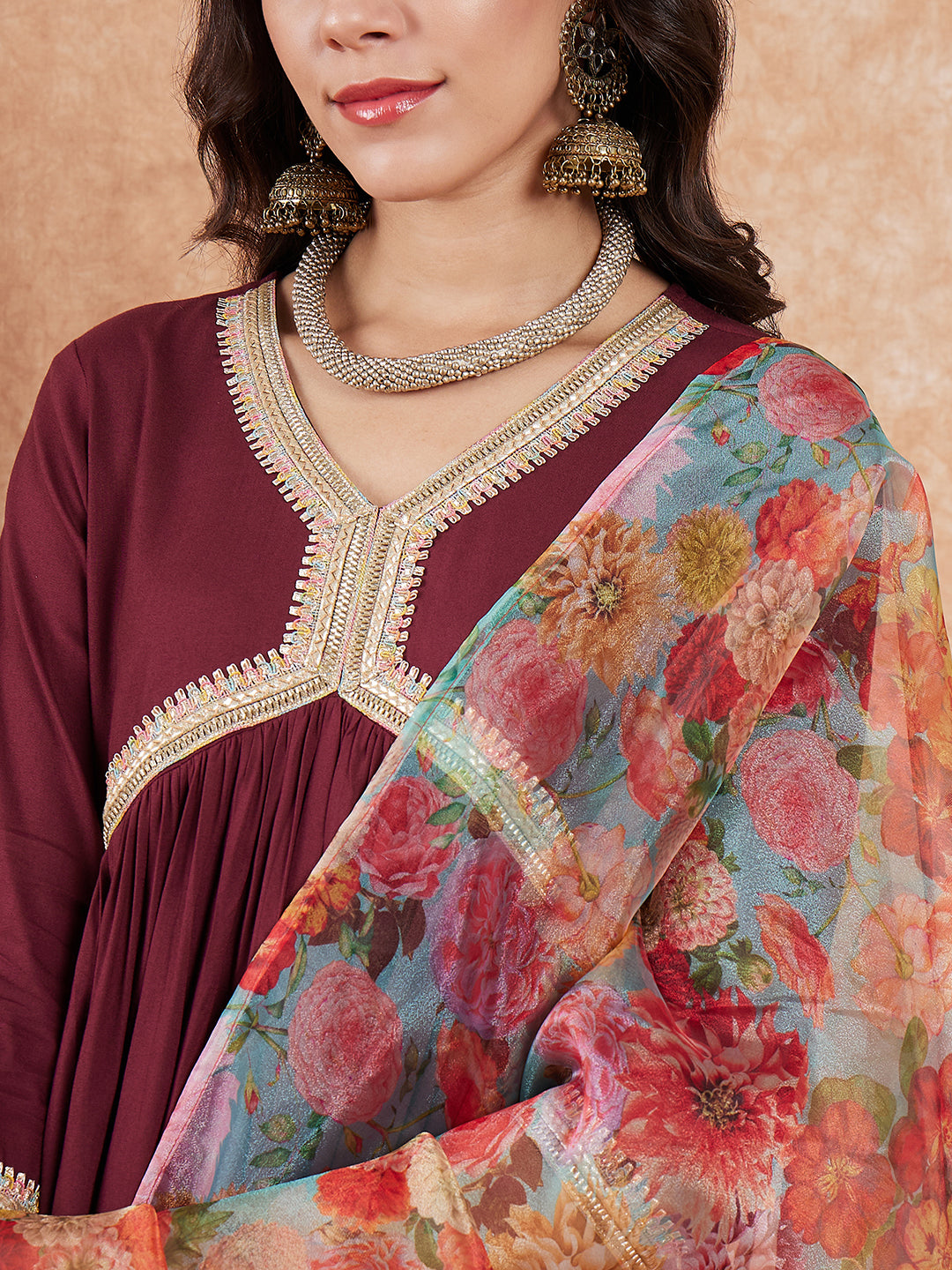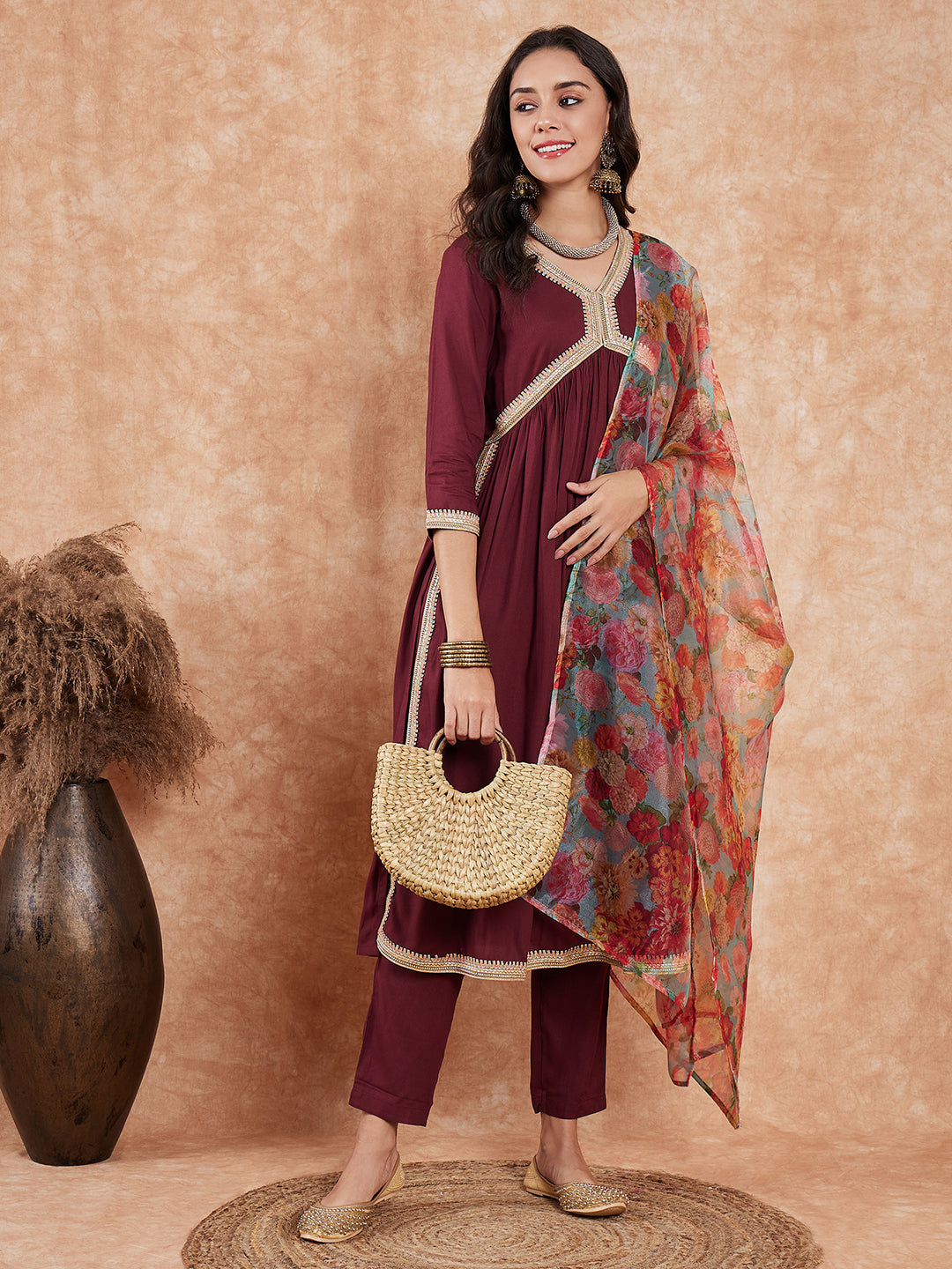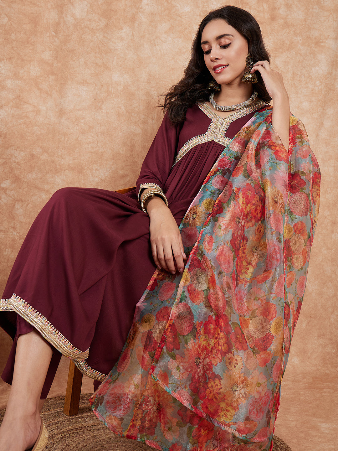 Dark Burgundy Alia Neck Style Gota Set W Organza Dupatta