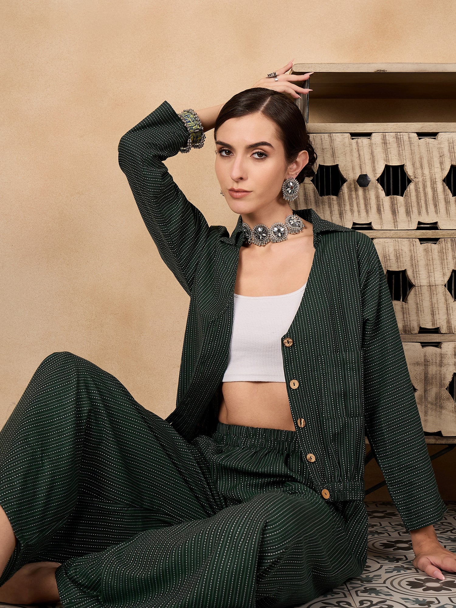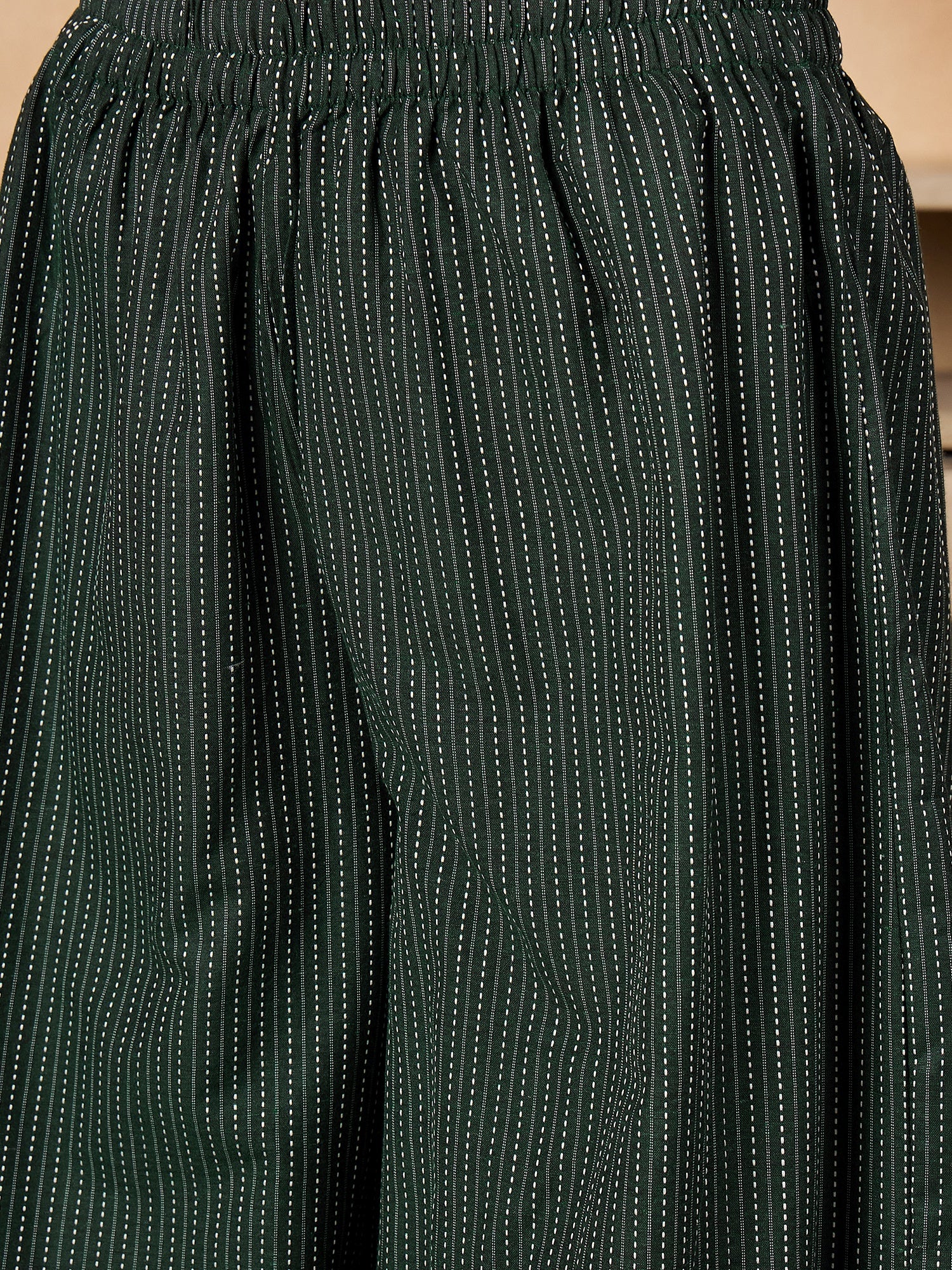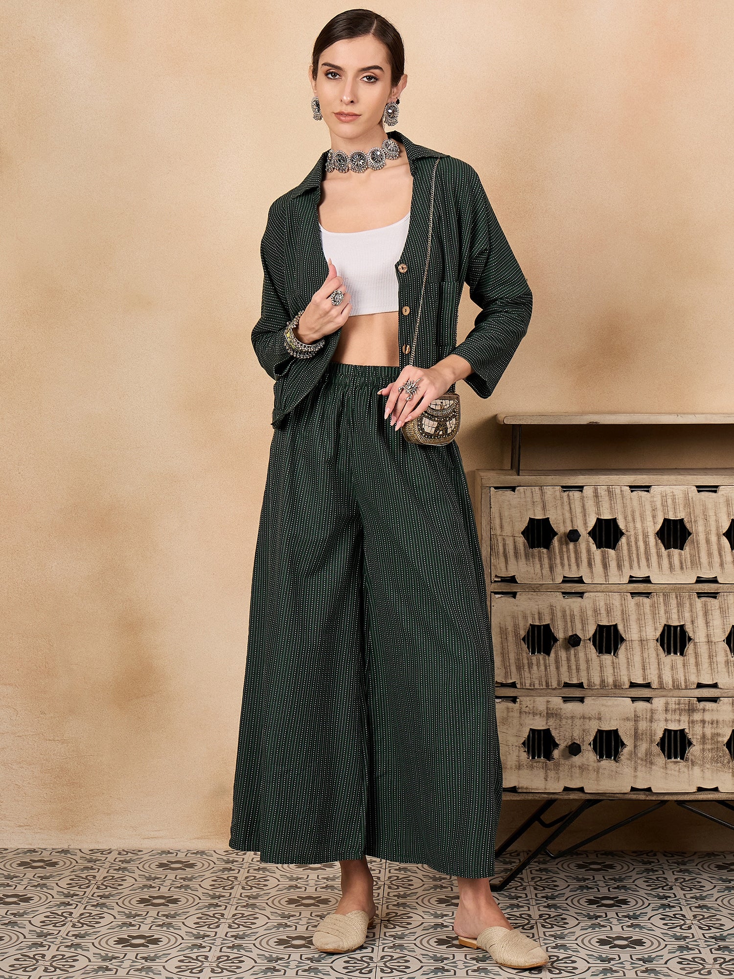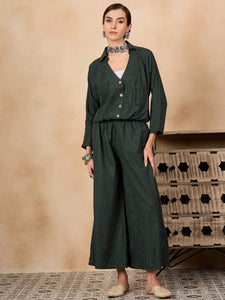 The Dark Green Kantha Johnny Neck Jacket Coord Set is a versatile ensemble featuring a rich dark green jacket with traditional Kantha stitch detailing and a Johnny neckline.
