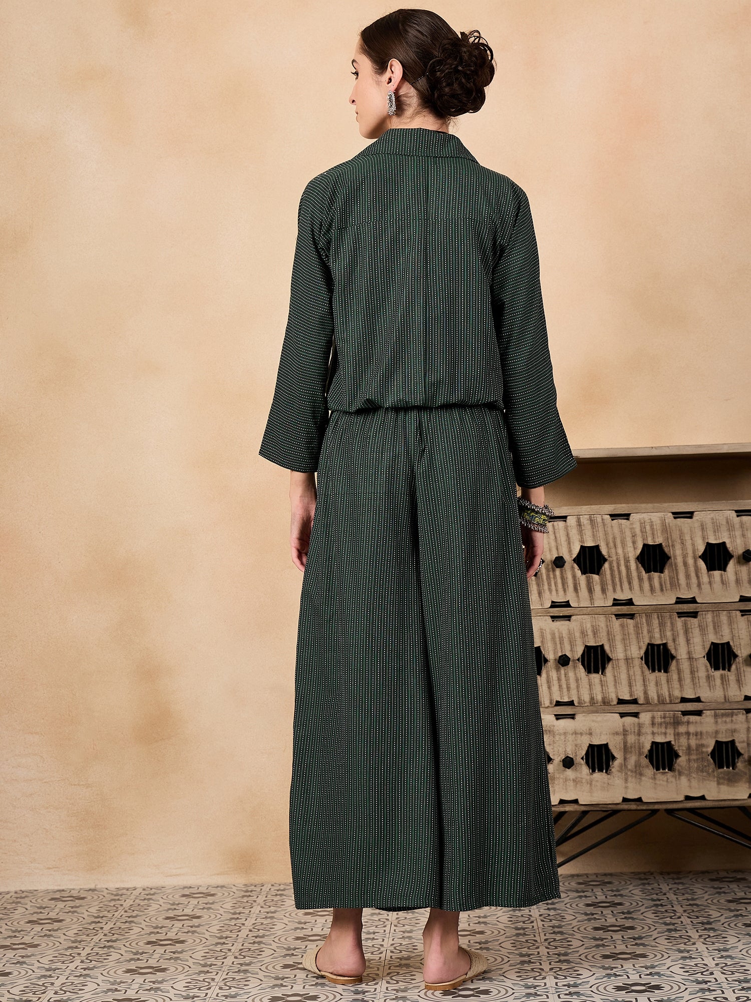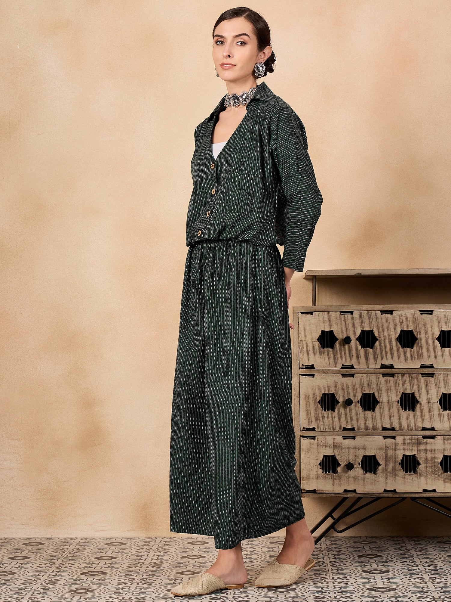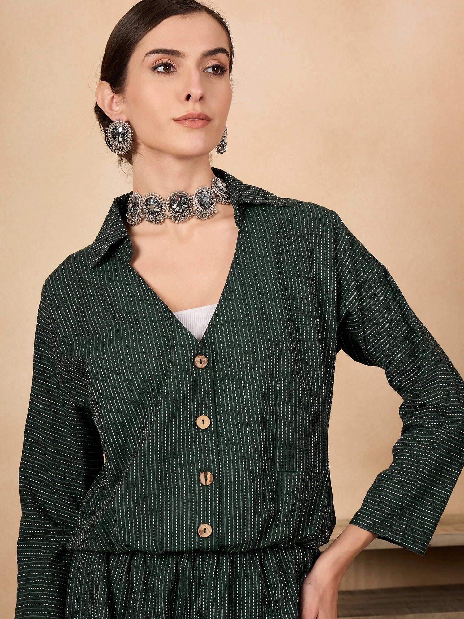 The Dark Green Kantha Johnny Neck Jacket Coord Set is a versatile ensemble featuring a rich dark green jacket with traditional Kantha stitch detailing and a Johnny neckline.