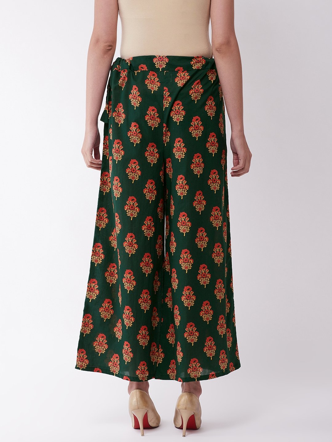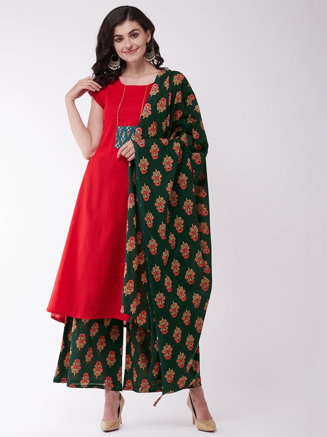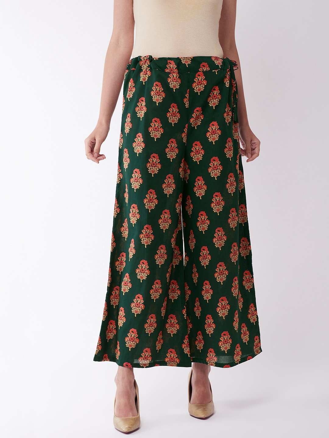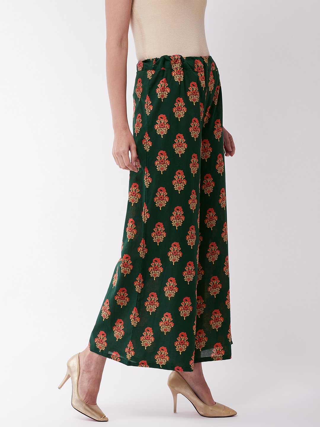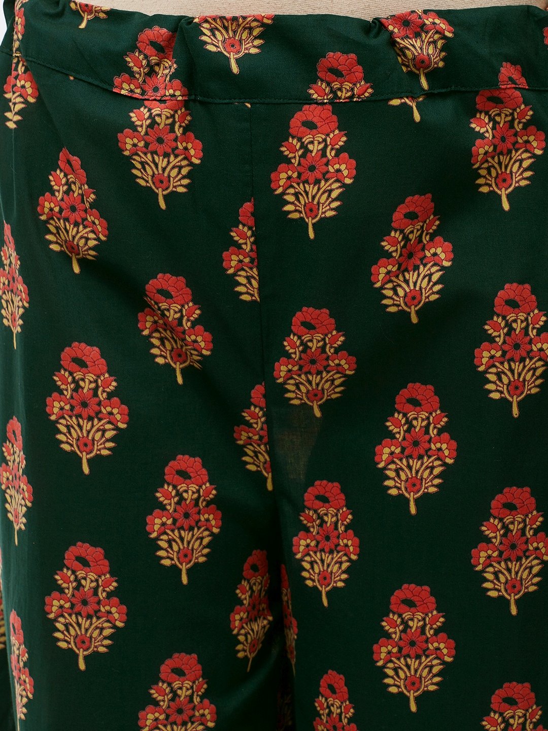 Heighten up your entire look in a jiffy with our dark green and red coloured Boota palazzos. Wear it with red kurta and open toe sandals.