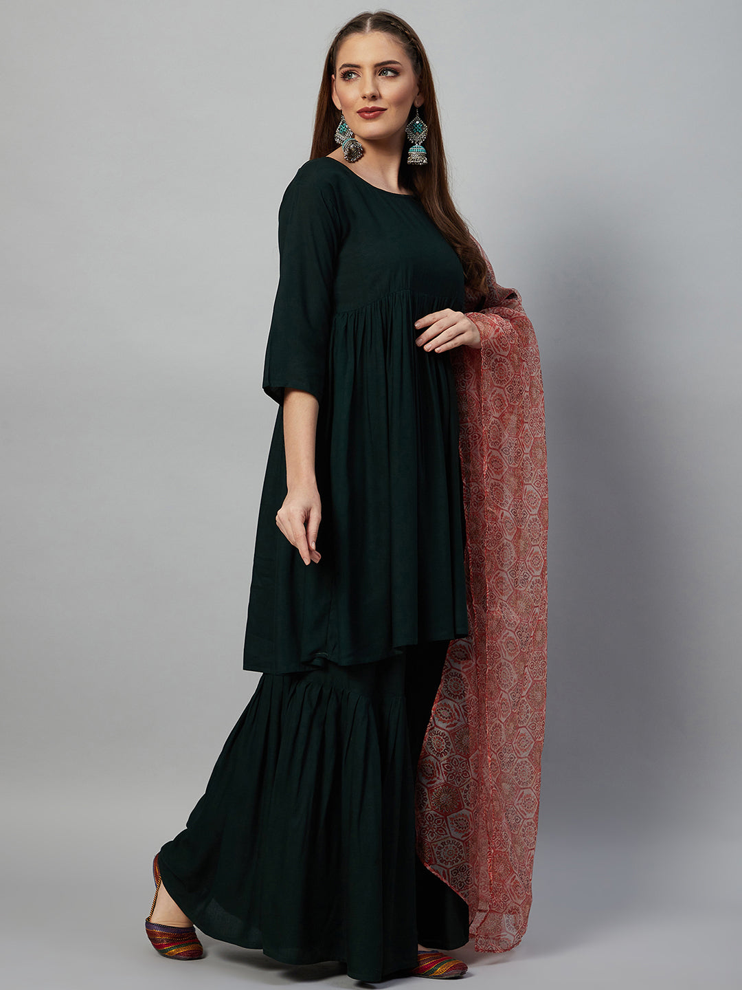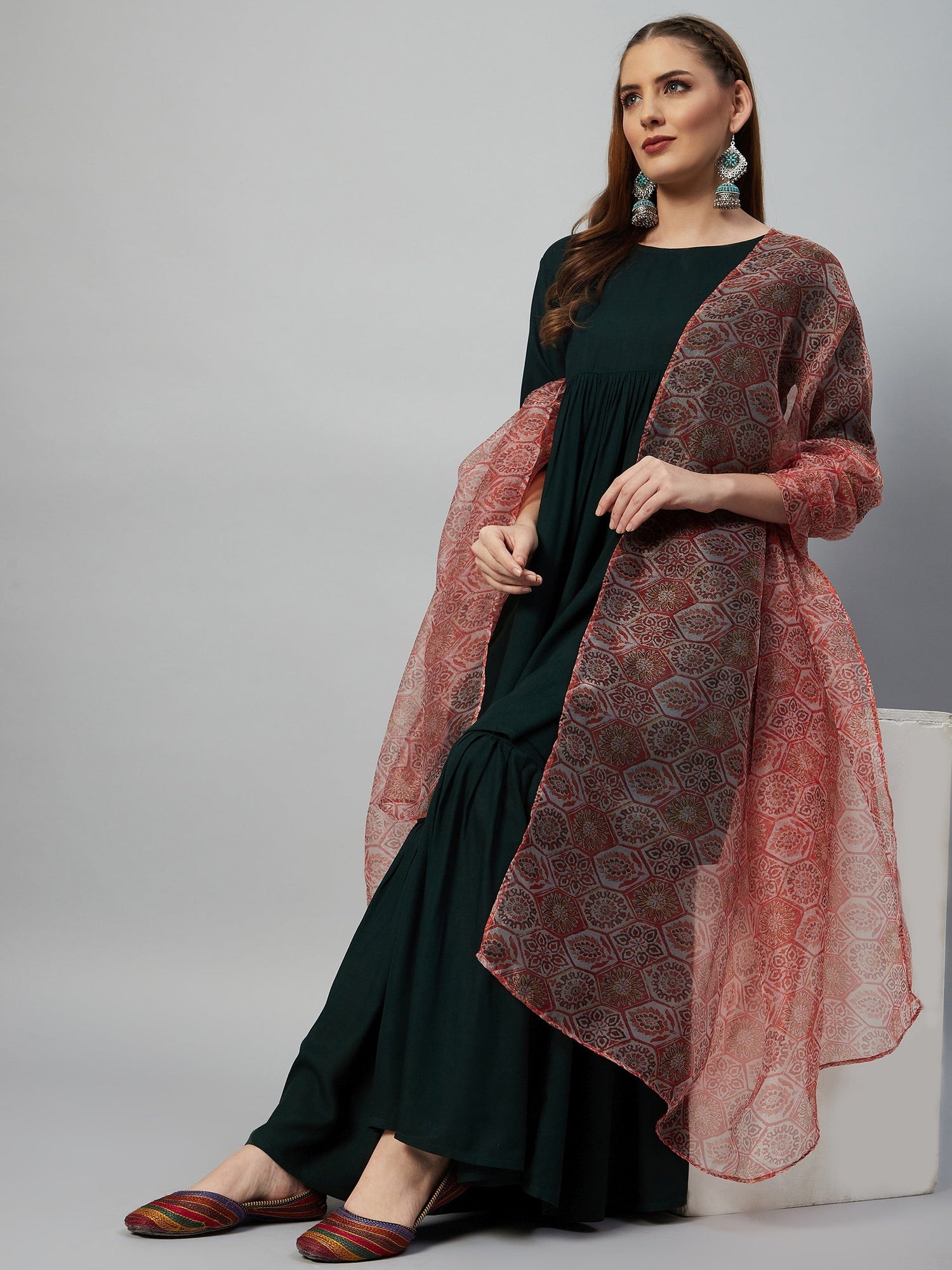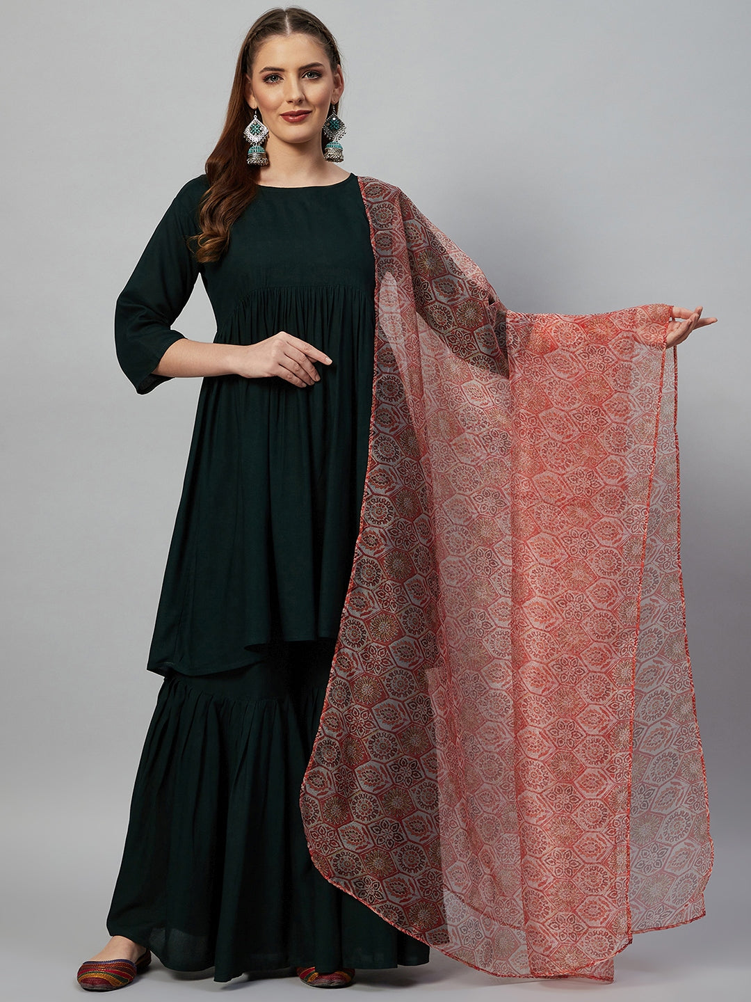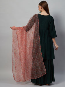Placeholder Dark Green Sharara Set - Orange Organza Dupatta - InWeave