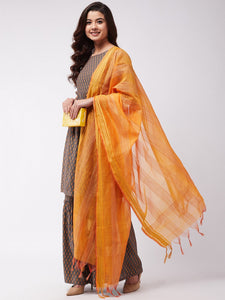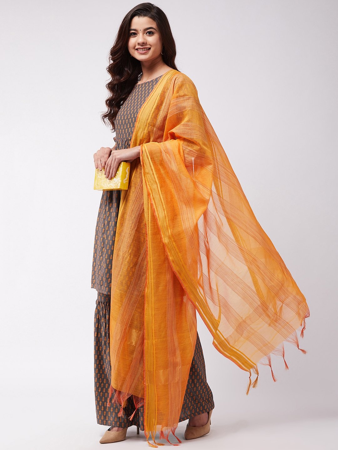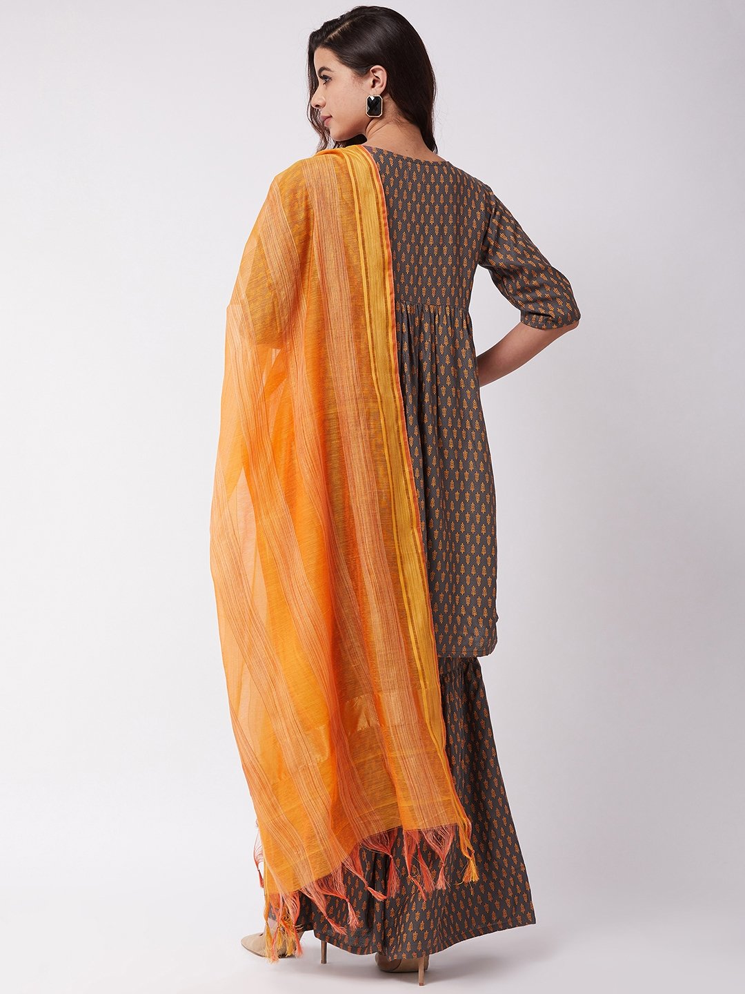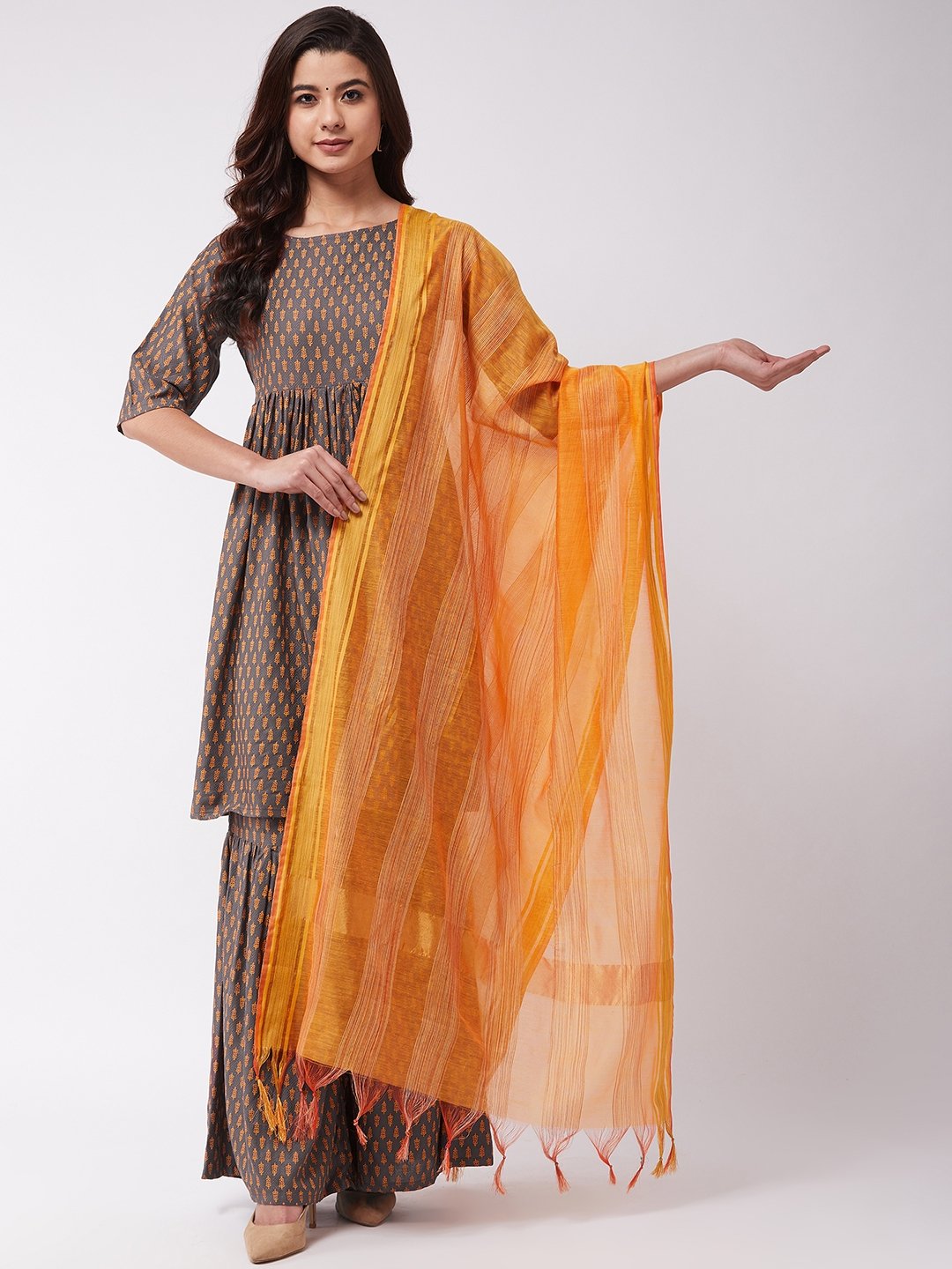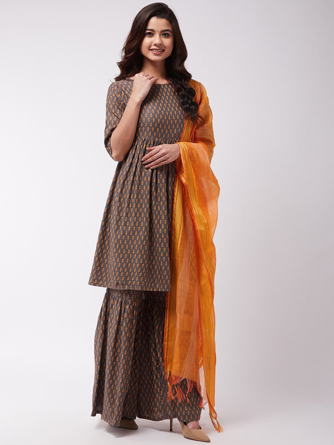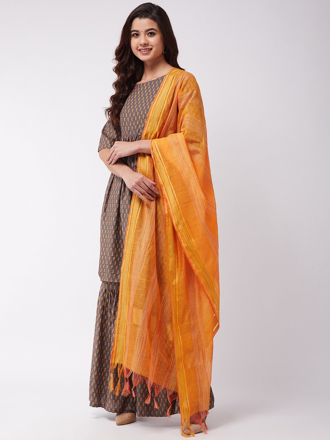 A stunning pick to flaunt for traditional events.This sharara suit set from InWeave makes a statement to your traditional wardrobe. Style this set with a pair of embellished juttis, super-sized earrings and a stylish clutch to complete the ensemble. Fabric used for Upper : Pure Cotton. Fabric used for Lower : Pure Cotton. Fabric used for Dupatta : Pure Cotton. Hand Wash Only Seperately.