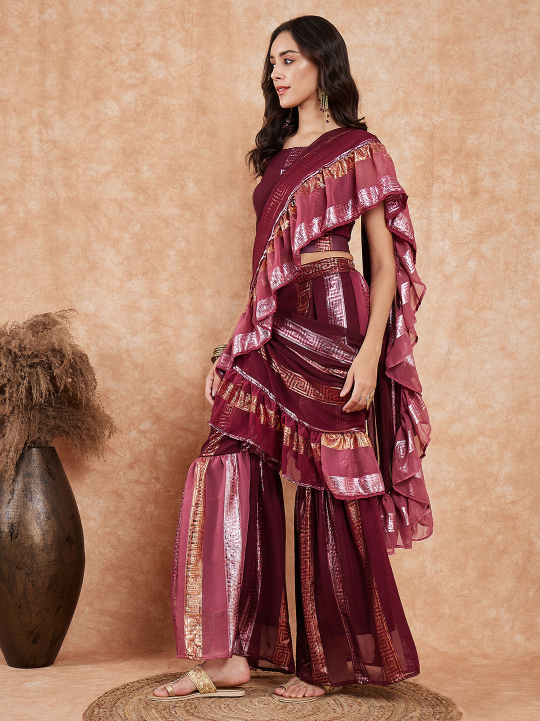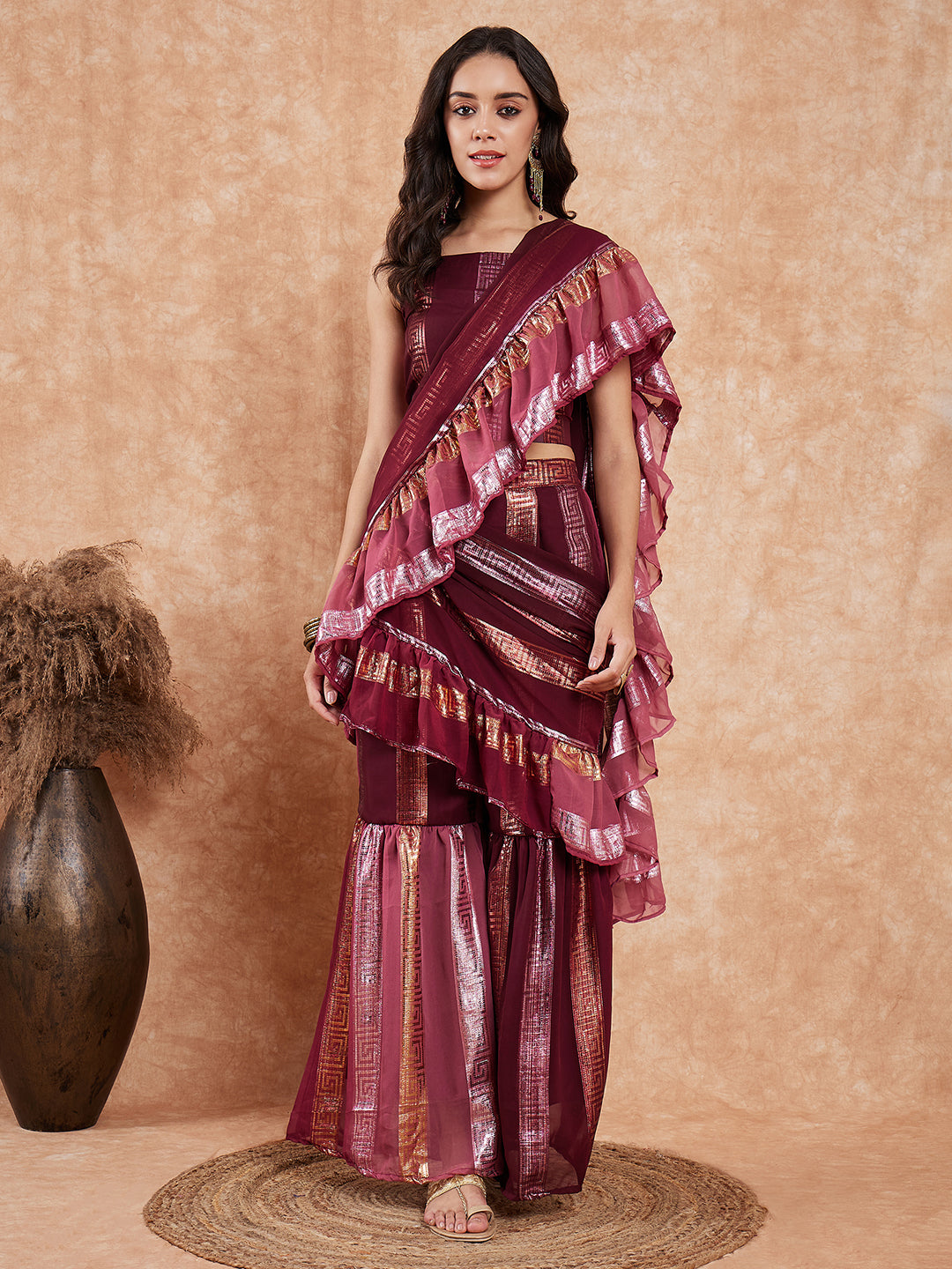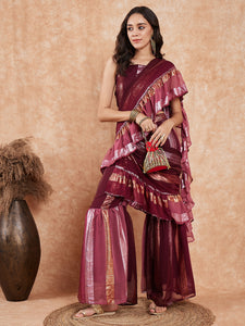 Nothing compares to the grace and elegance of wearing a Sharara Saree. This beautifully crafted Saree adds modernism to it and makes it nothing sort of a piece of art. Hand Wash Only Separately.