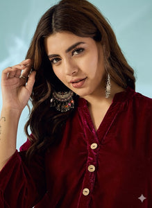 Rediscover classic elegance with this Dark Maroon Velvet Salwar Kurta Set. Featuring a timeless straight-cut kurta paired with traditional salwar bottoms, this ensemble blends heritage charm with contemporary richness.