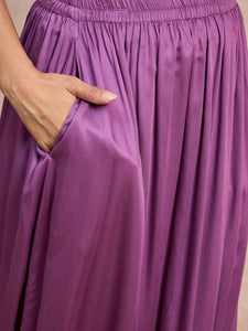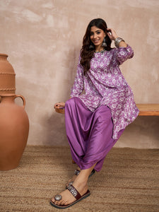Elegant dark mauve kurta with a boat neckline and foil embellishments, paired with a flowing dhoti for regal ethnic style.