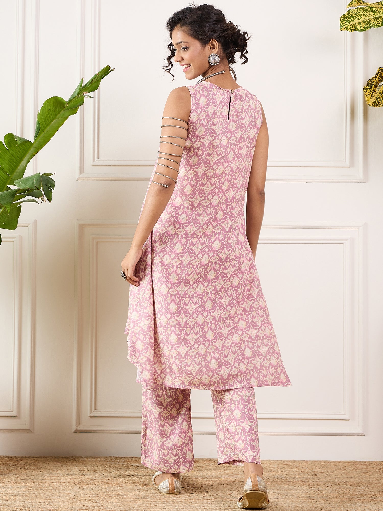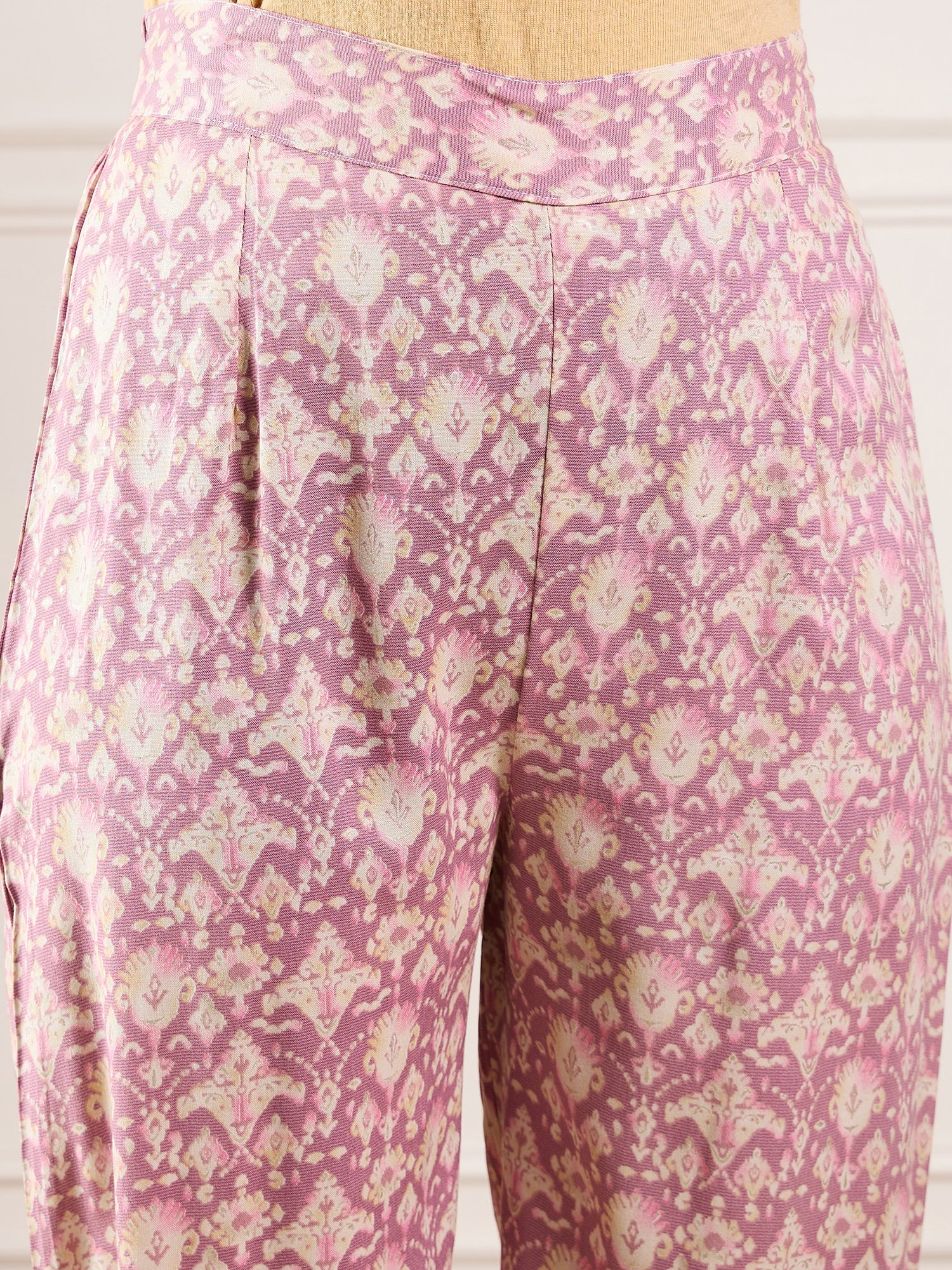 Dusty Pink Ikkat Print Foil Round Neck Kurta Pant Set