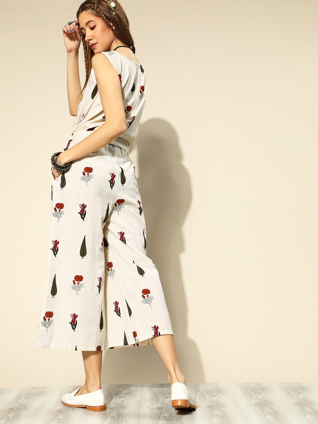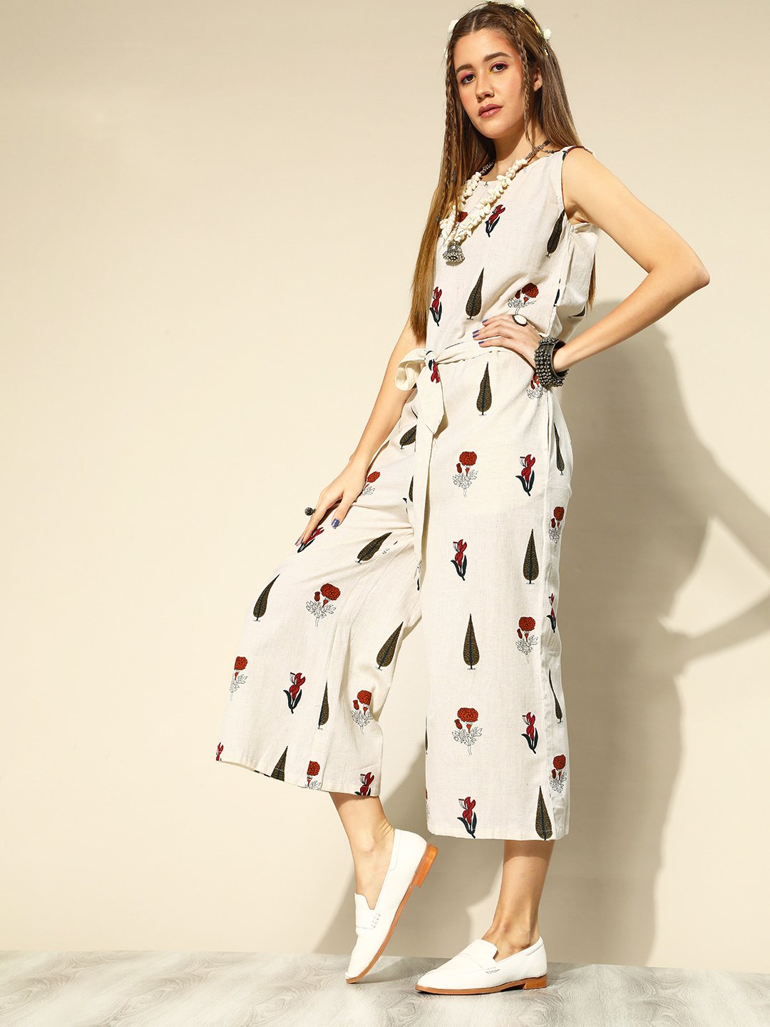 Off-white printed culotte jumpsuit with waist tie-ups ,has a round neck, sleeveless, 2 pockets Fabric used : Cotton. Hand Wash Separately