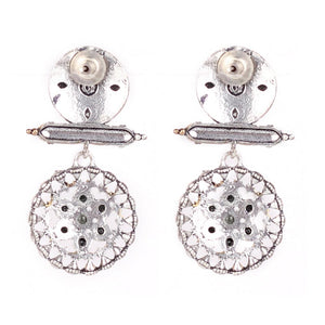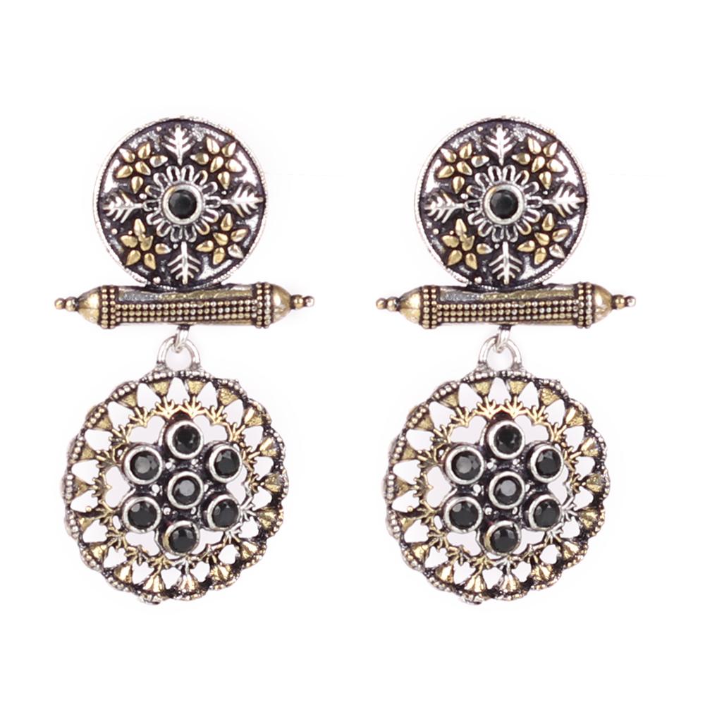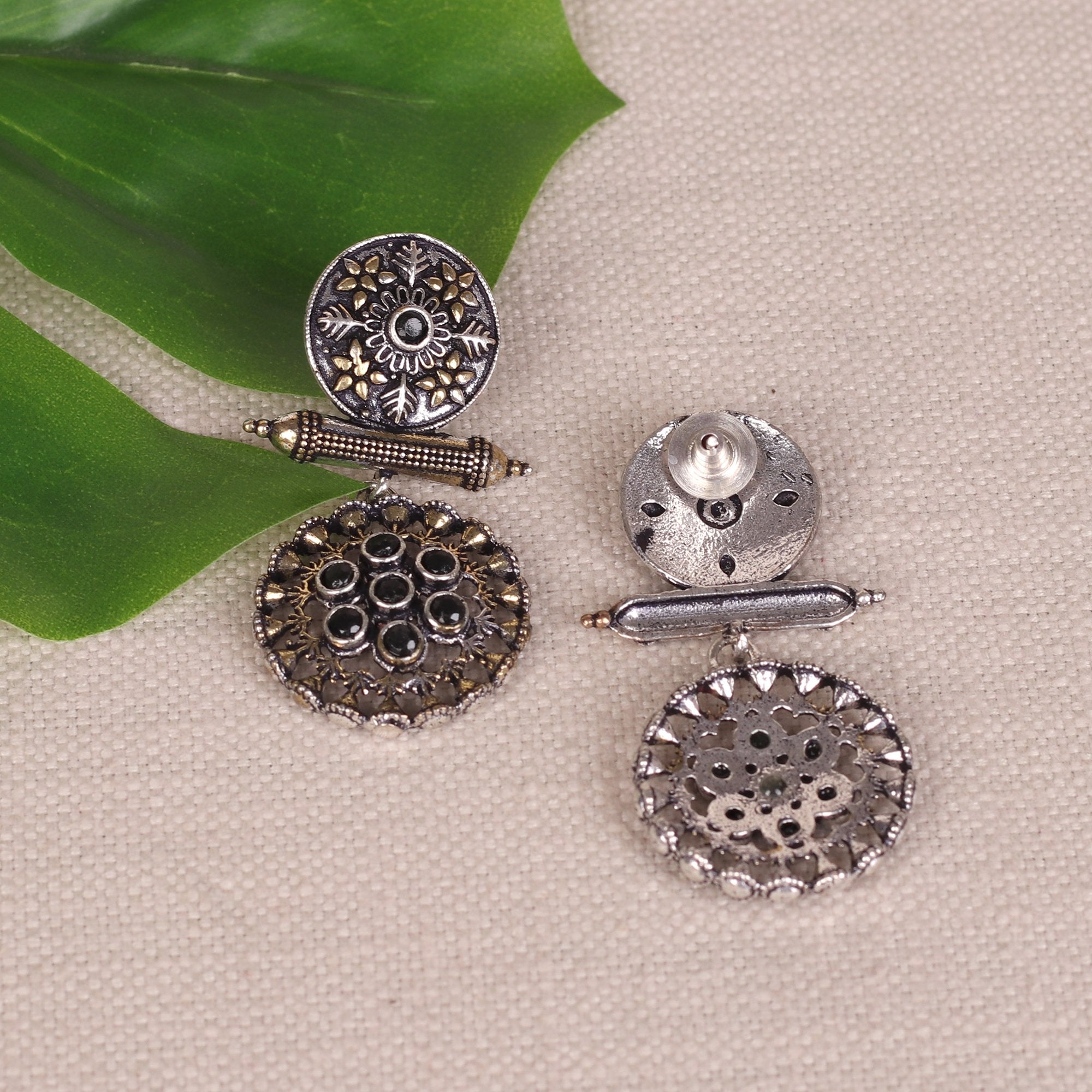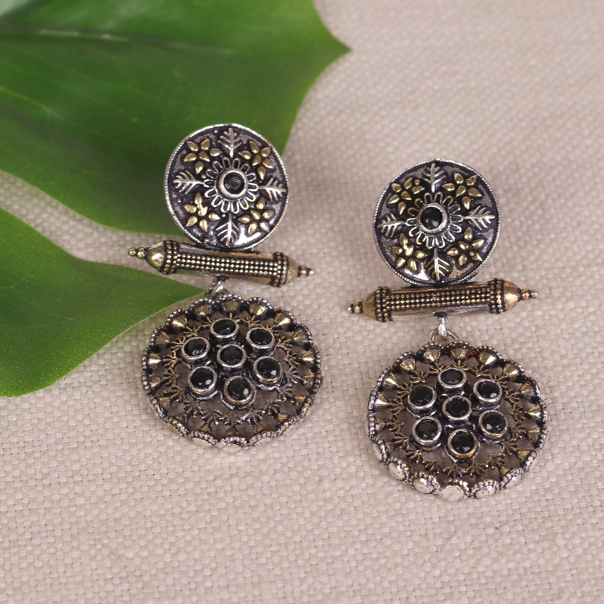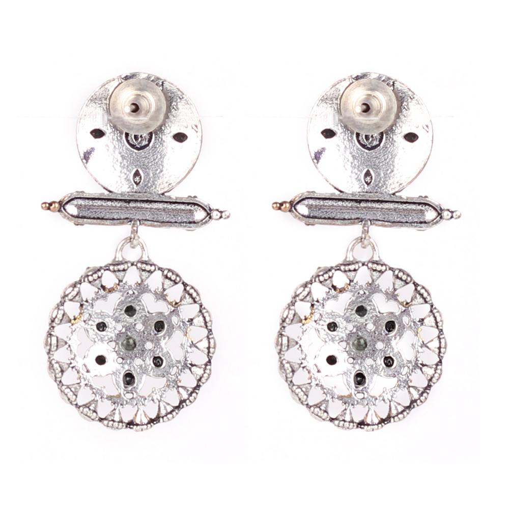 Add an elegant note to your occasion wear ensembles with these exquisite statement earrings. Handcrafted in german silver and with oxidized silver plating, these delicate and light weight stunners pair well with your Kurtas, Sarees or even add a pop of color to your white shirt & denim look
