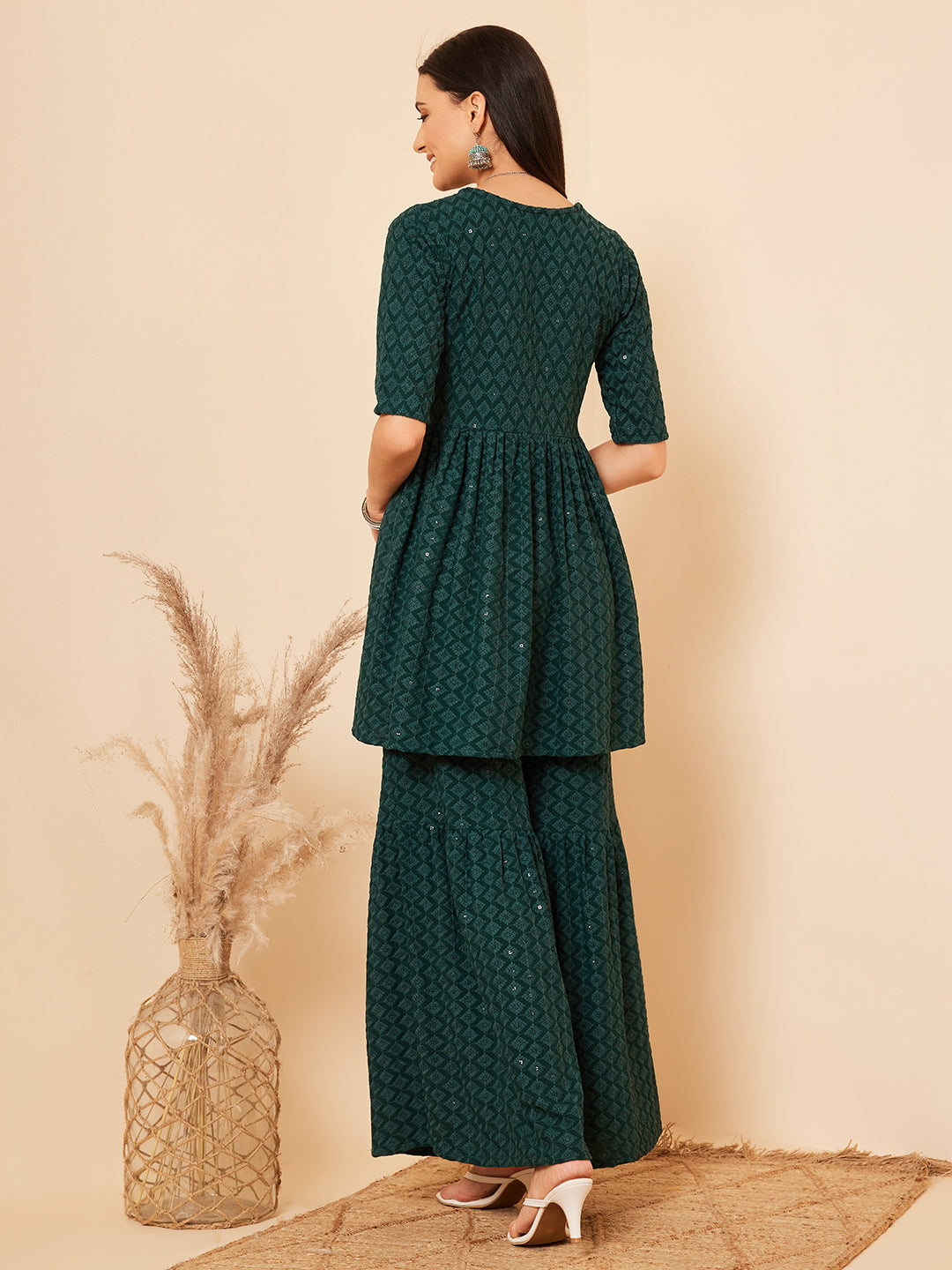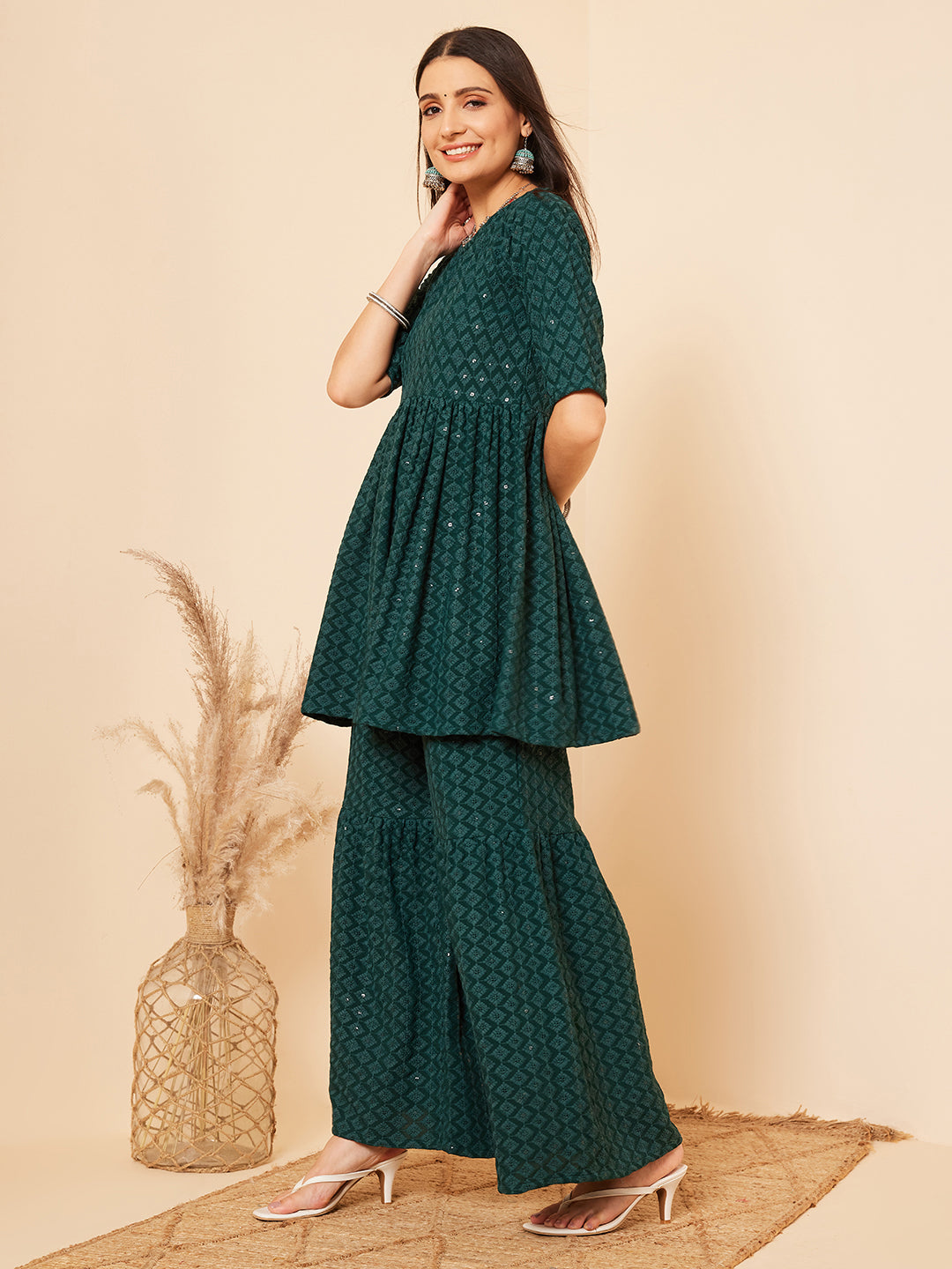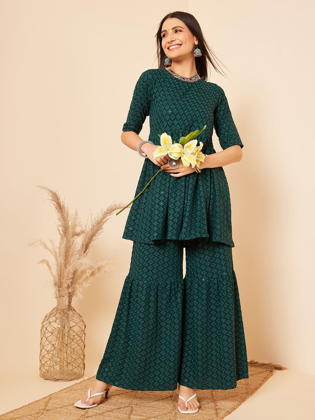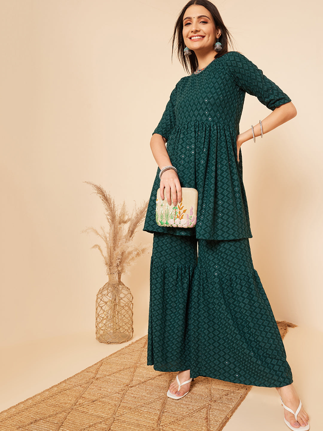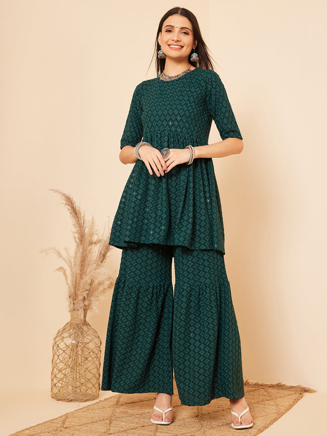 The Set is crafted from best of Indian fabrics. Style it with Oxidised jewelery and juttis and you are good to go for any outing Hand Wash Only Seperately.