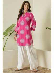 Fuchsia circle print kurta styled with white salwar, featuring vibrant color, elegant design, and comfortable fit, ideal for festive occasions and traditional celebrations.