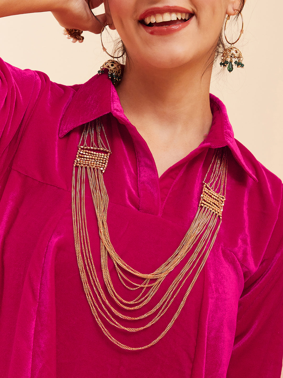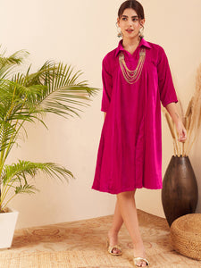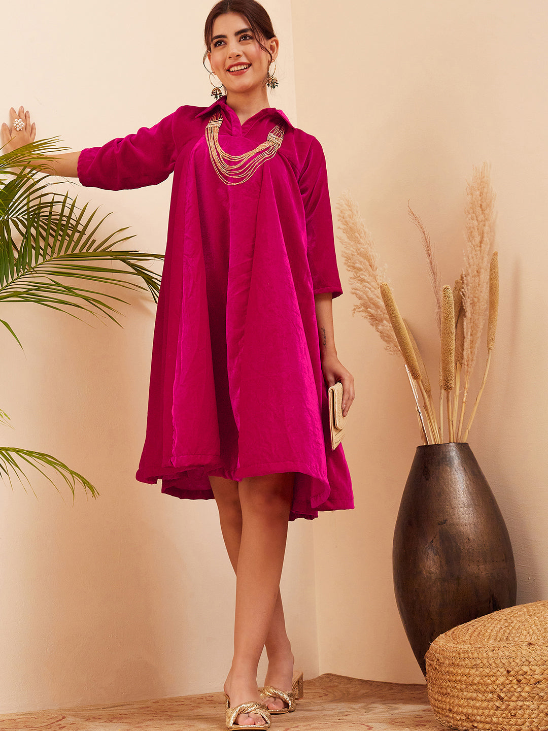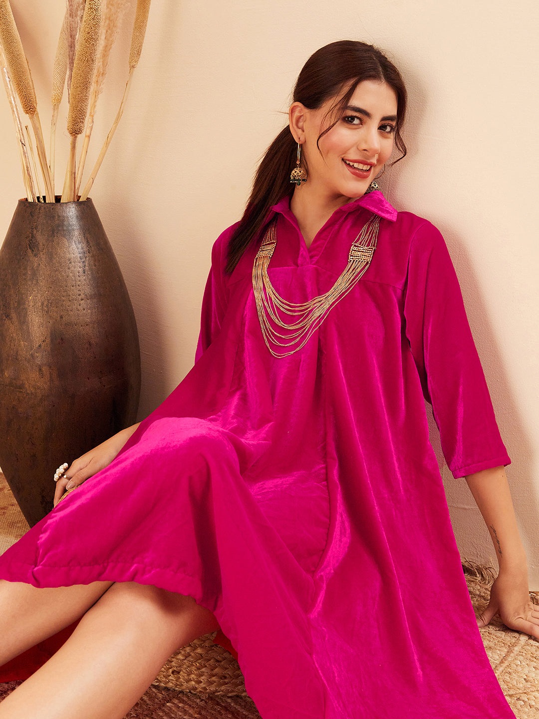 Fuchsia Velvet Collared Neck Flared Midi Dress
