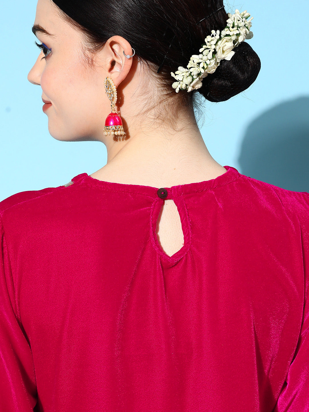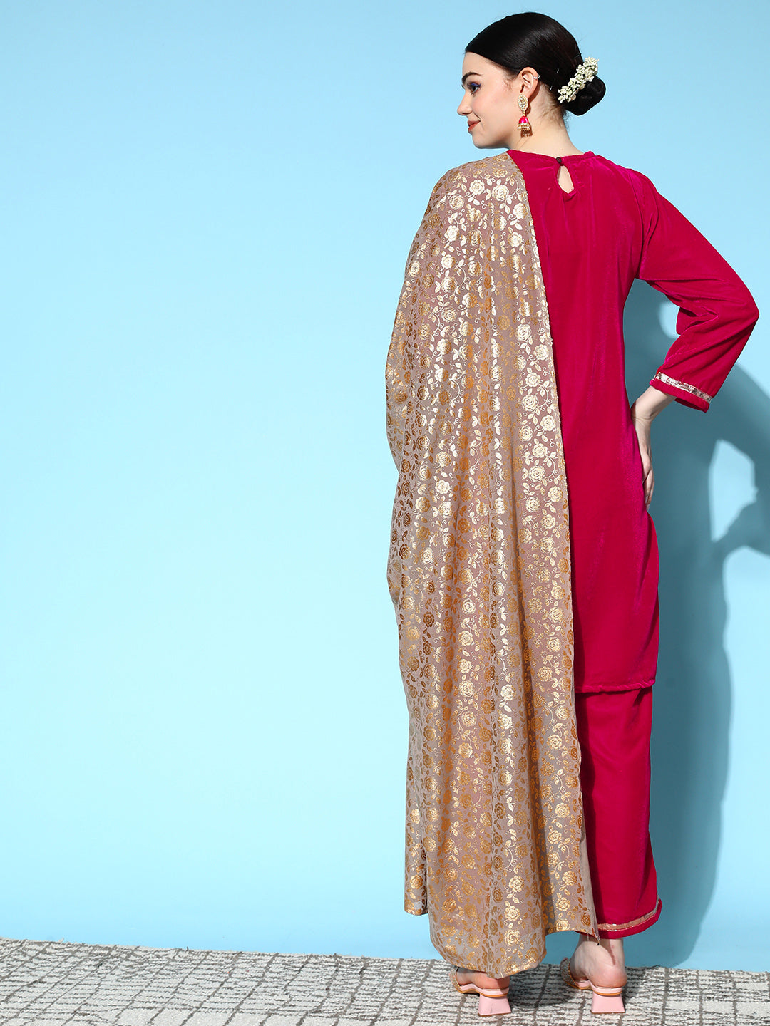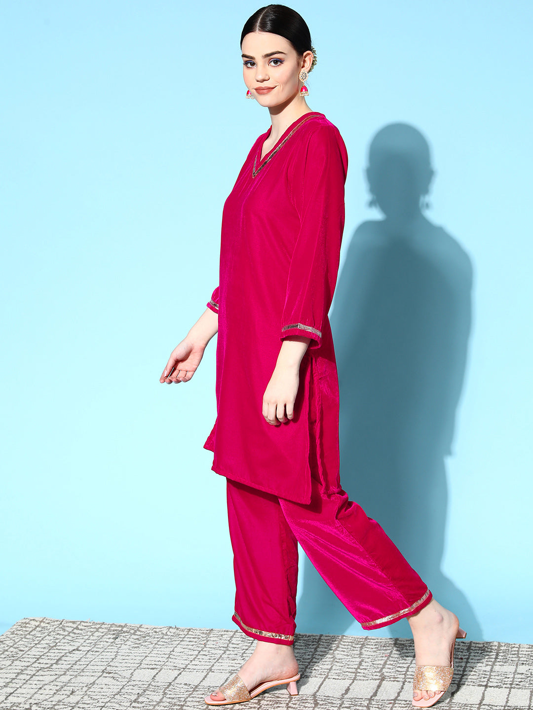 The Set is crafted from best of Velvet. Style it with Oxidised Jewelery and Juttis and you are good to go for any outing Fabric for Top : Velvet. Fabric for Bottom : Velvet. Dry Clean Only