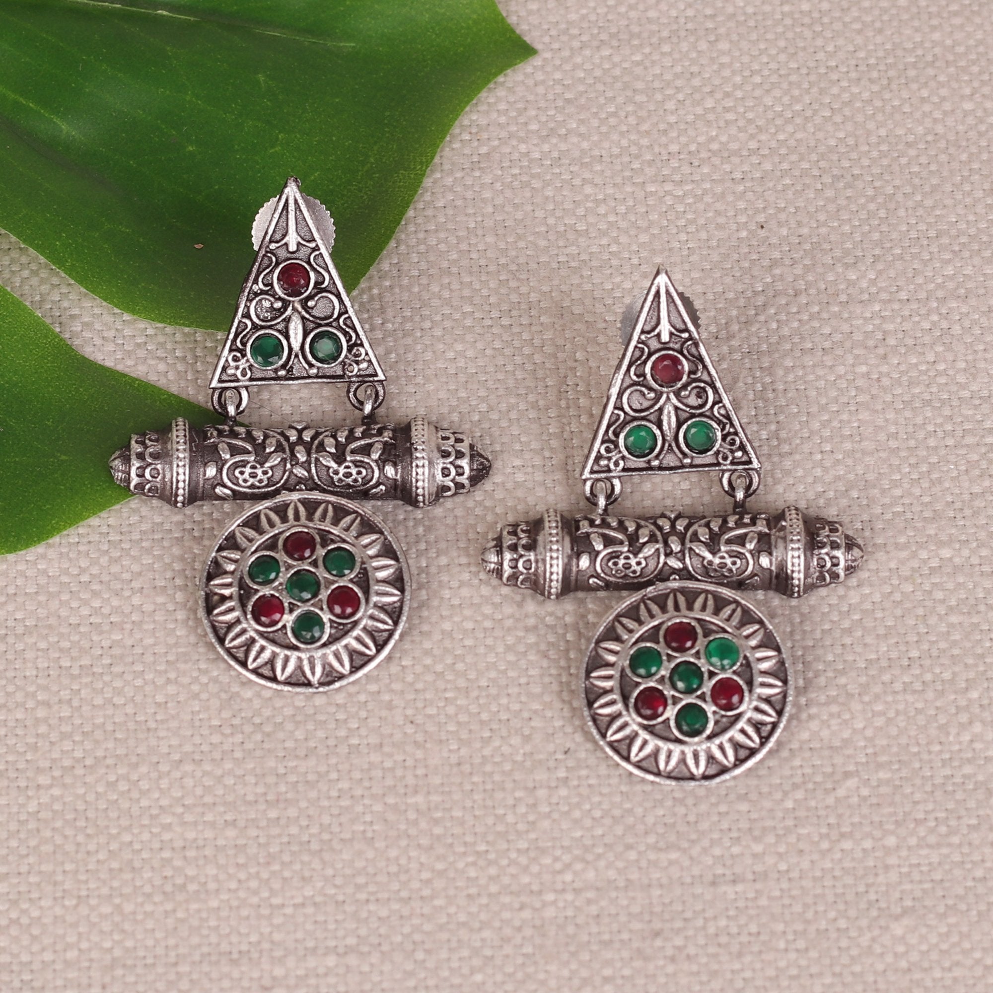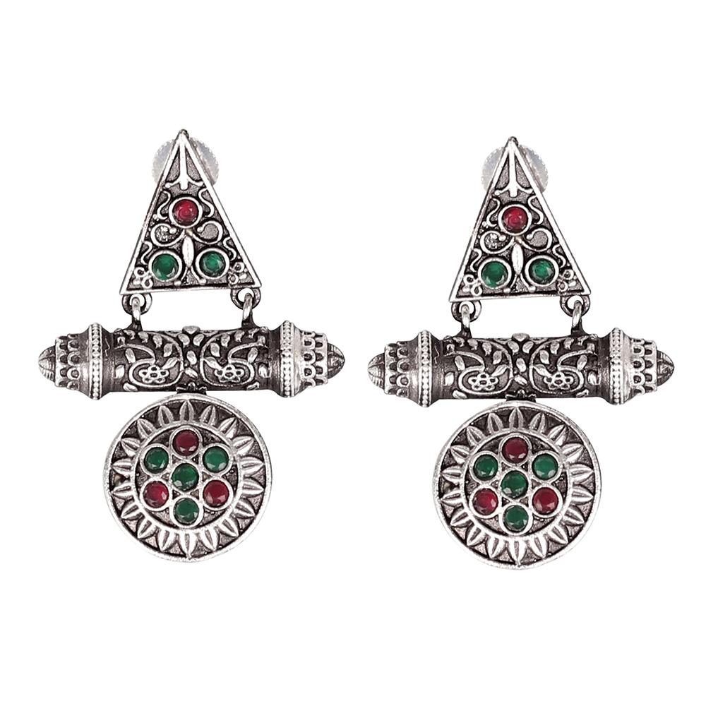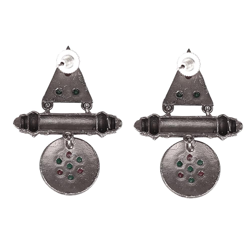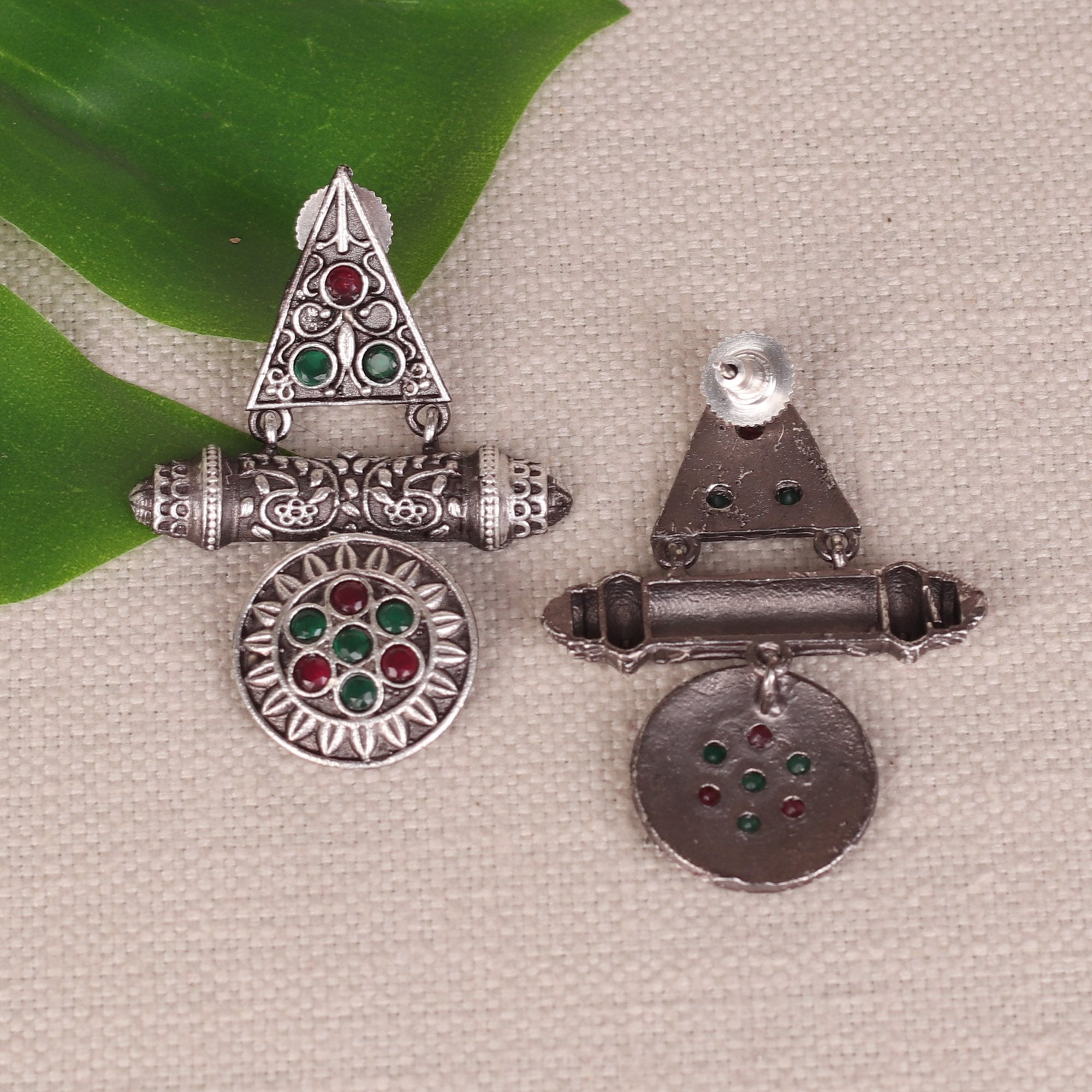Add an elegant note to your occasion wear ensembles with these exquisite statement earrings. Handcrafted in german silver and with oxidized silver plating, these delicate and light weight stunners pair well with your Kurtas, Sarees or even add a pop of color to your white shirt & denim look