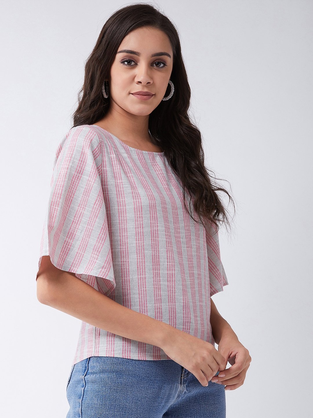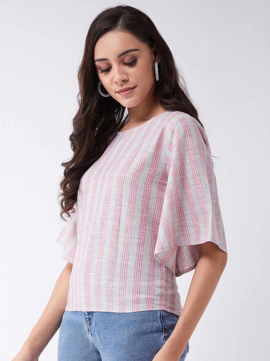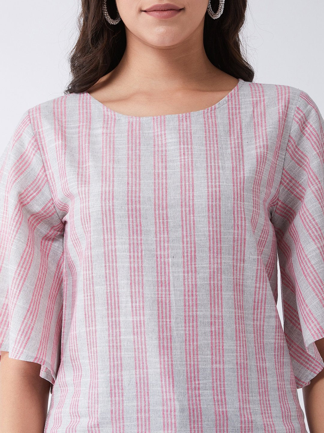 Make heads turn by wearing this gray and pink coloured handloom top from InWeave. This blouse features bell sleeves, gray stripes and round neckline.