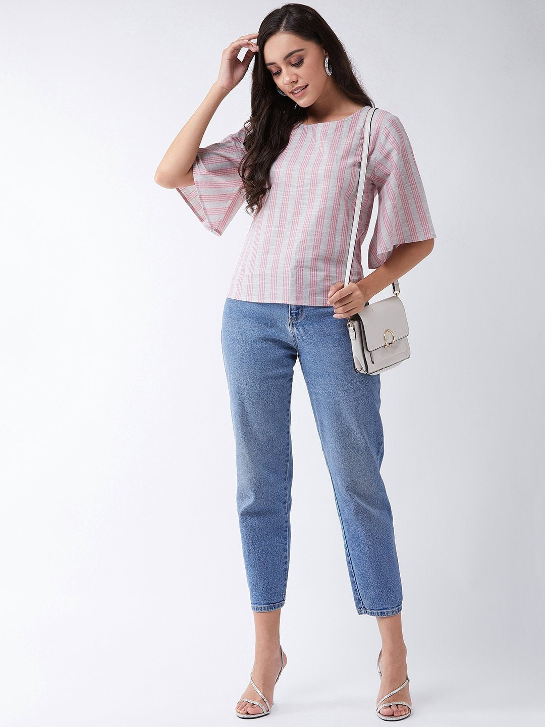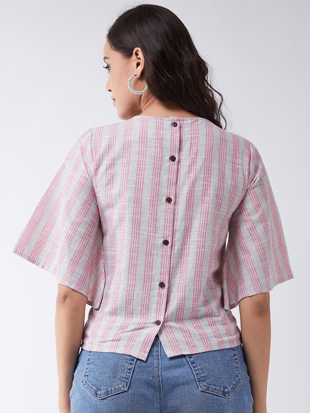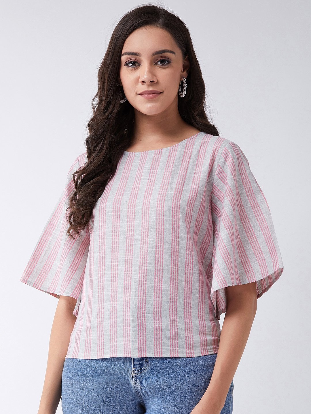Make heads turn by wearing this gray and pink coloured handloom top from InWeave. This blouse features bell sleeves, gray stripes and round neckline.