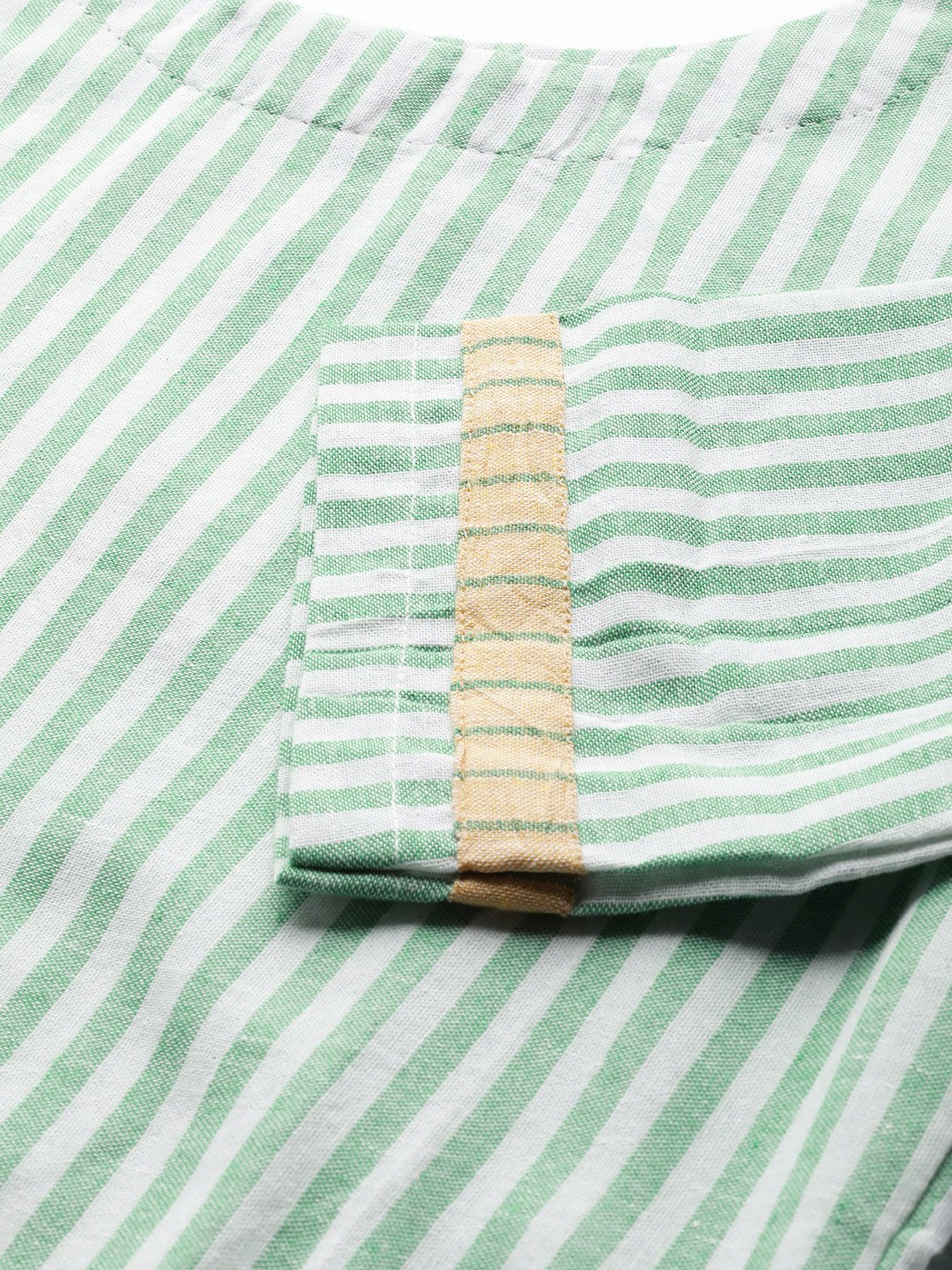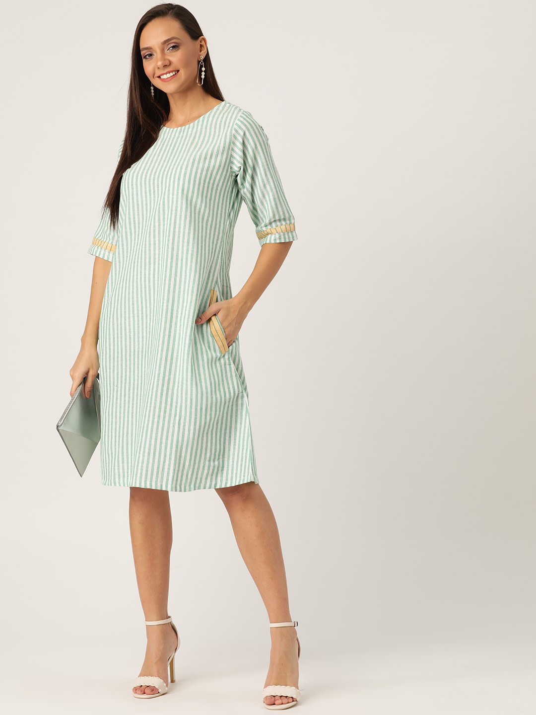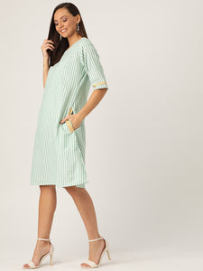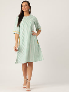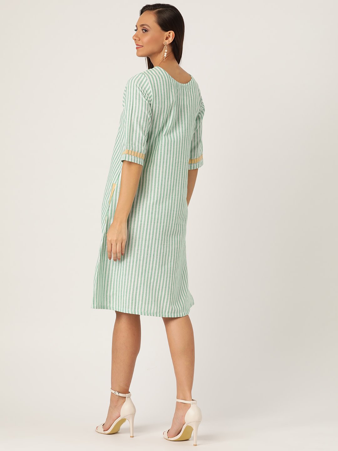 Green and white striped woven A-line dress, has a round neck, three-quarter sleeves, two side pockets and straight hem with side slits
