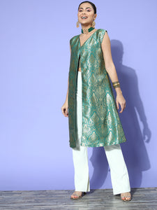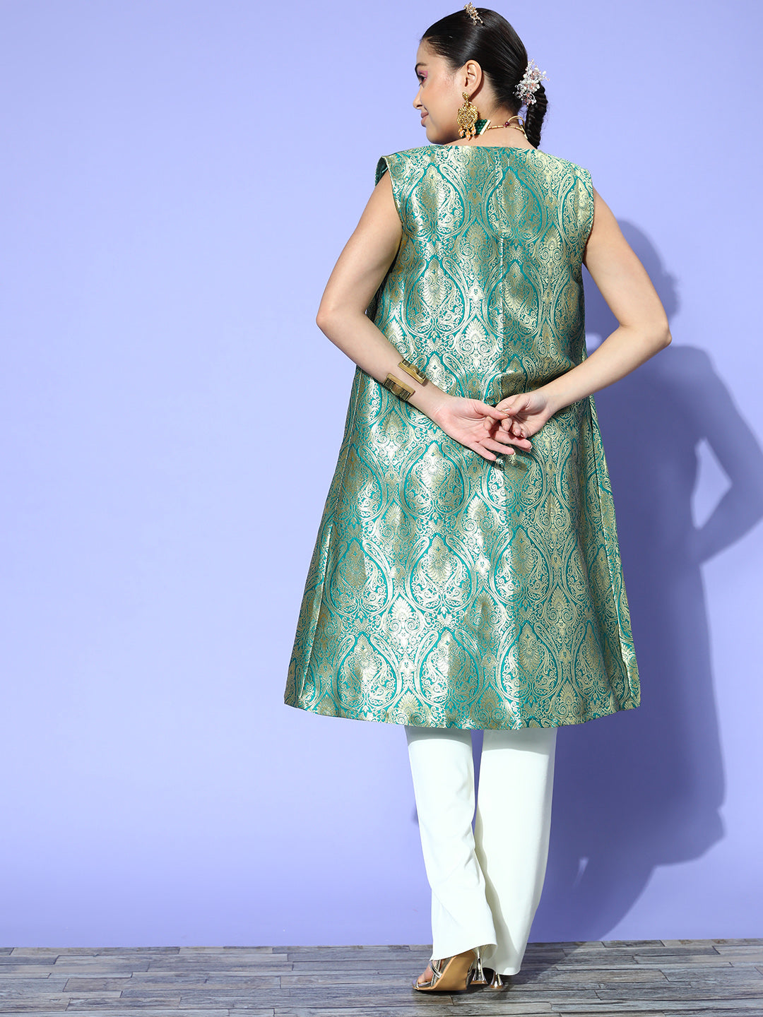 Layer with this sophisticated jacket to give your ensemble a chic touch. Designed with a self-design print and collarless design, this jacket will lend you contemporary appeal.