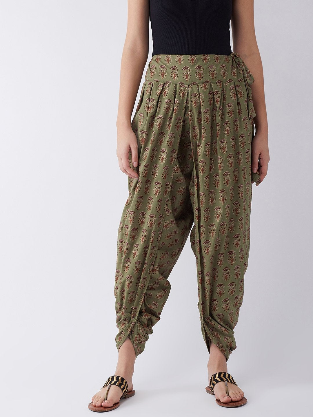 If you are an ethic fashion connoisseur, this green coloured dhoti with ethnic motifs will surely lock your attention. Wear this with short tunics and jhumkis.