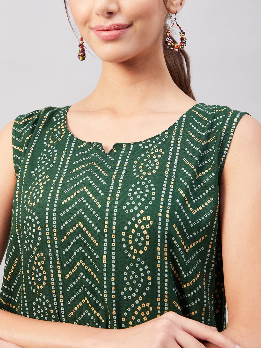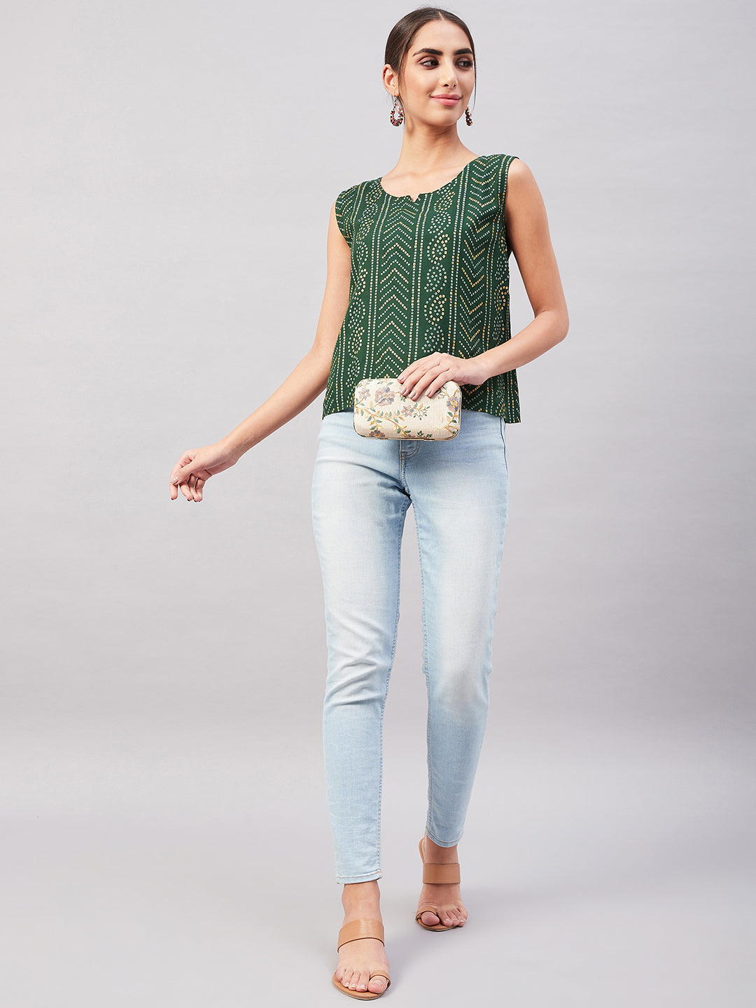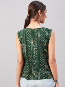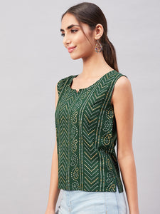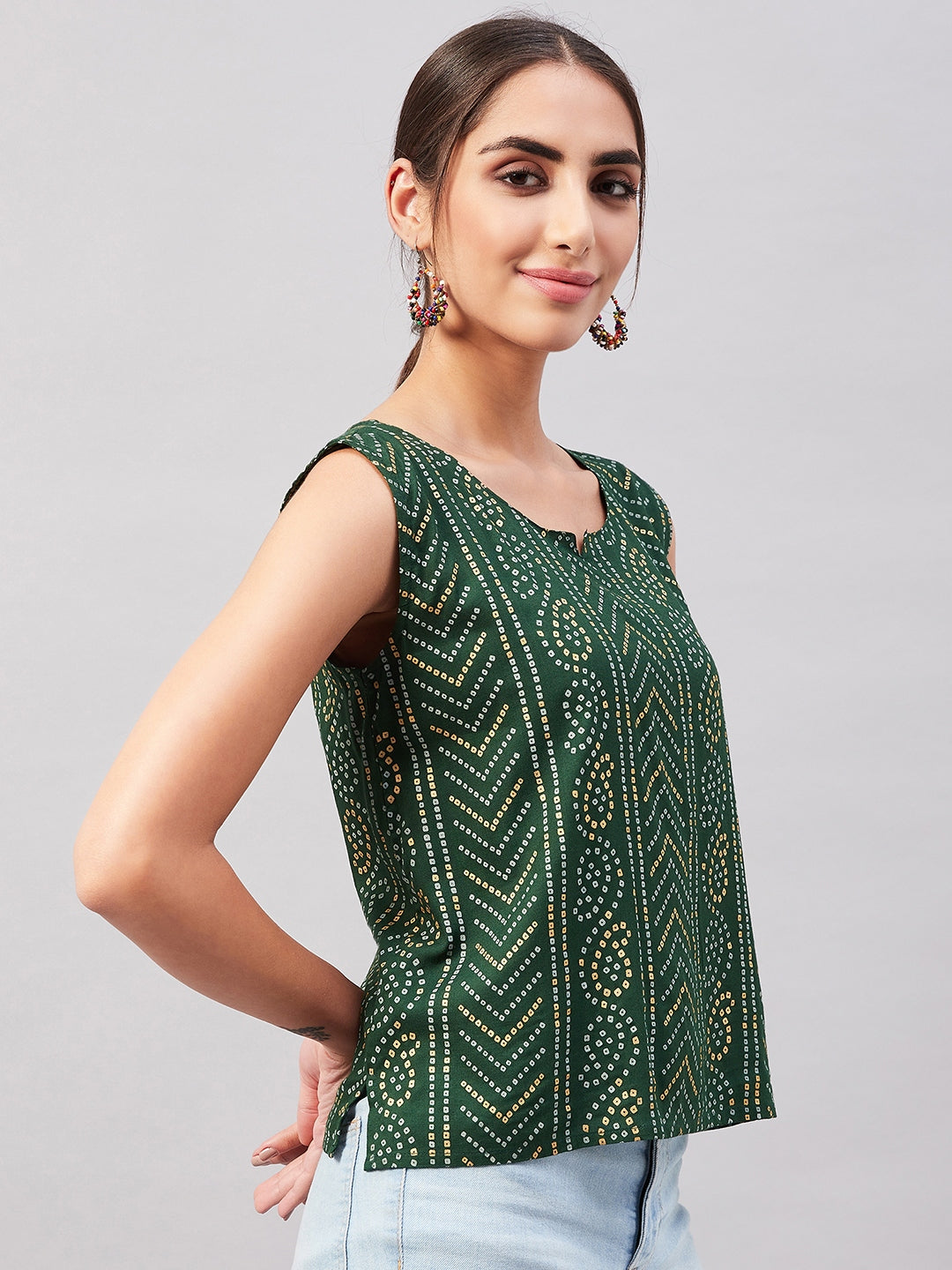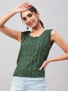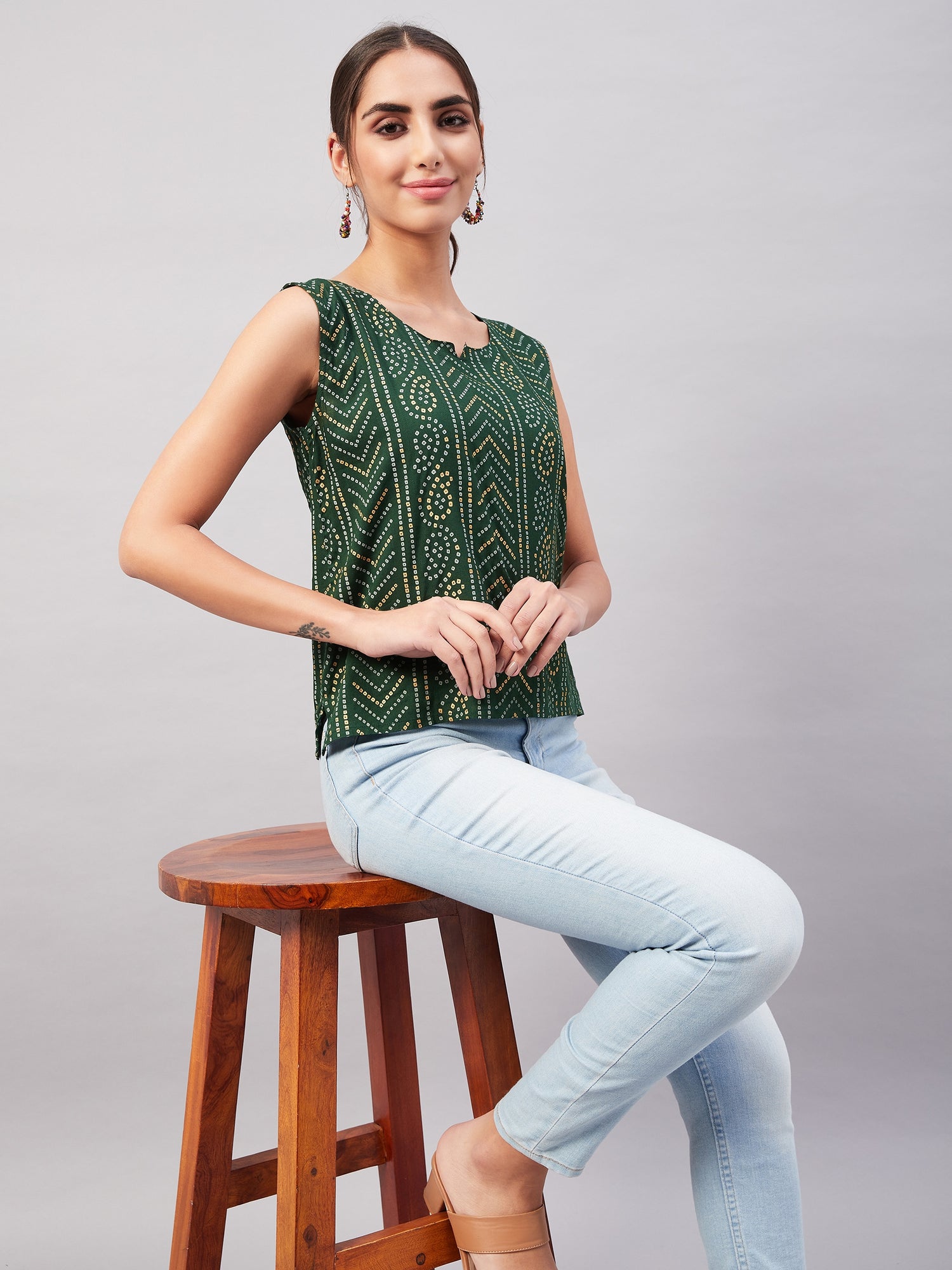 Look spick and span by dolling up yourself in this turquoise blue coloured sleeveless top. This blouse can be paired with dark denim and hoops.