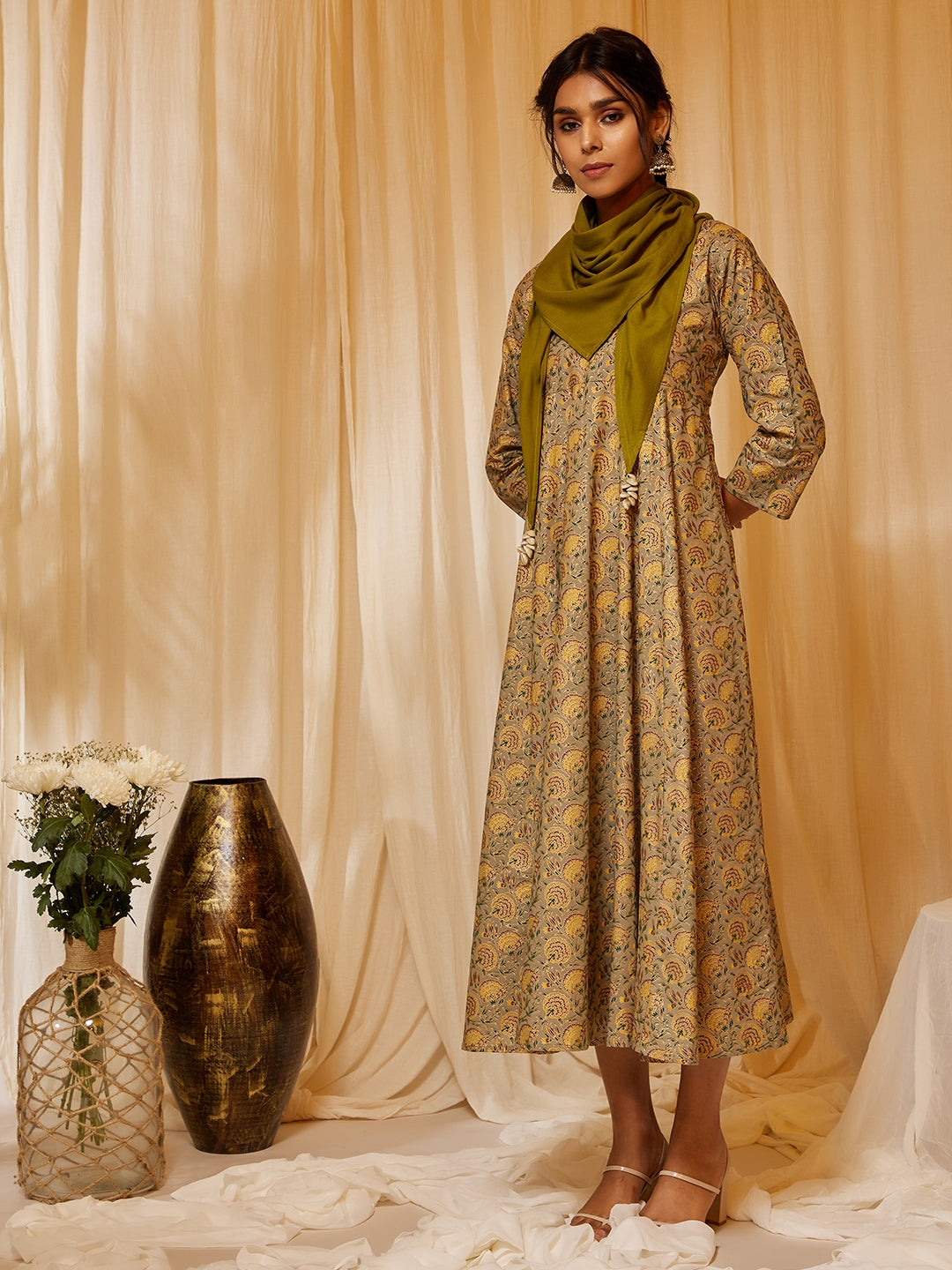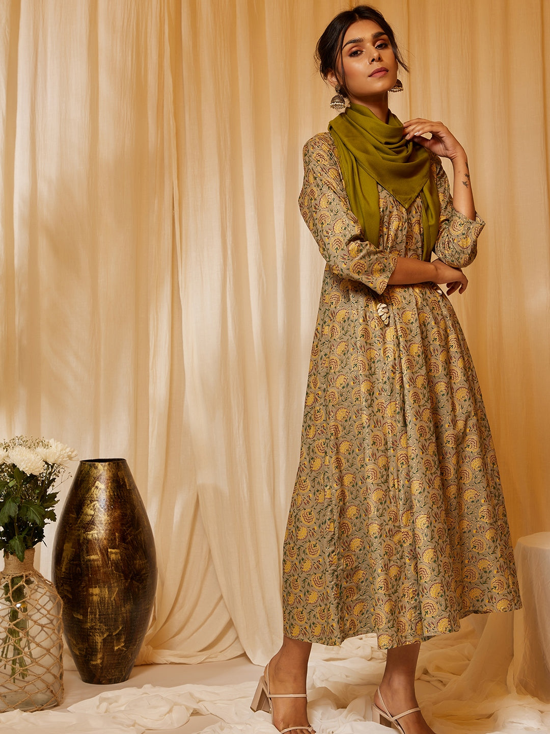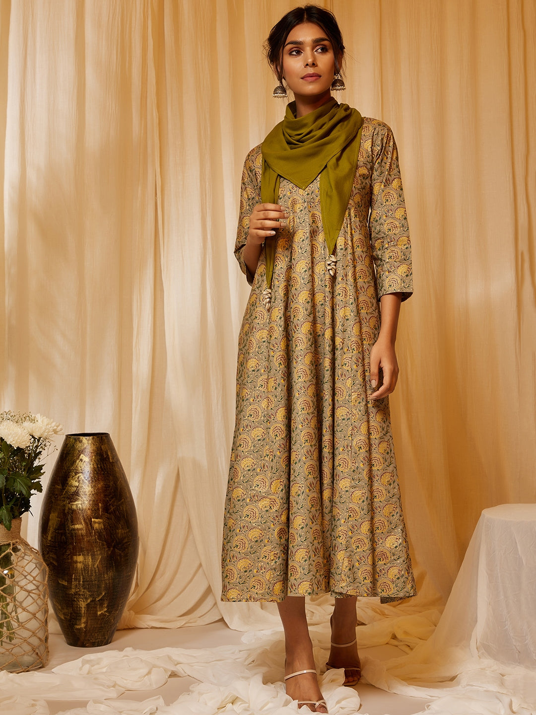 Make the most of this gorgeous dress flaunting a classic combination of white and gold. The white cotton printed Anarkali features gold Print all over with bright pop of pink added at the hem and the stole. The cold-shoulder sleeves make it stylish and eye-catching. This dress is super versatile and can be worn for casual outings and even occasions like mehendi, haldi, card party etc.