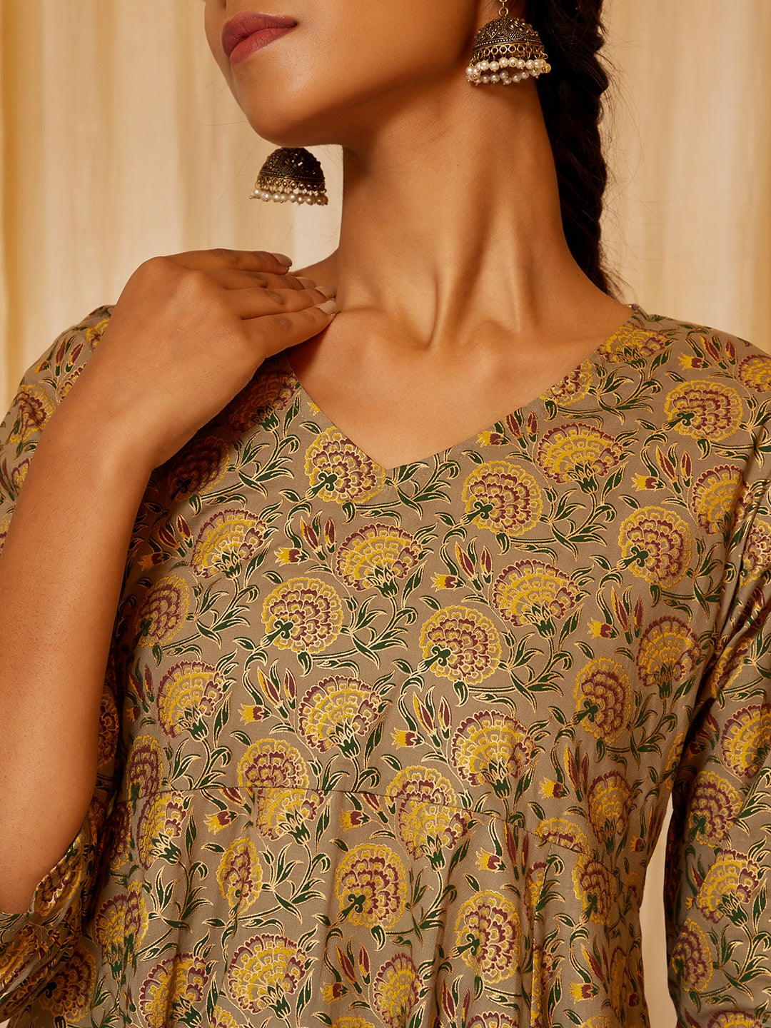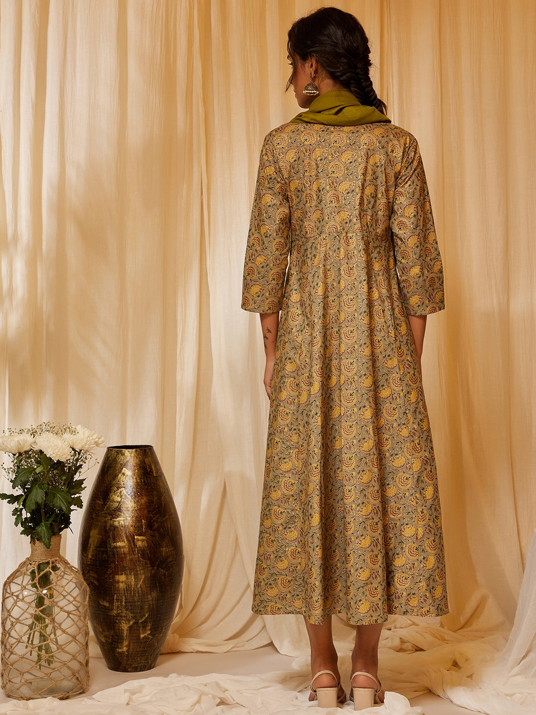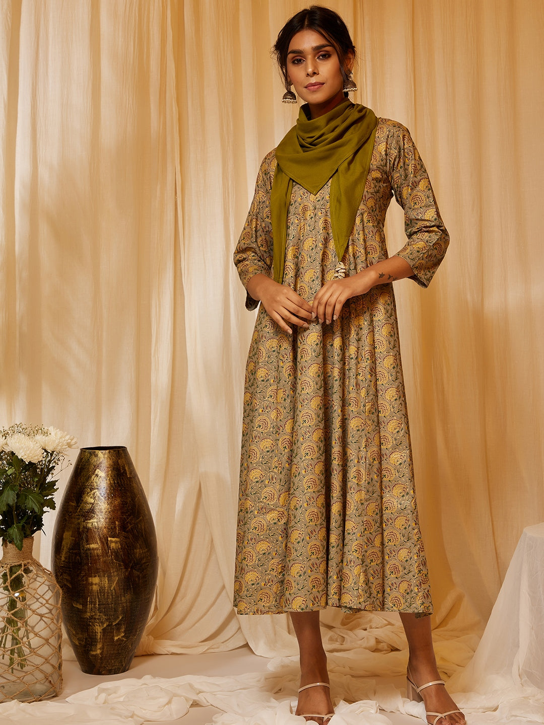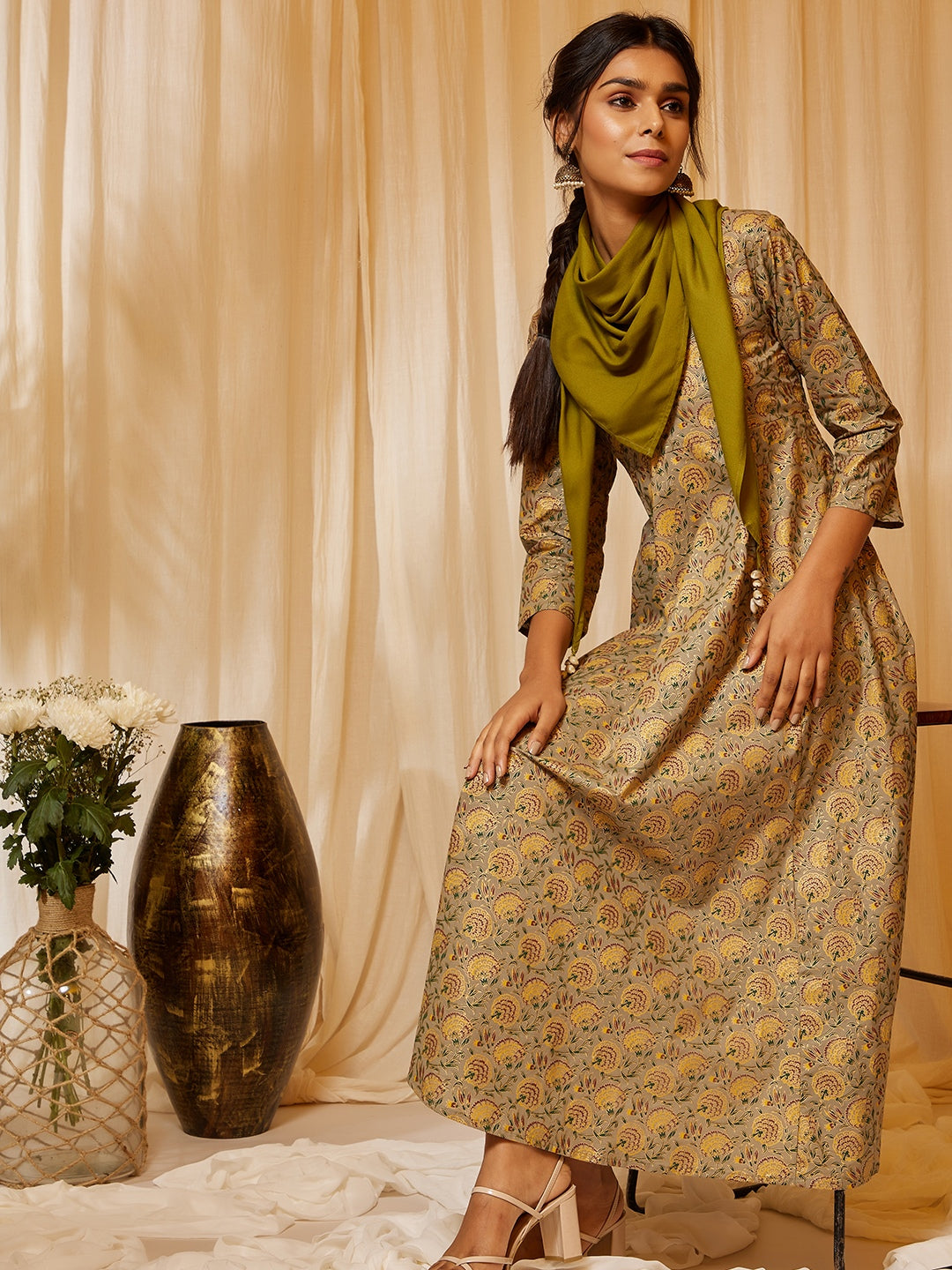 Make the most of this gorgeous dress flaunting a classic combination of white and gold. The white cotton printed Anarkali features gold Print all over with bright pop of pink added at the hem and the stole. The cold-shoulder sleeves make it stylish and eye-catching. This dress is super versatile and can be worn for casual outings and even occasions like mehendi, haldi, card party etc.