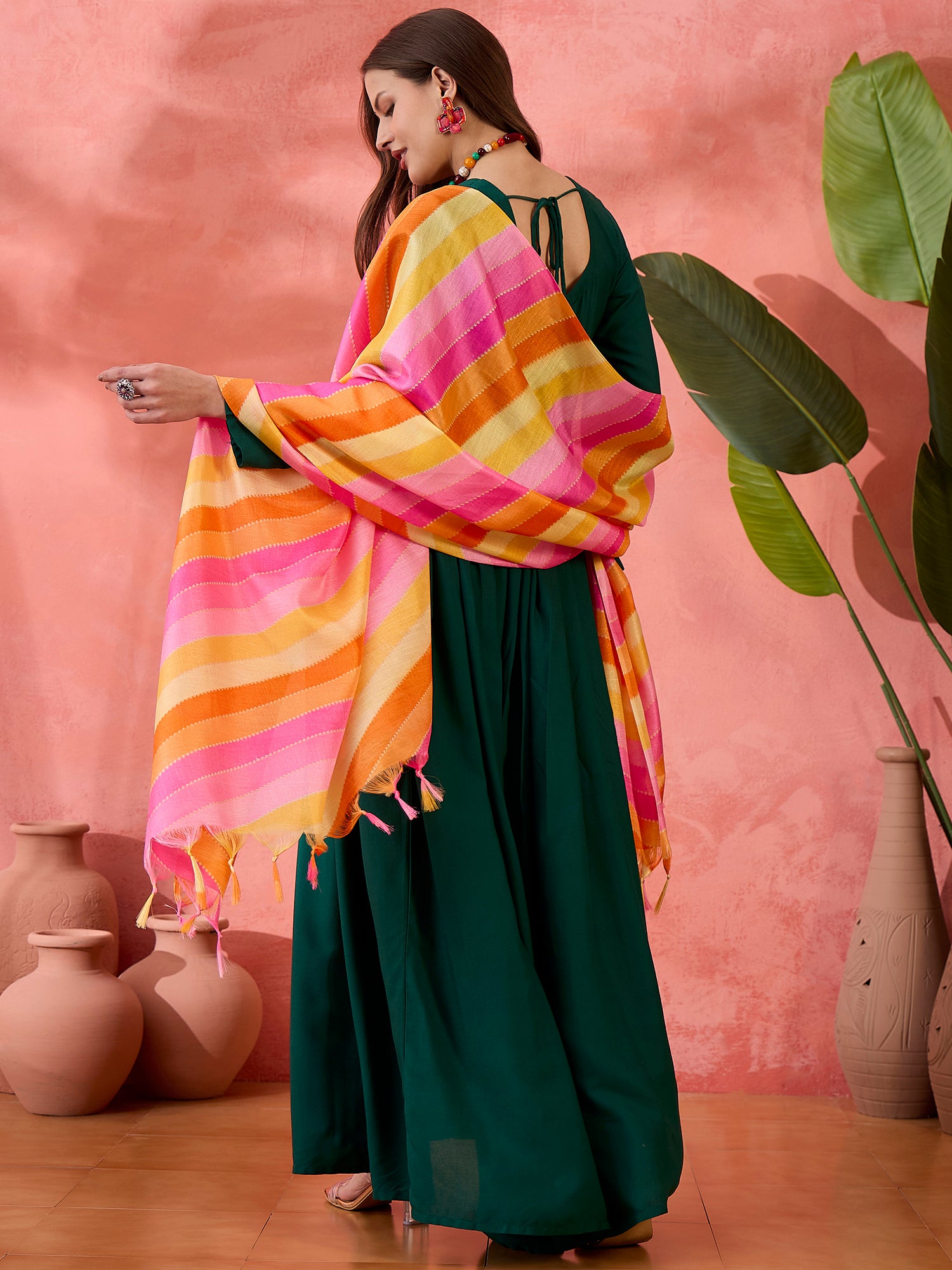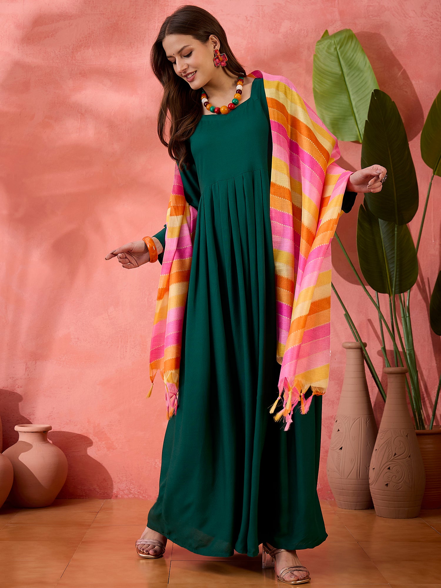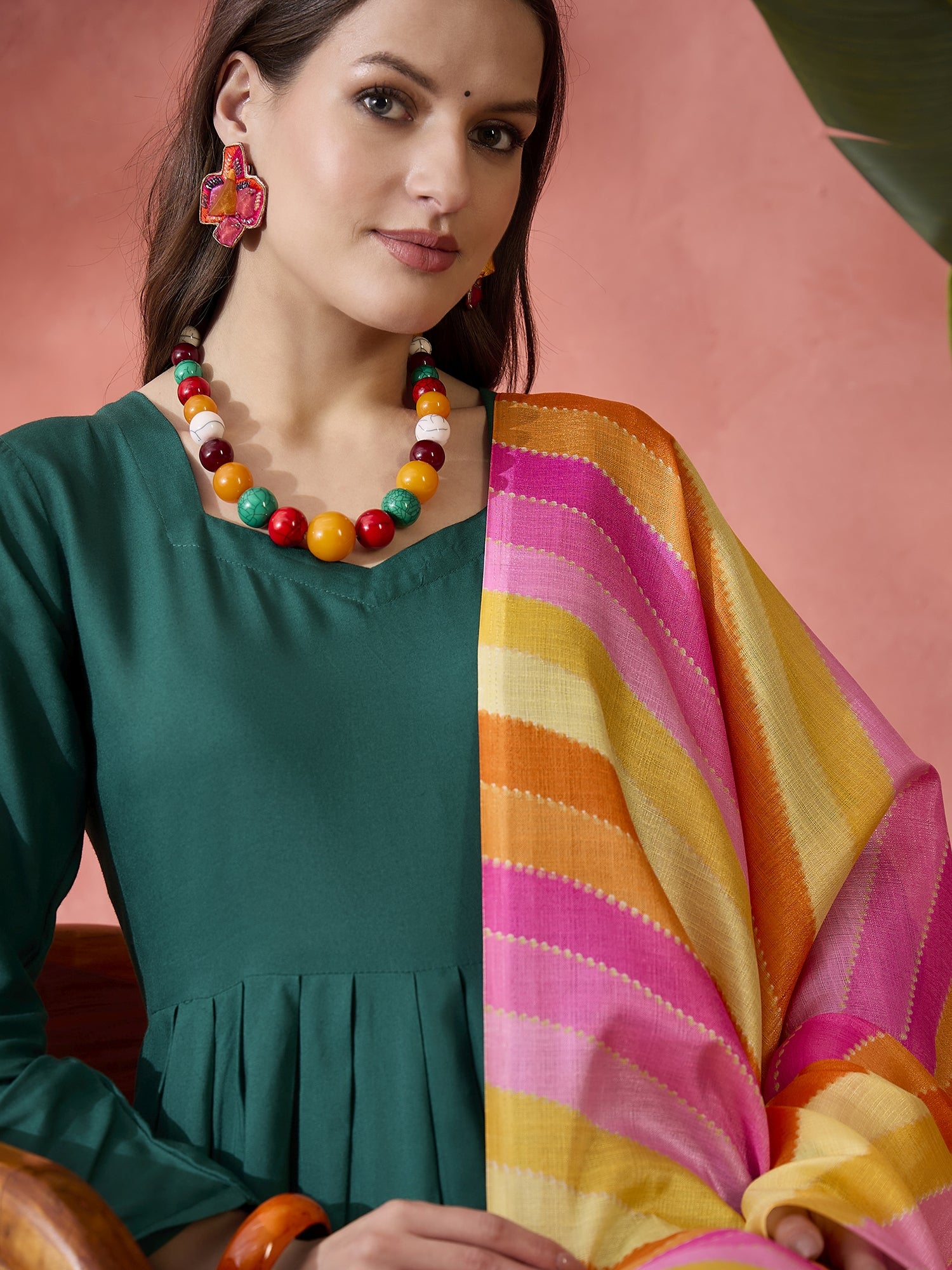 This charming green sweetheart kurta is crafted from soft fabric that ensures comfort and style. Paired with the dupatta, which features an elegant blend of colors and patterns, it creates a sophisticated and timeless look. Fabric - Rayon Dupatta - Faux Silk