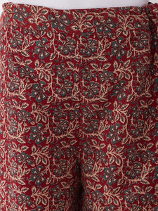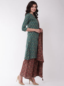 Mesmerise your peers by donning in this green and maroon kurta set. Complement this beauty with Chaand baalis.