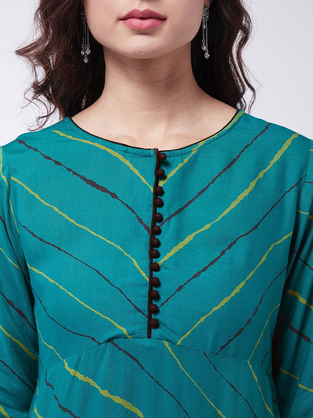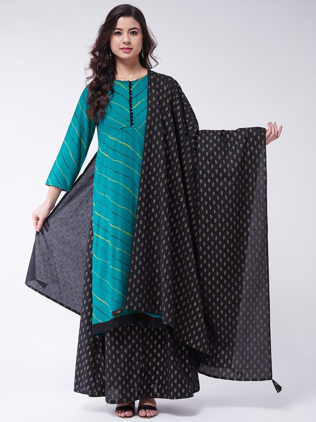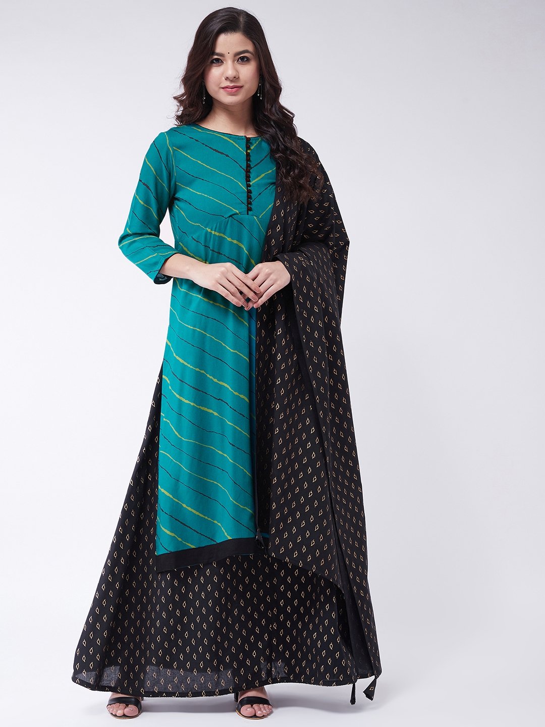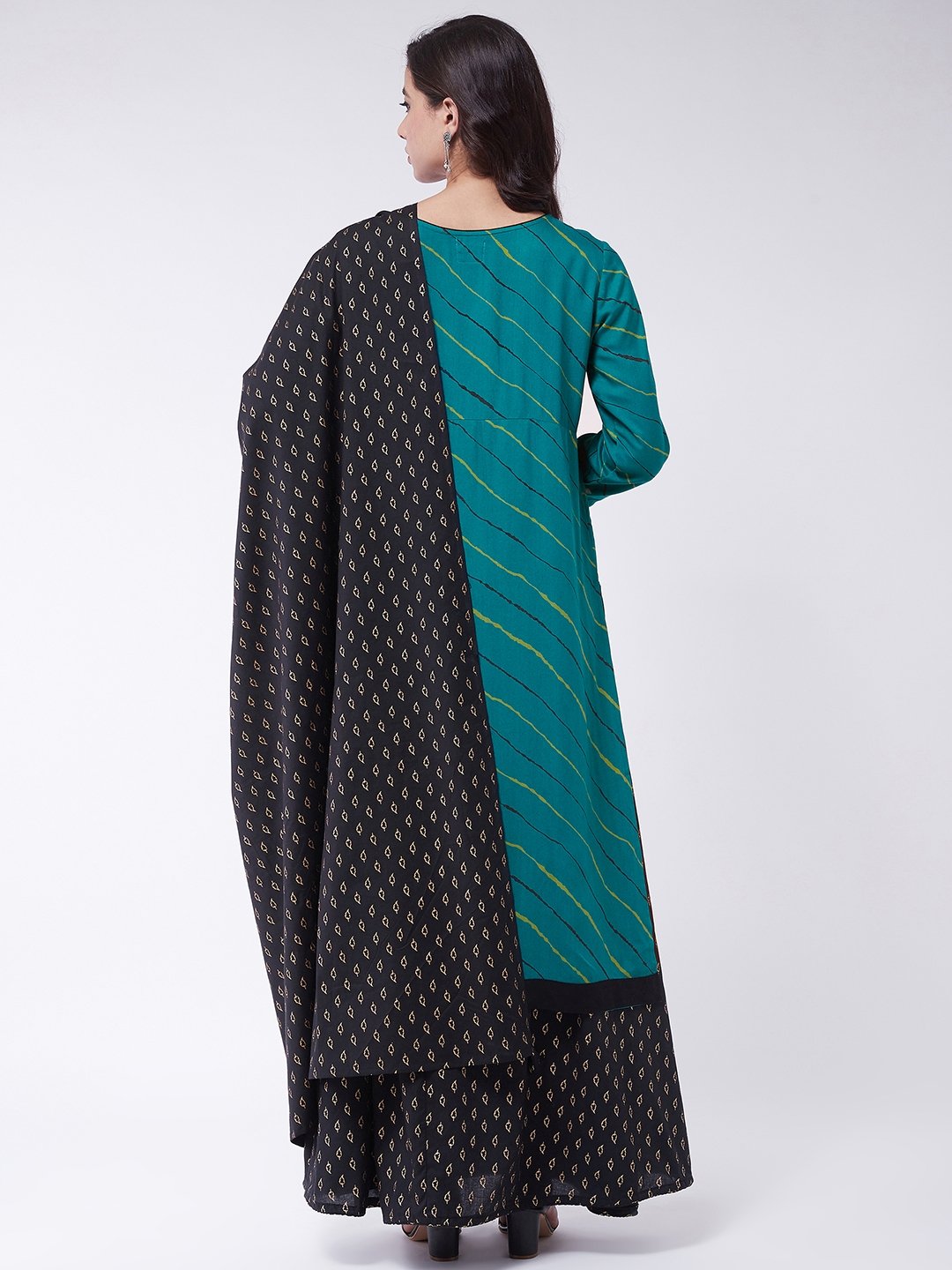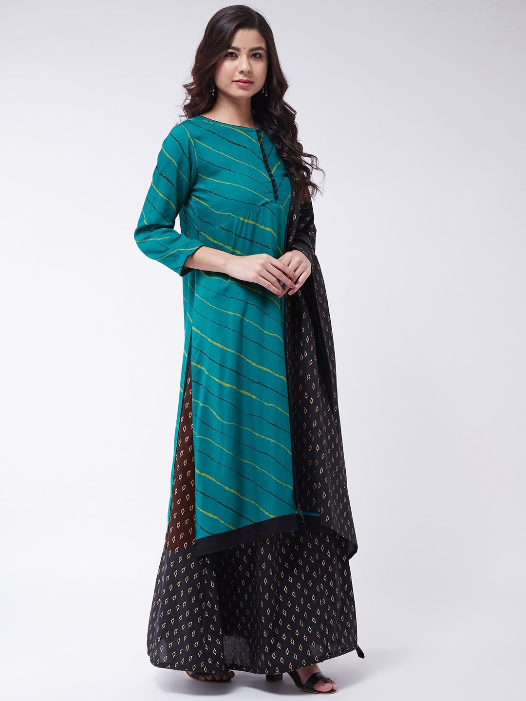 A perfect combination of comfort and sartorial pleasure, this green Leheriya kurta skirt set with dupatta is a must have for you. Get it with gold jewellery and heels.