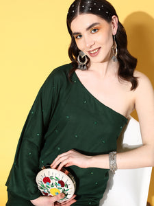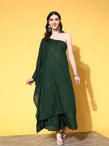 Placeholder Green Mirror Work One Shoulder Kurta Set - InWeave