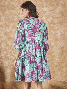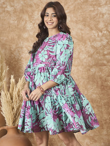 A fun and playful short dress featuring a bold green and purple print. Perfect for a lively, colorful addition to your wardrobe for daytime outings or casual events.