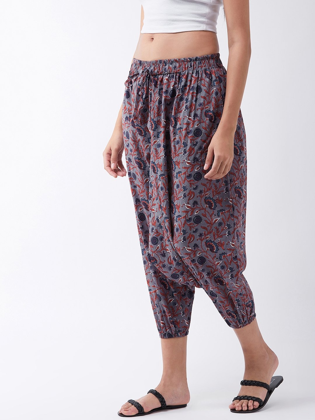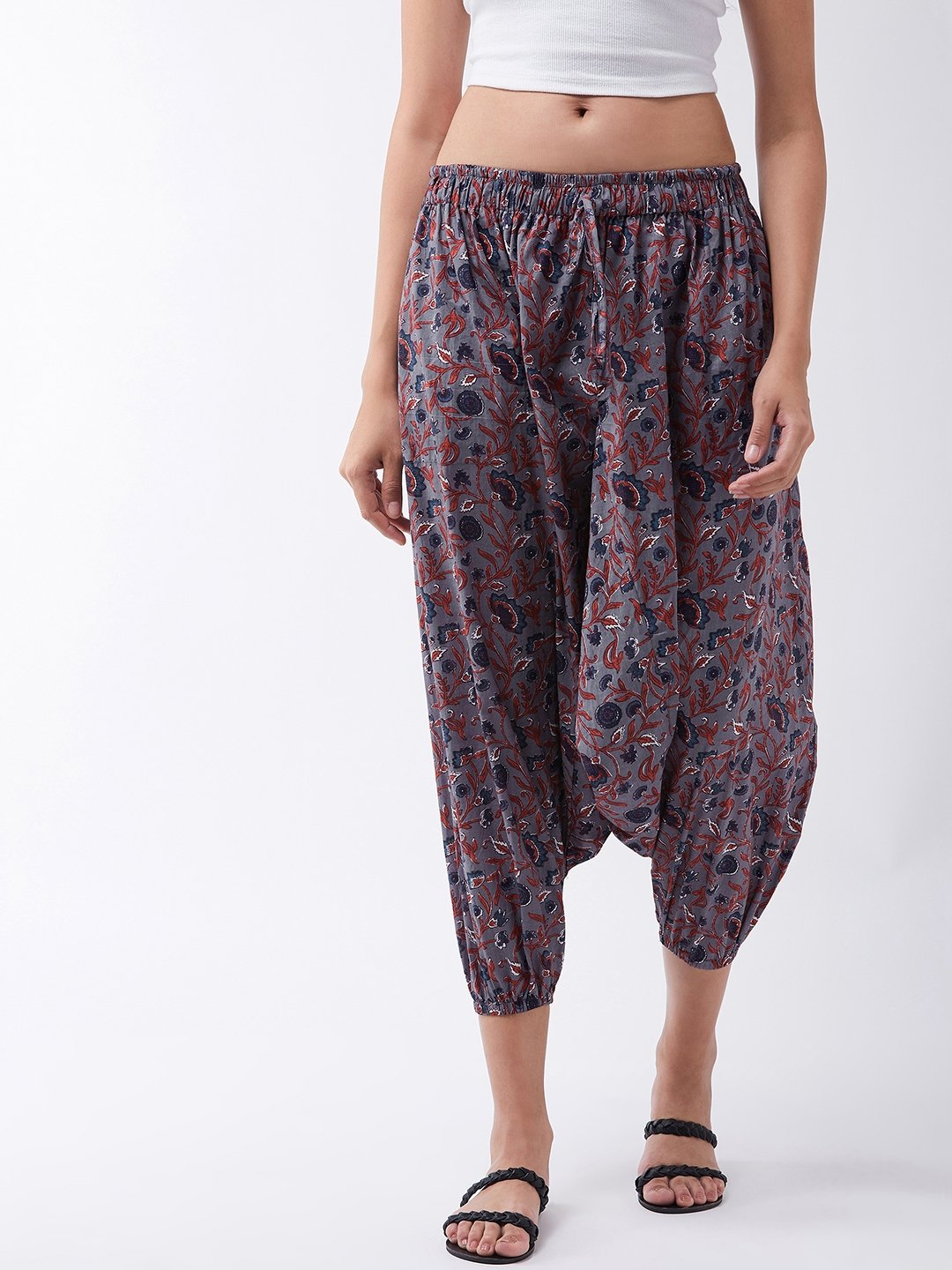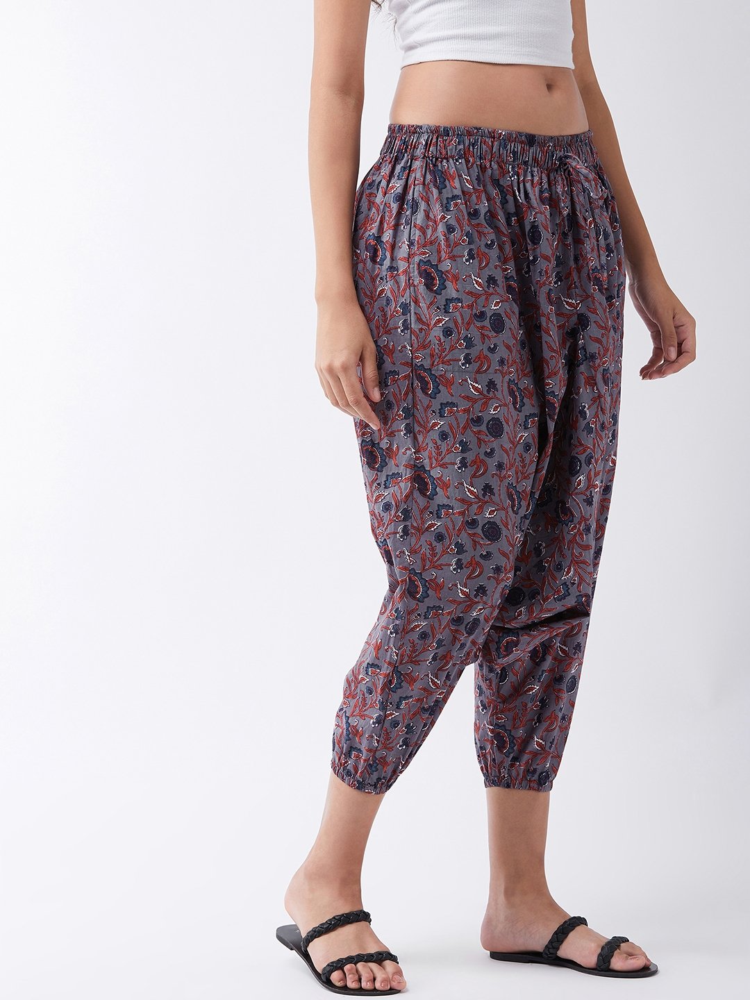 Give a new twist to your otherwise casual look with these grey and maroon Kalamkari printed harem pants. Wear it with short tanks tops and heels.